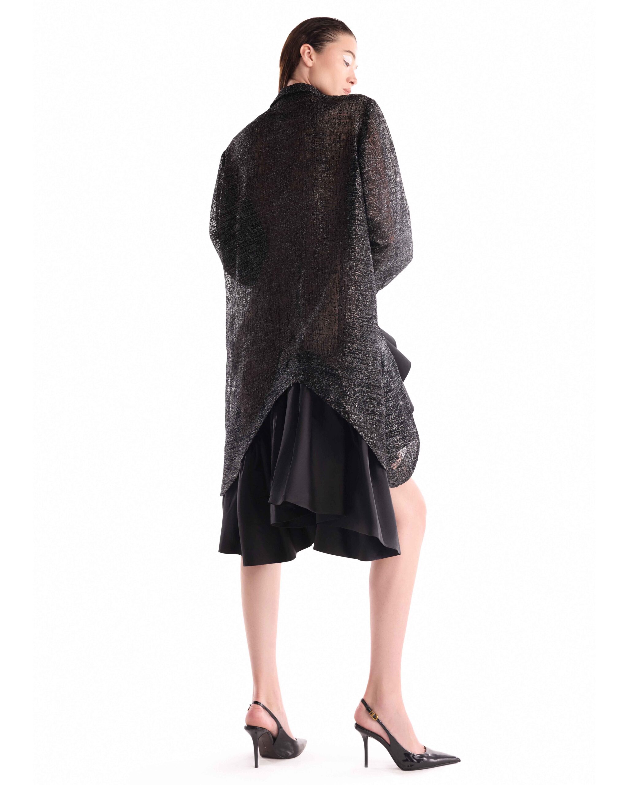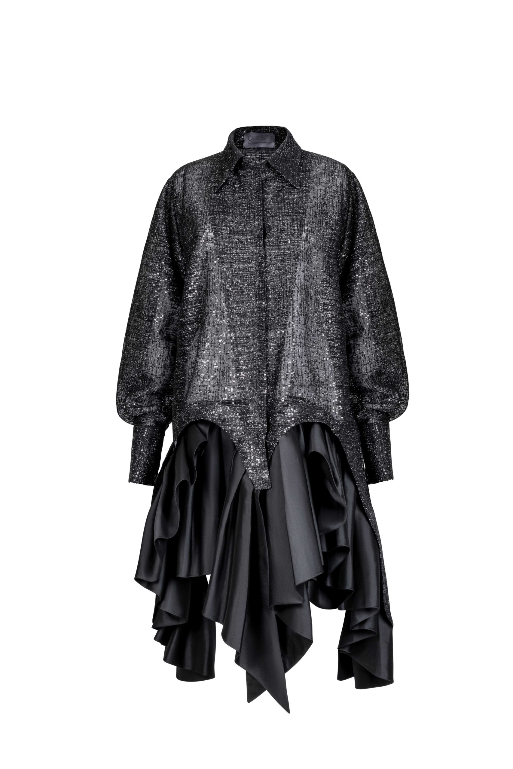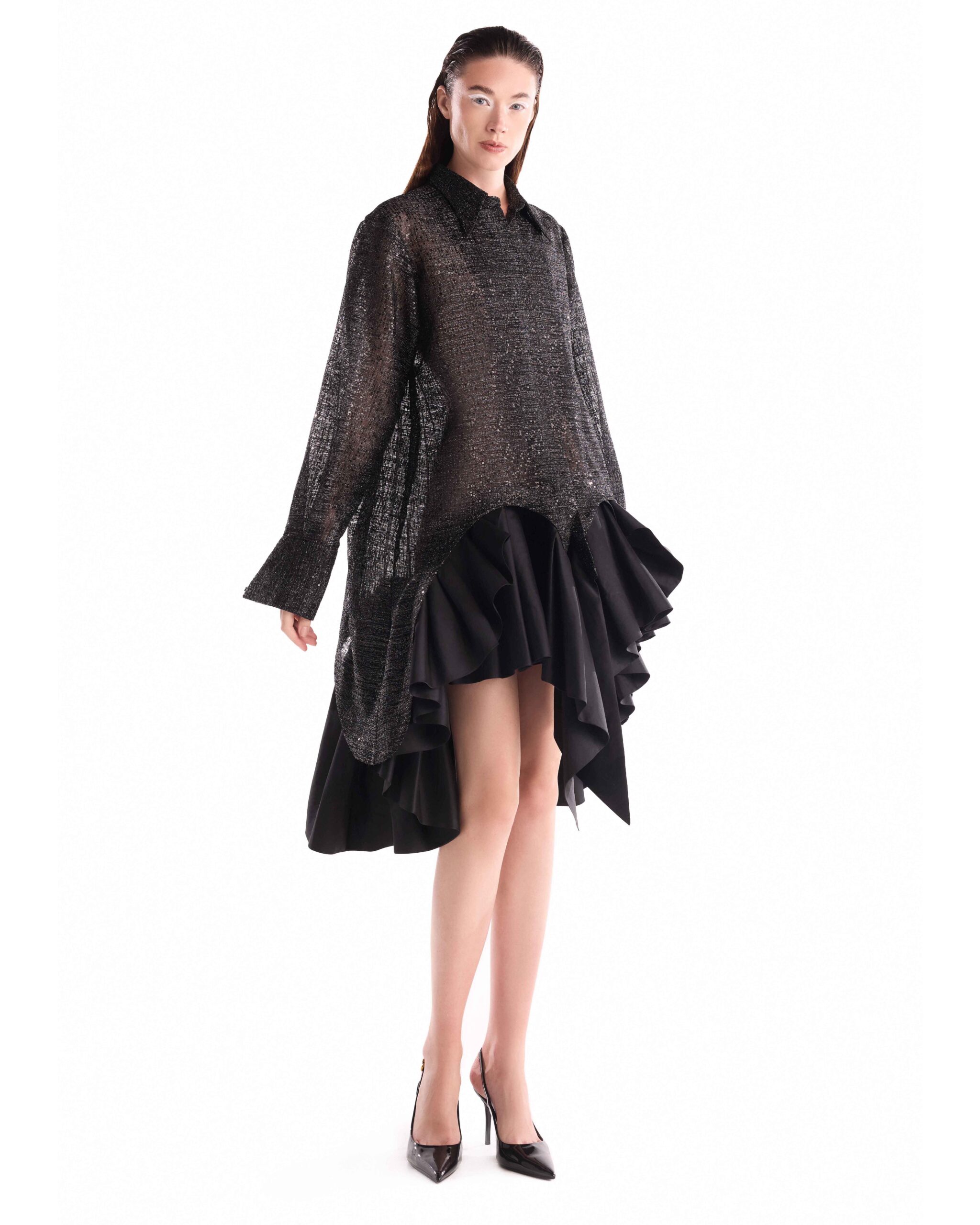 فستان من الدانتيل الشانتييه بنمط قميص من الدانتيل الشانتييه مزين بتنورة من التفتا المنحوتة وغير المتماثلة لتباين جريء في القوام.