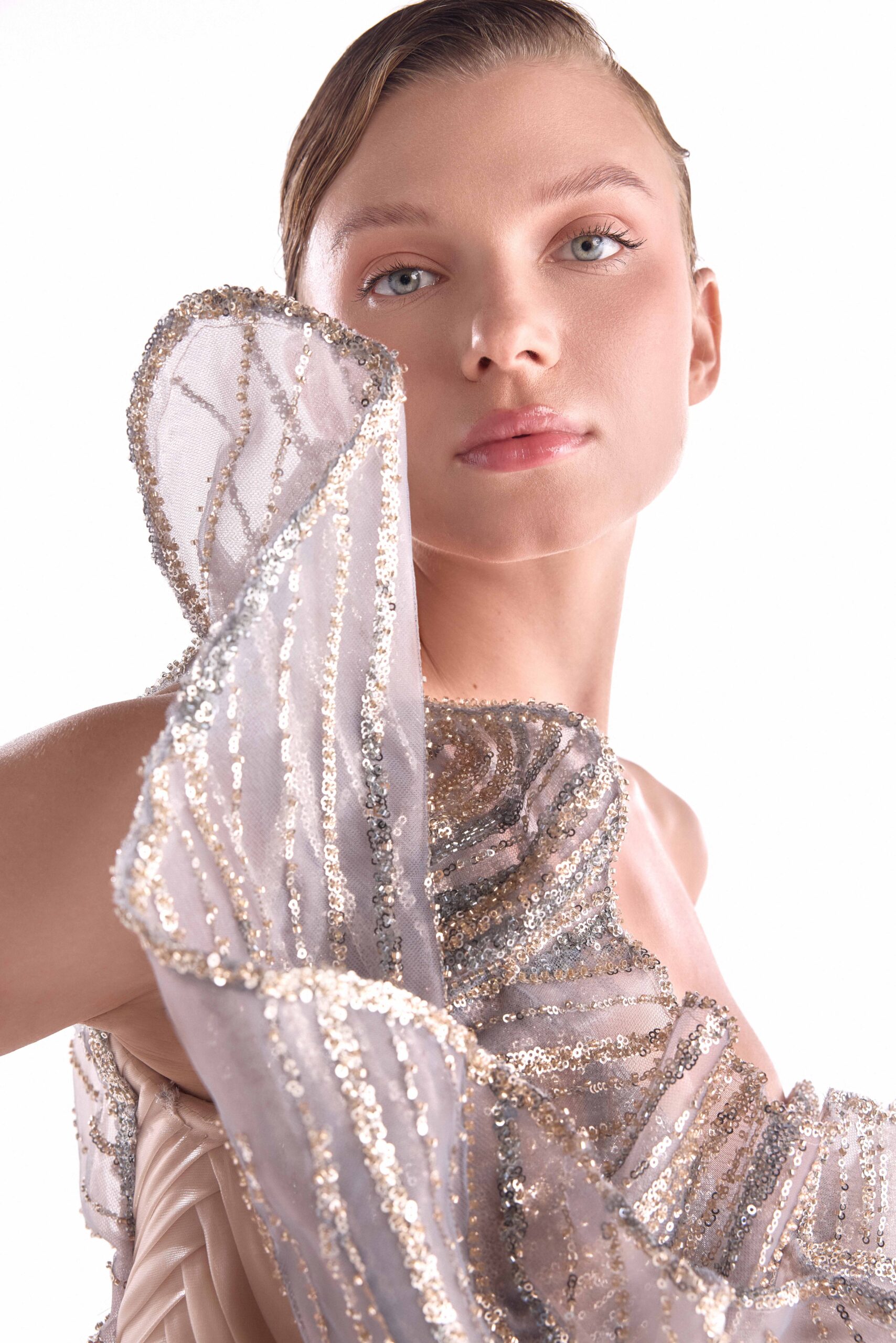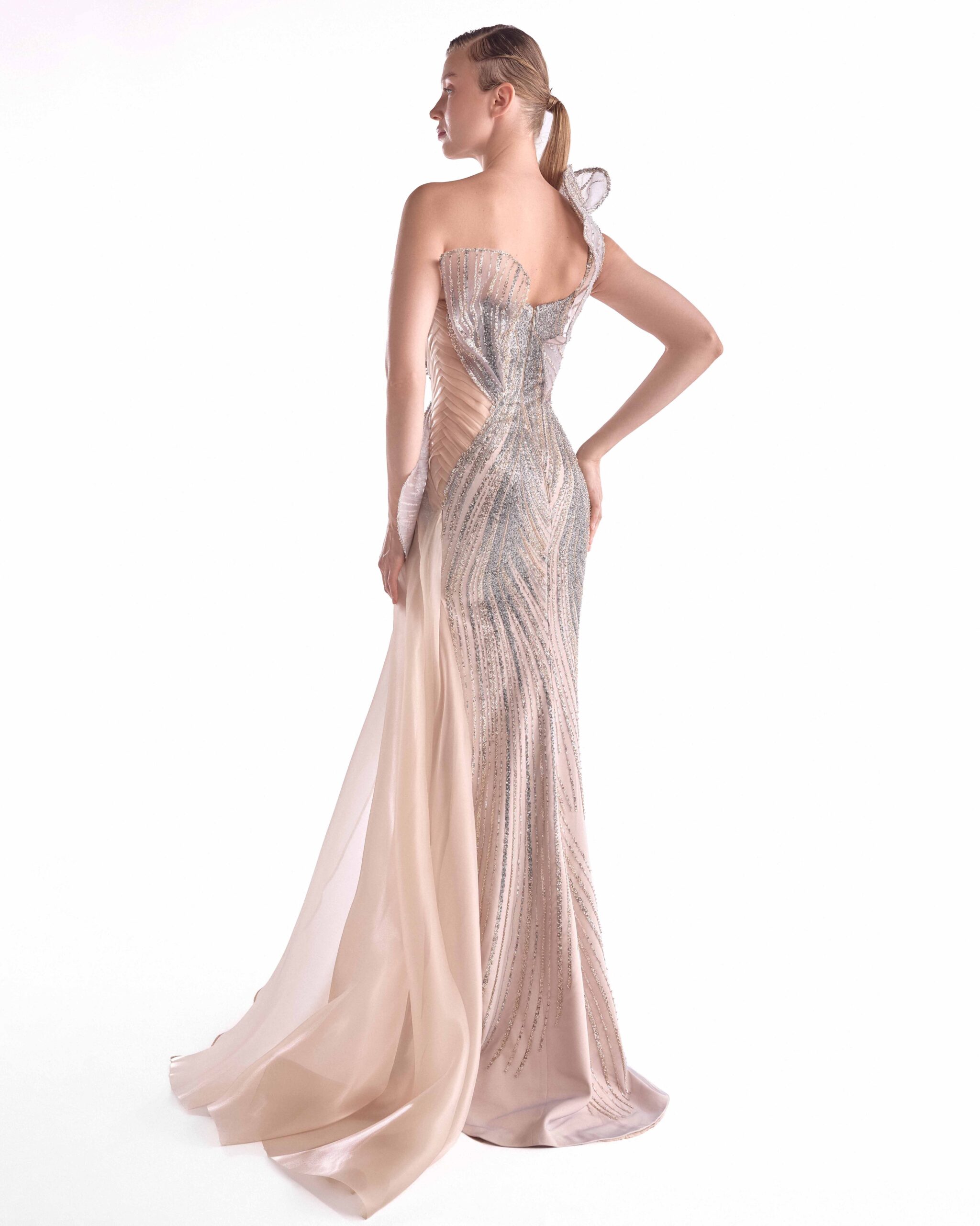 فستان دانتيل أنيق باللونين العاري والفضي مع فتحة صدر منحوتة بكتف واحد وشق عالٍ وذيل انسيابي من الأورجانزا. مصمم لإبهار الأناقة والحركة.