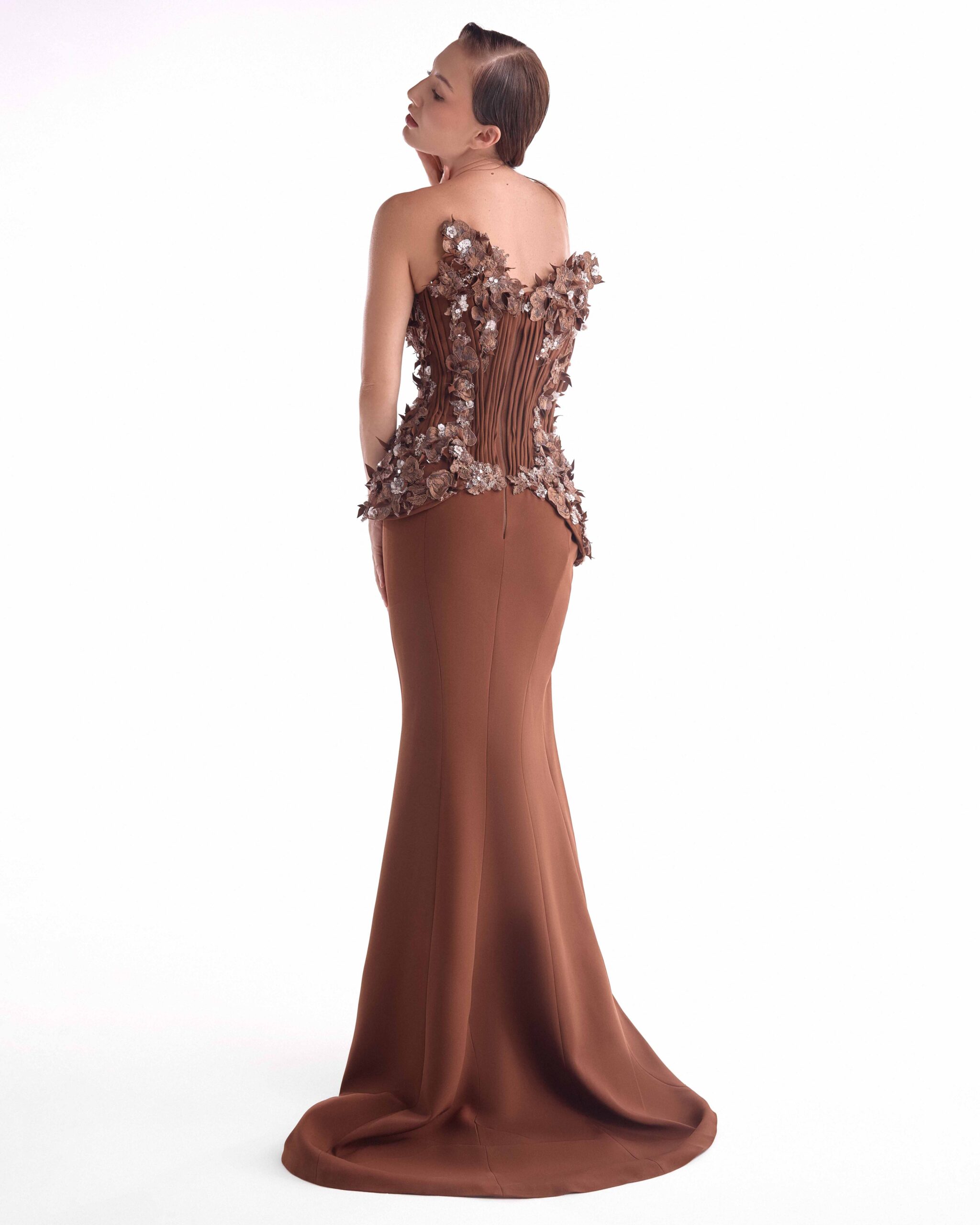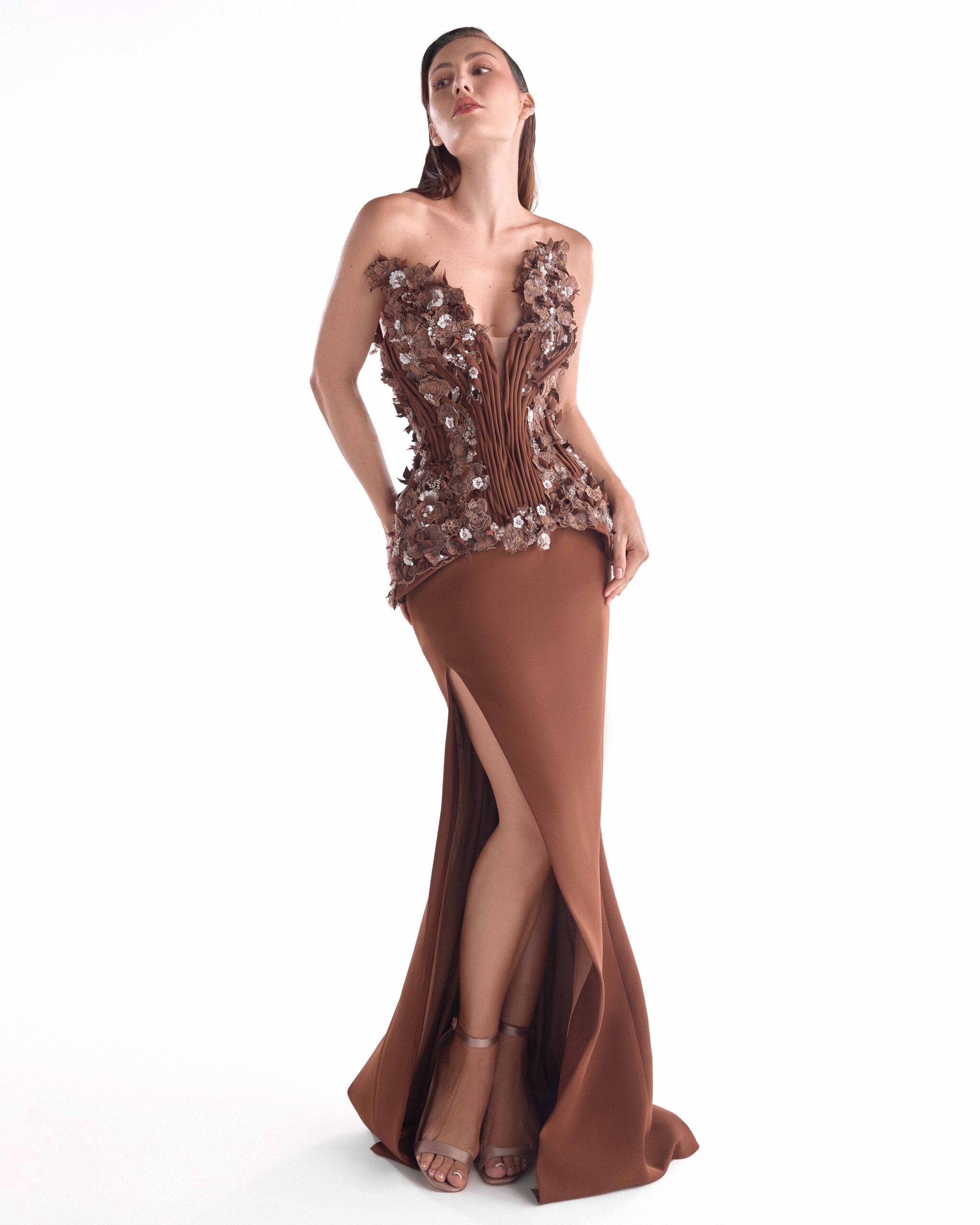 تألقي بفستان منحوت على شكل حرف V بني اللون منحوت على شكل حرف V بقصّة منحوتة على شكل خصر منحوتة ومزخرف بتطريزات زهور ثلاثية الأبعاد وشق عالٍ أنيق.