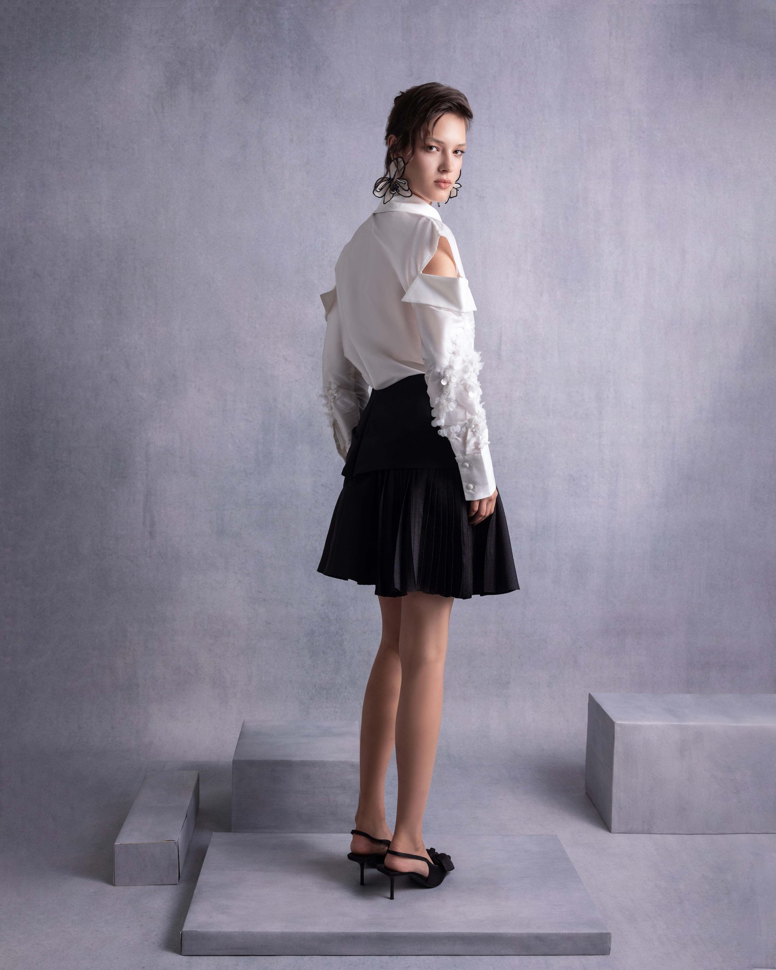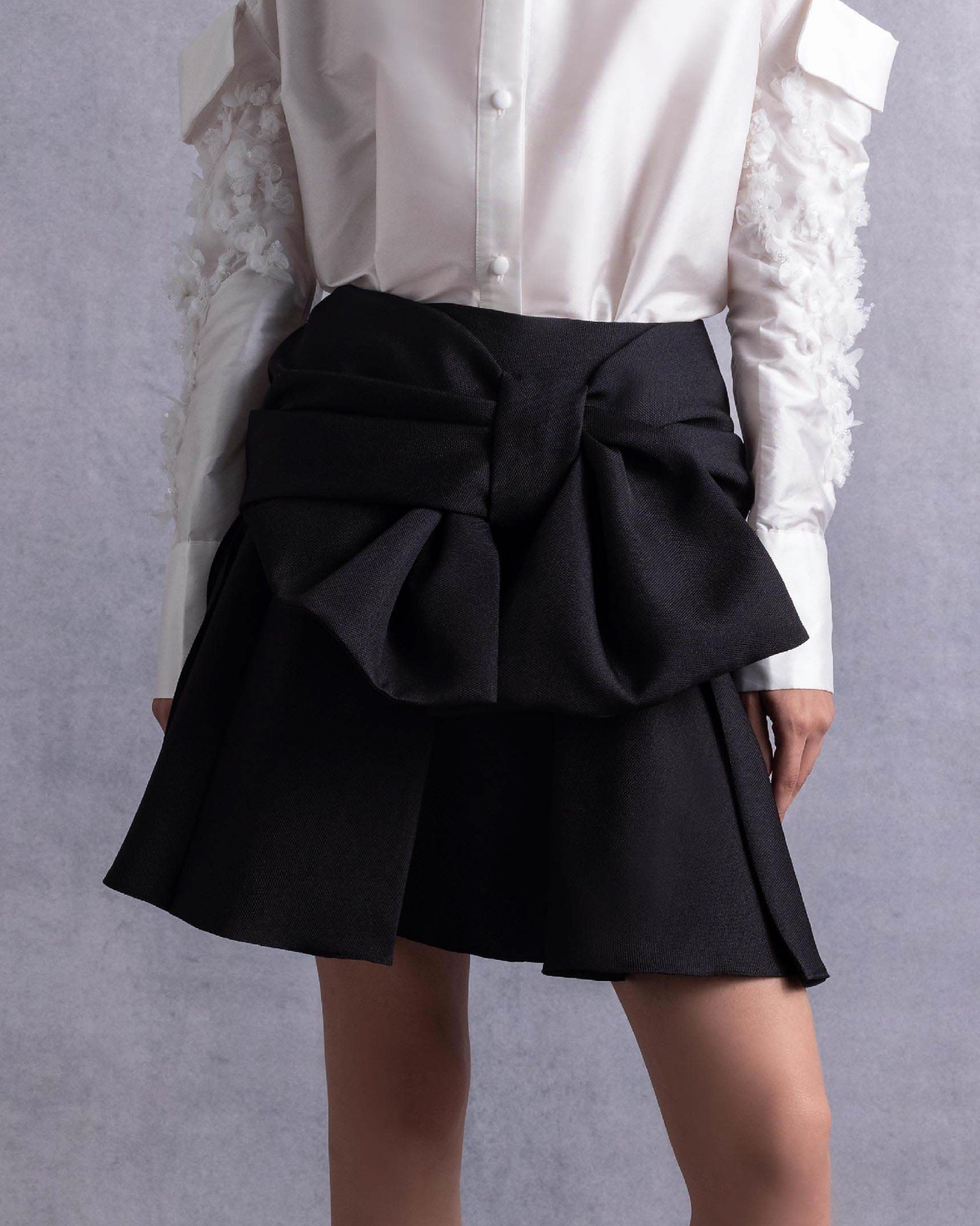 تنورة سوداء من البيكيه مع تقويسة أنيقة وقصّة واسعة لإطلالة مسائية راقية.