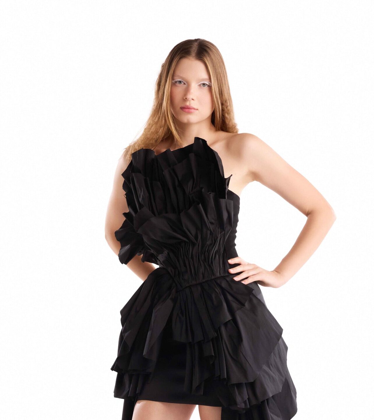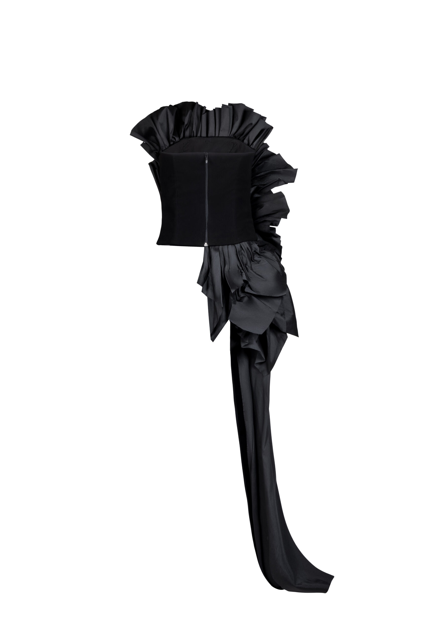 Introducing a statement of sculptural romance, this taffeta top features voluminous ruffles and a cinched waist fit.
