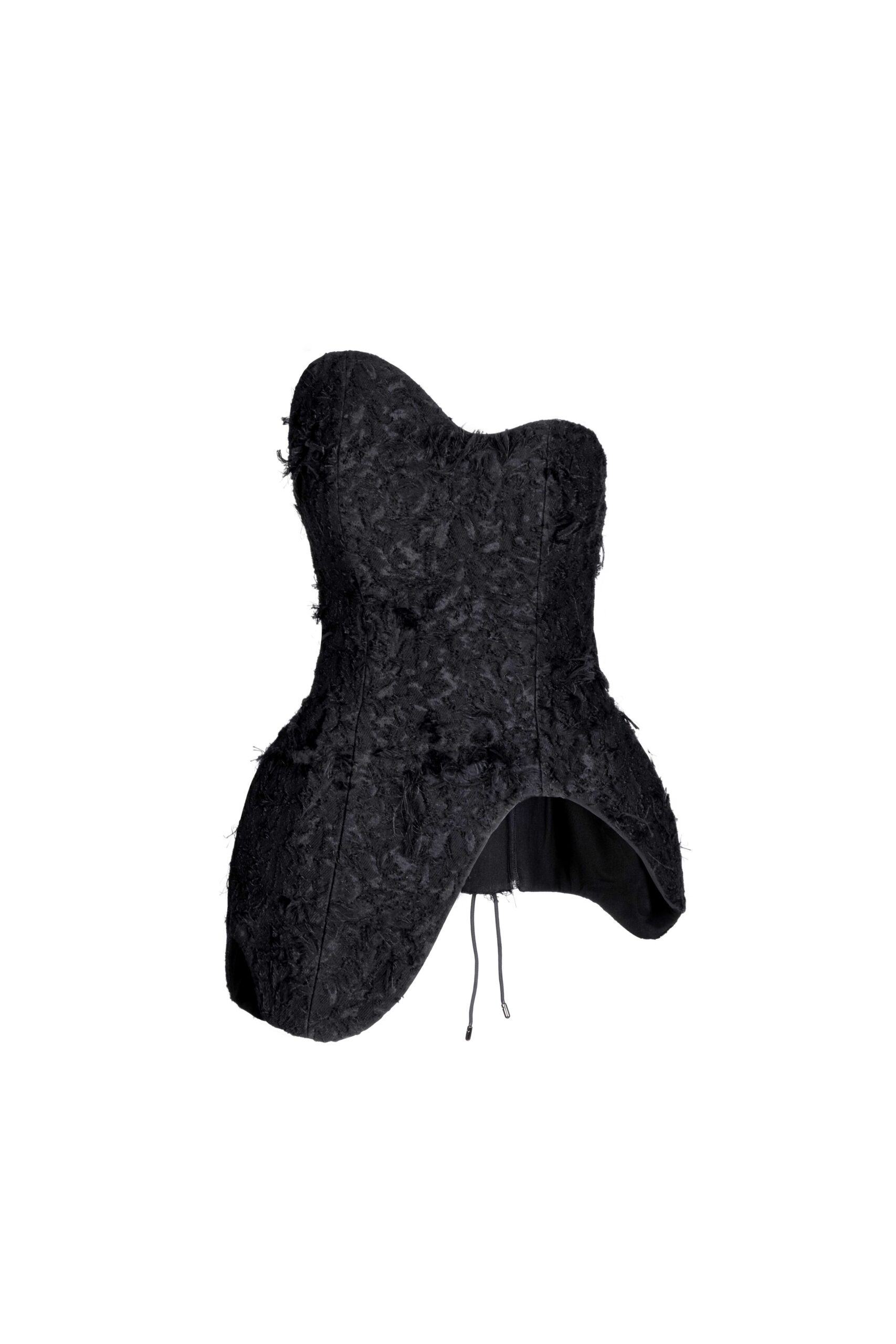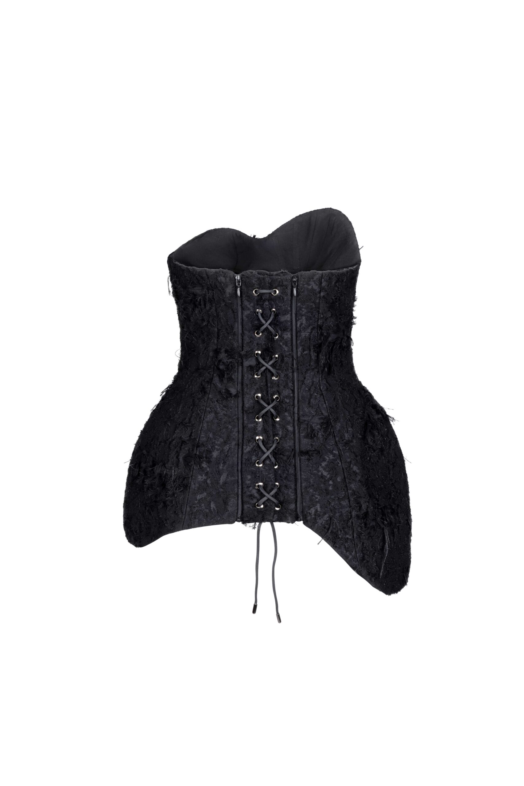 Strapless asysymetric black jacquard corset top with a sculpted fit and refined textured finish.