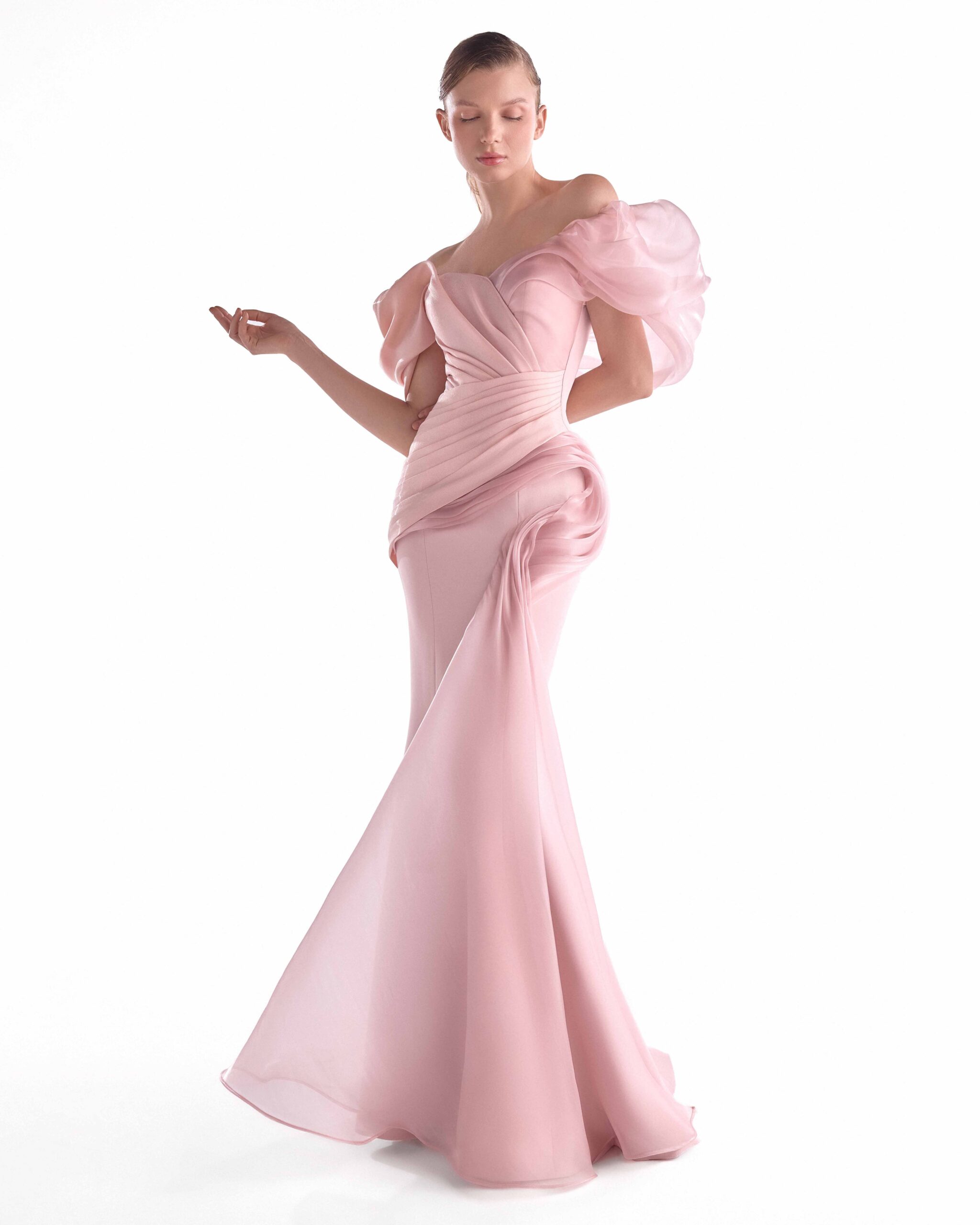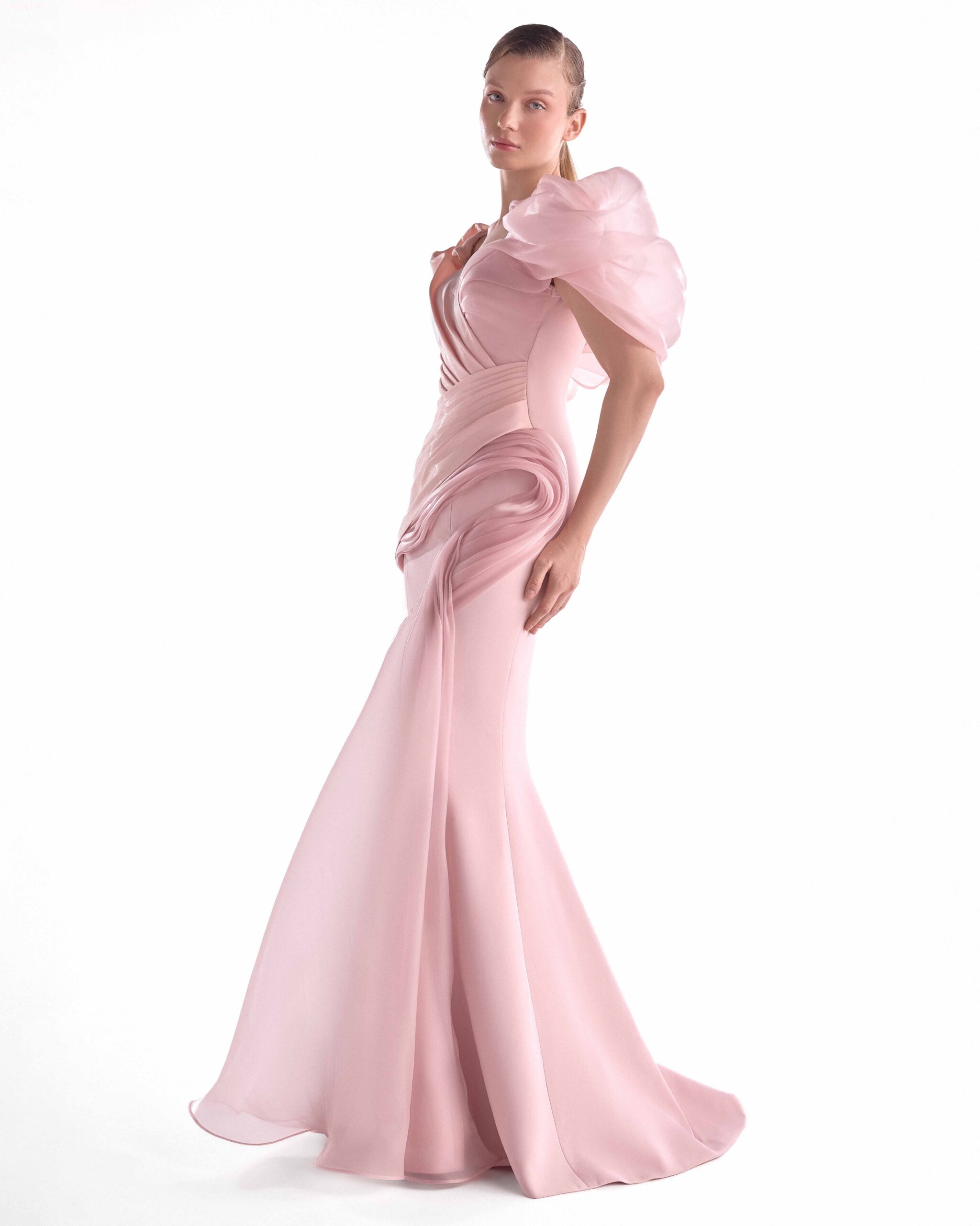 Soft pink crepe mermaid gown with asymmetrical organza shoulders, blending technical structure and fluid drape for an elegant, sculptural finish.