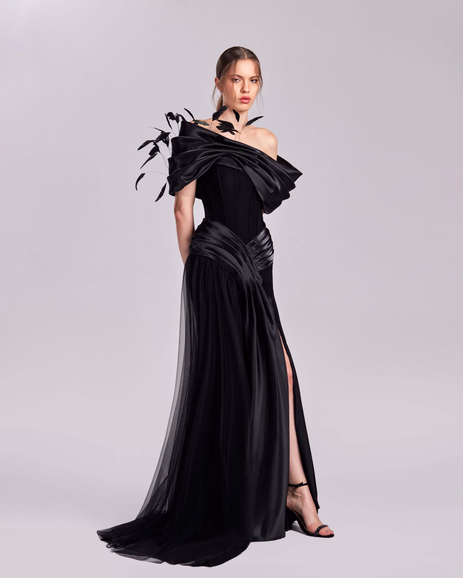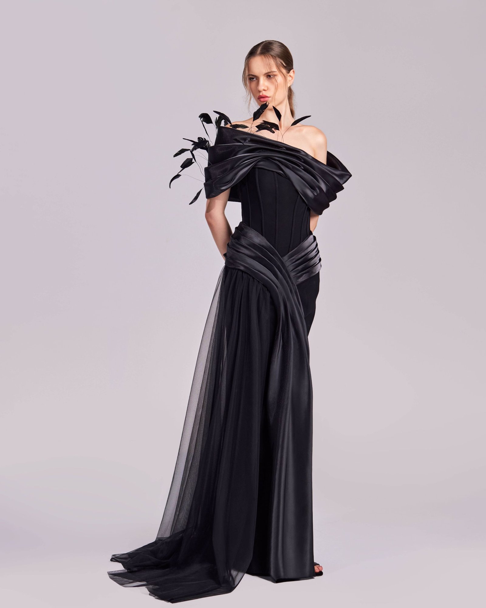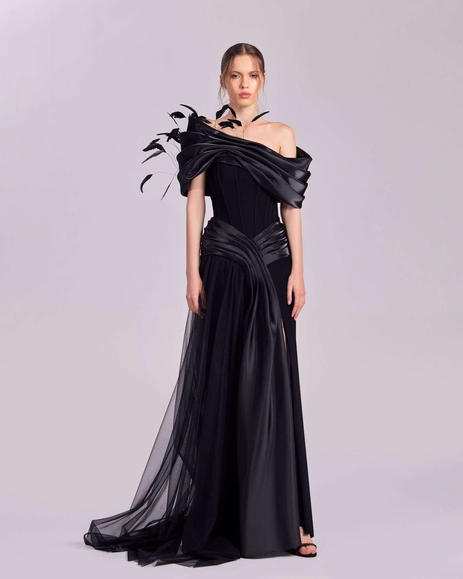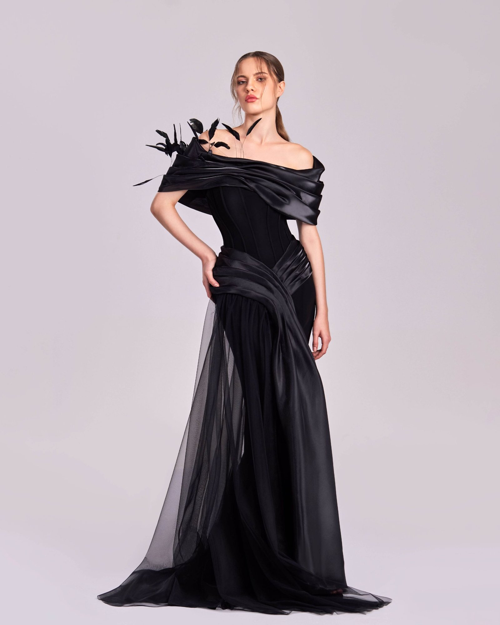 Stun in this black gown featuring an off-shoulder design, corset bodice, and feathered details.