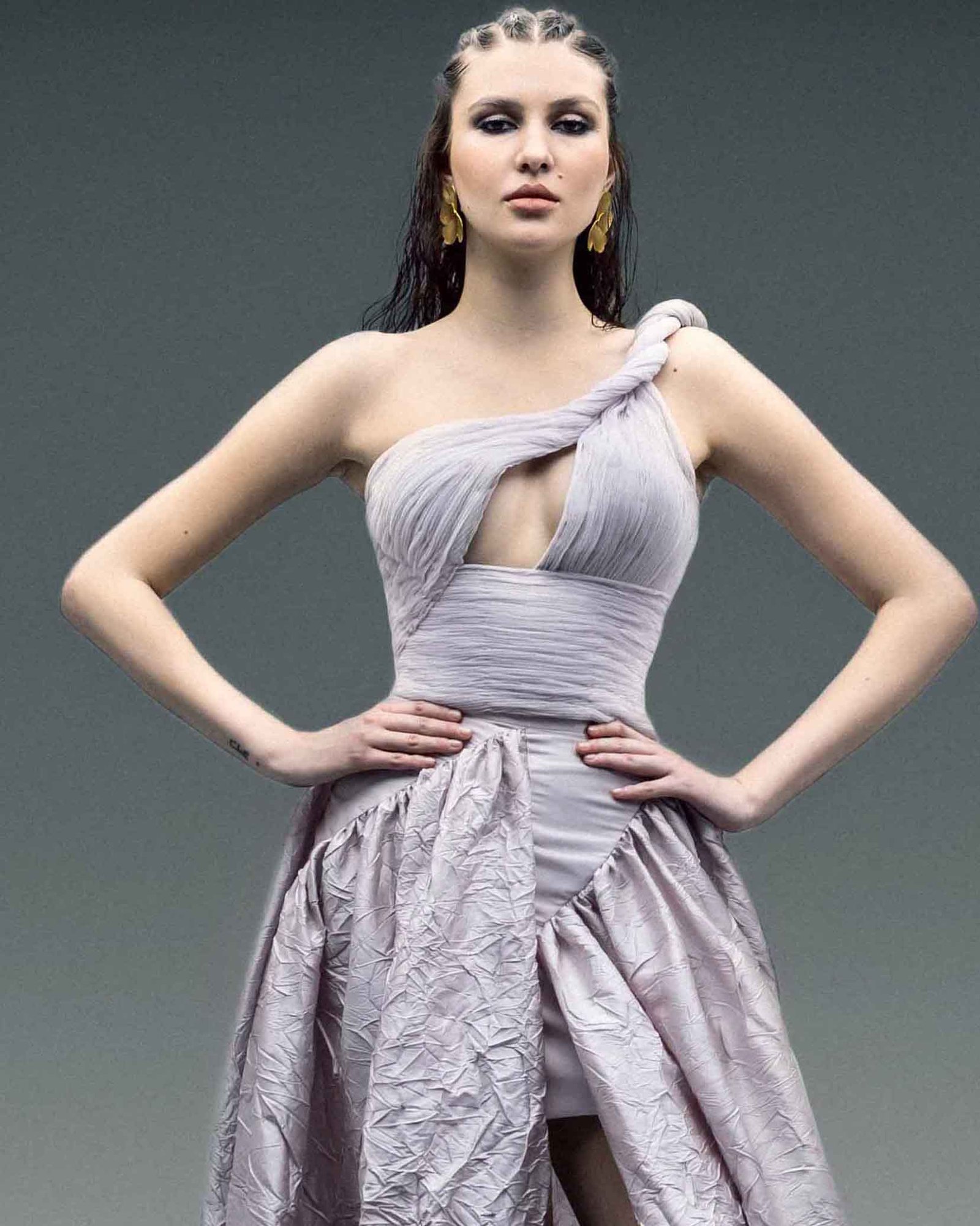 Sculpted one-shoulder lamé organza top with a braided strap and an elegant bust cut-out. Feminine, daring, and refined.