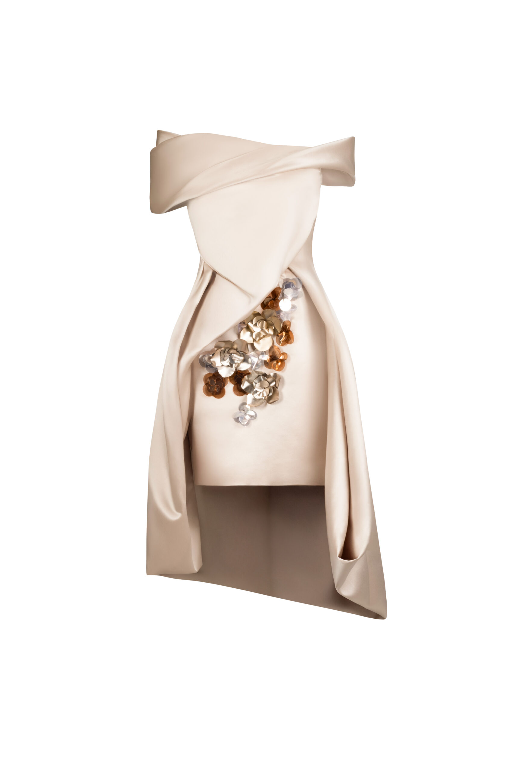 Champagne razmir satin dress featuring an off-shoulder neckline, sculpted waist, and floral appliqués with an asymmetric draped finish.