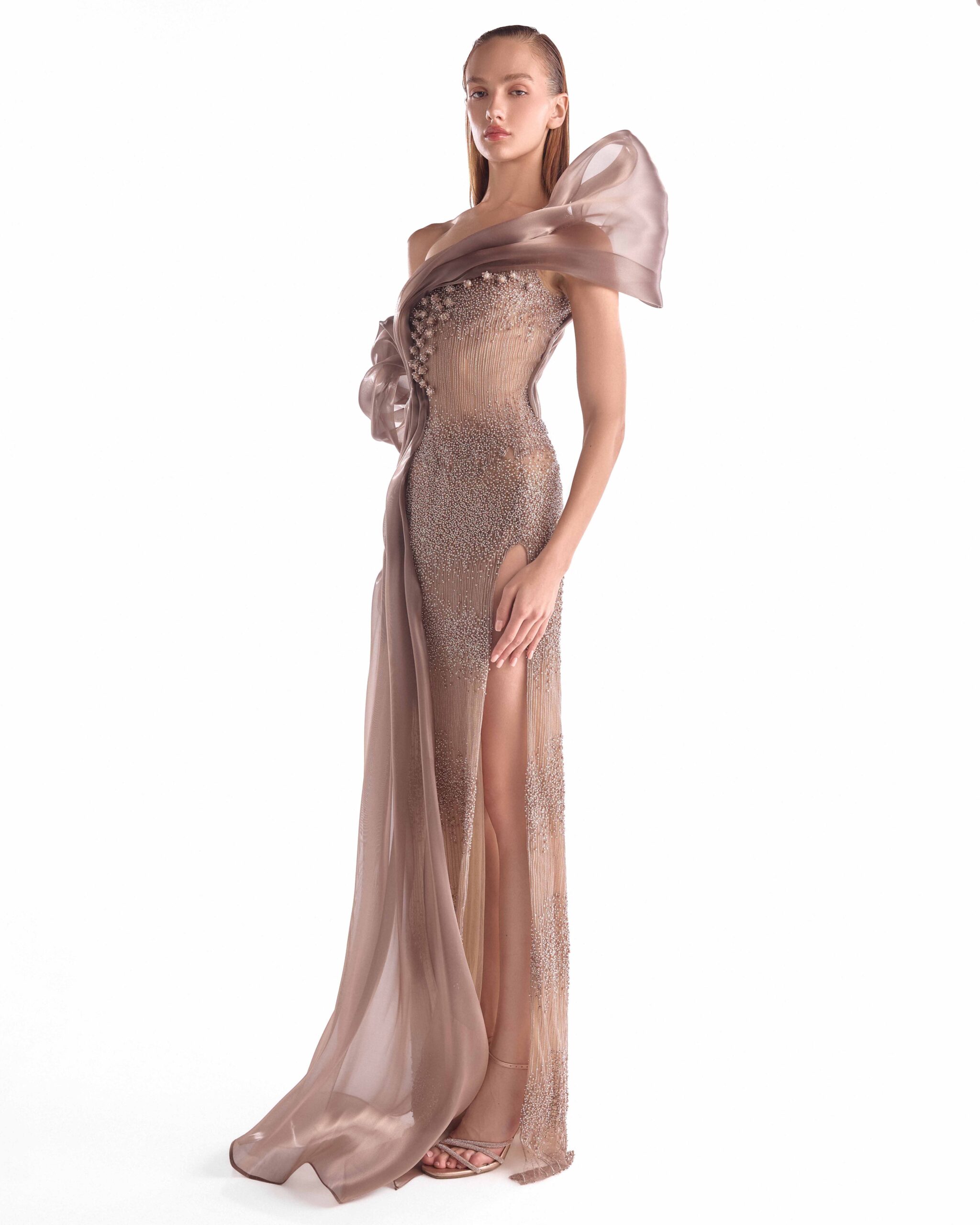 A one-shoulder brown illusion gown featuring pearl-embellished lace, crystal detailing, and fluid organza draping with a graceful side train.