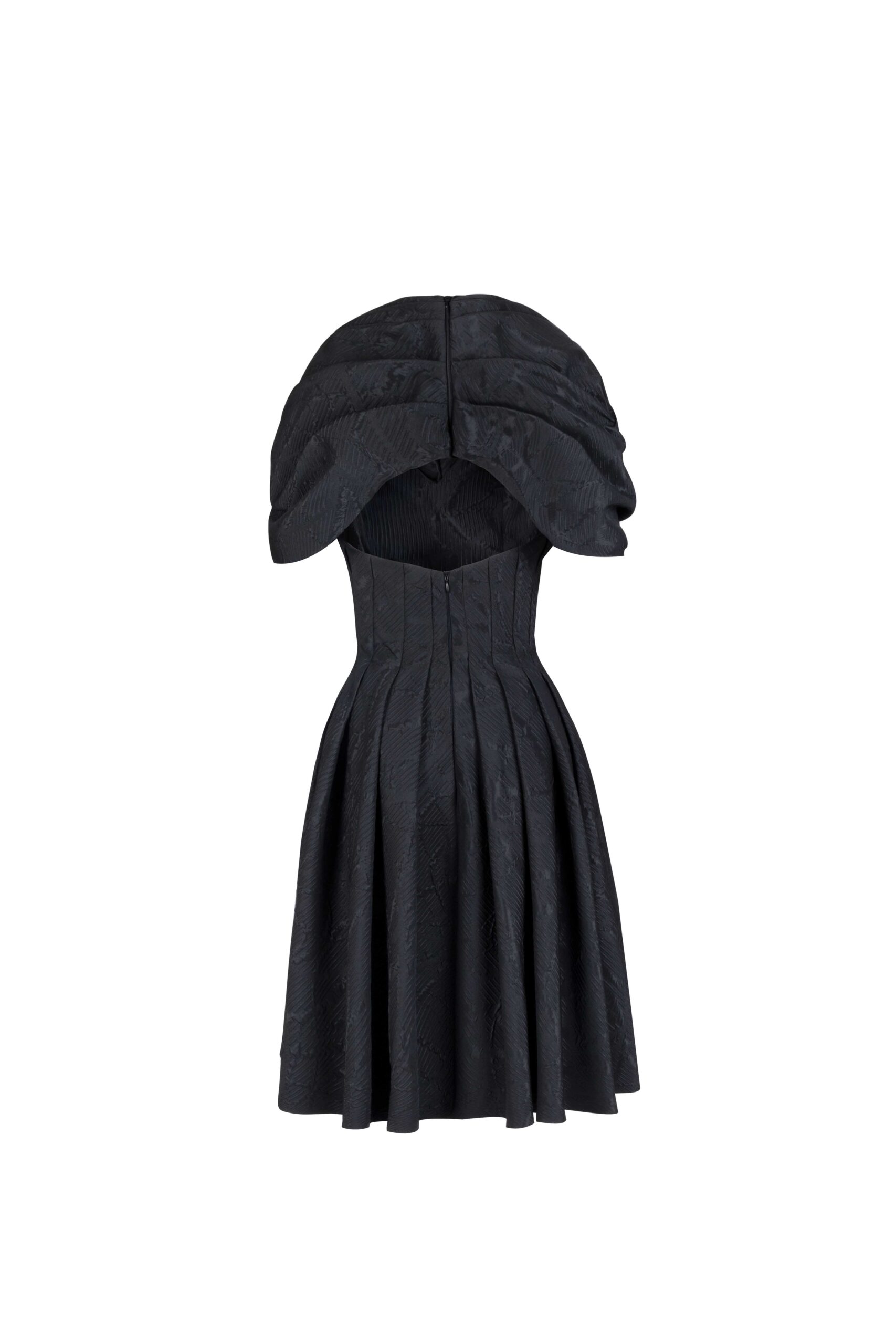 Black jacquard dress featuring a halter-style sculpted neckline with off-shoulder effect, a defined waist, and an asymmetric flared skirt.