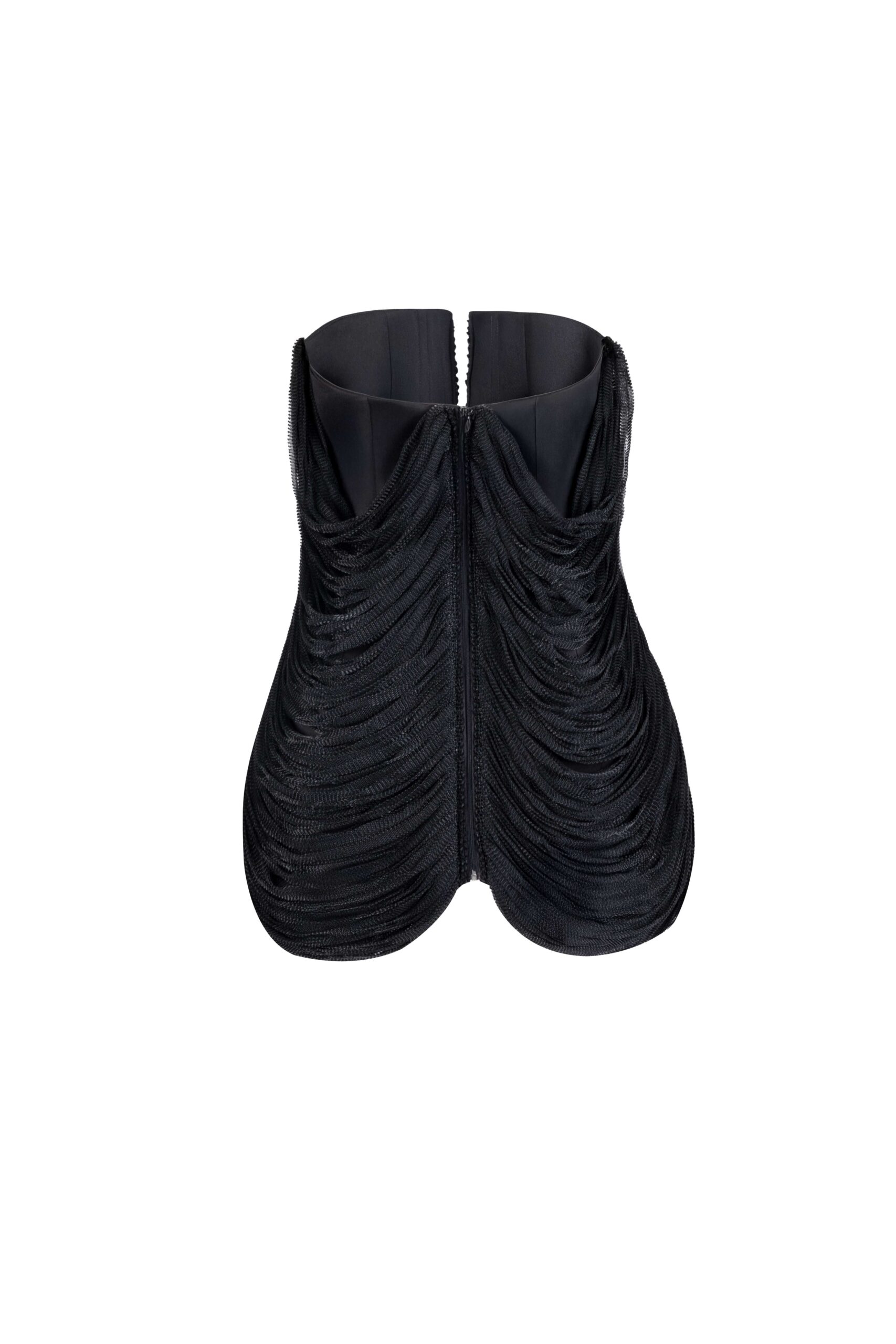 Introducing a refined expression of modern romance, this razmir satin top features an open-bust butterfly silhouette accented with sculptural draped cords.