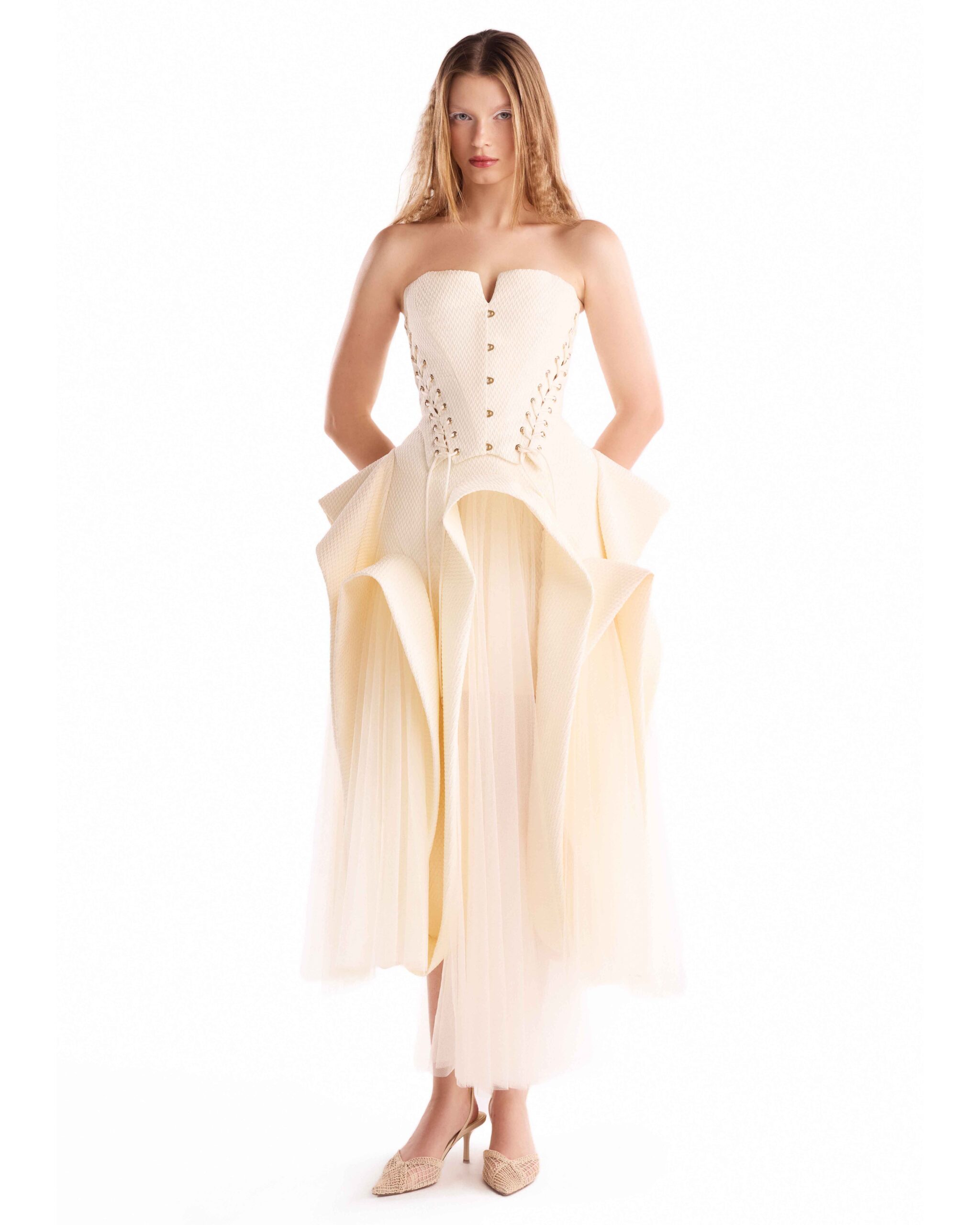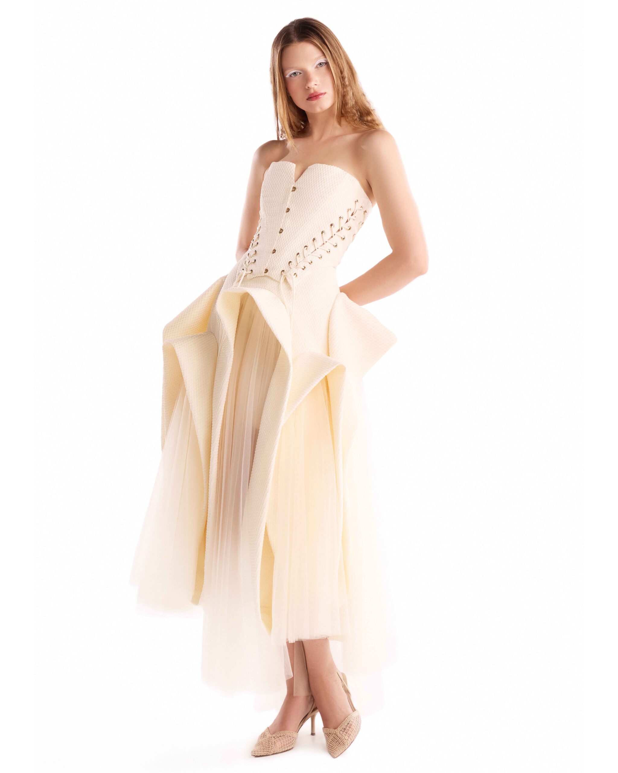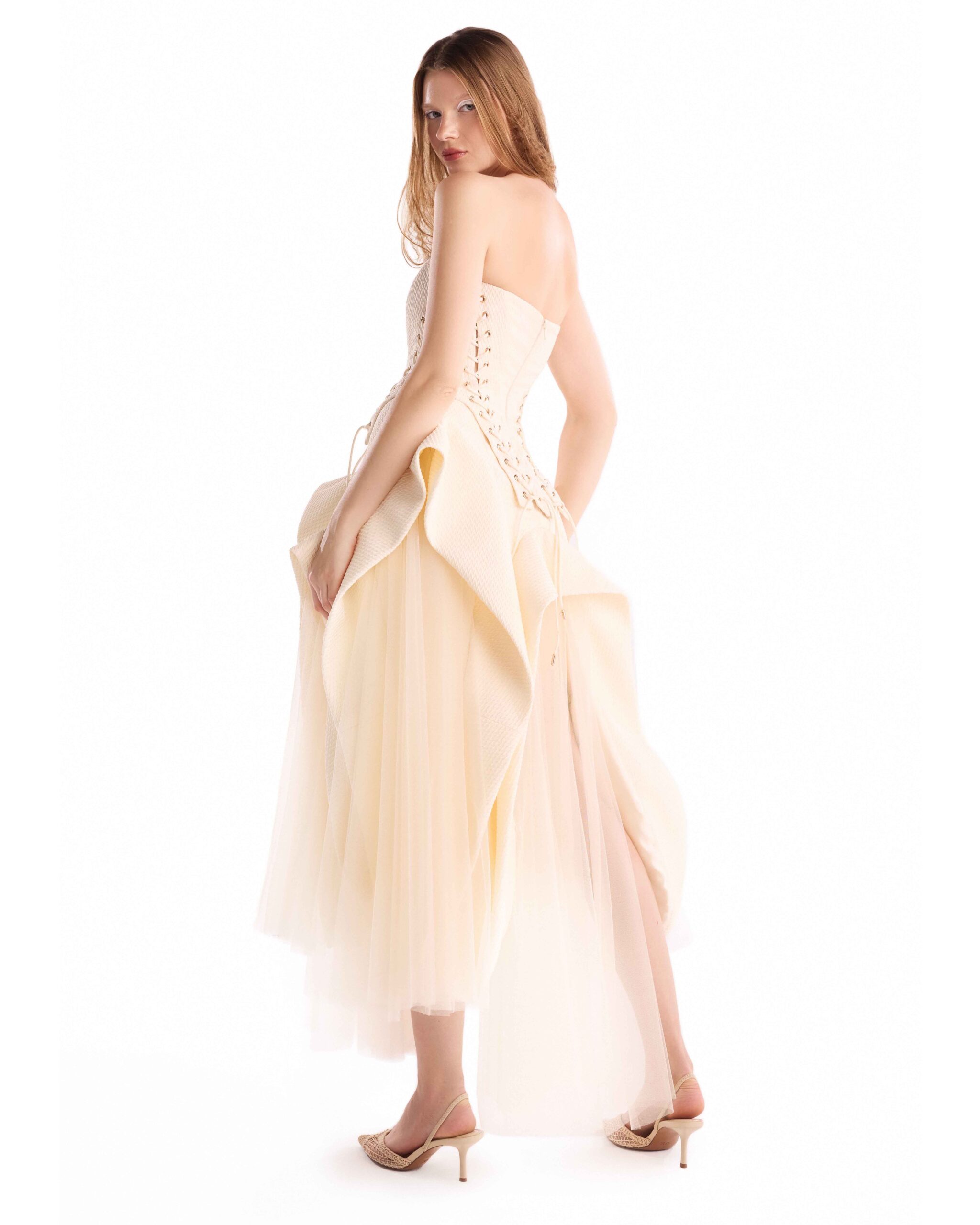 Composed in layered textures, this cream jacquard skirt blends sculptural structure with soft tulle movement.