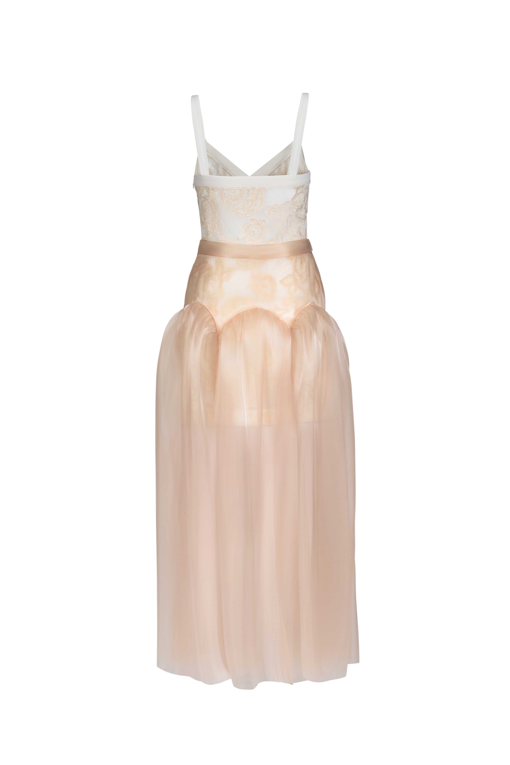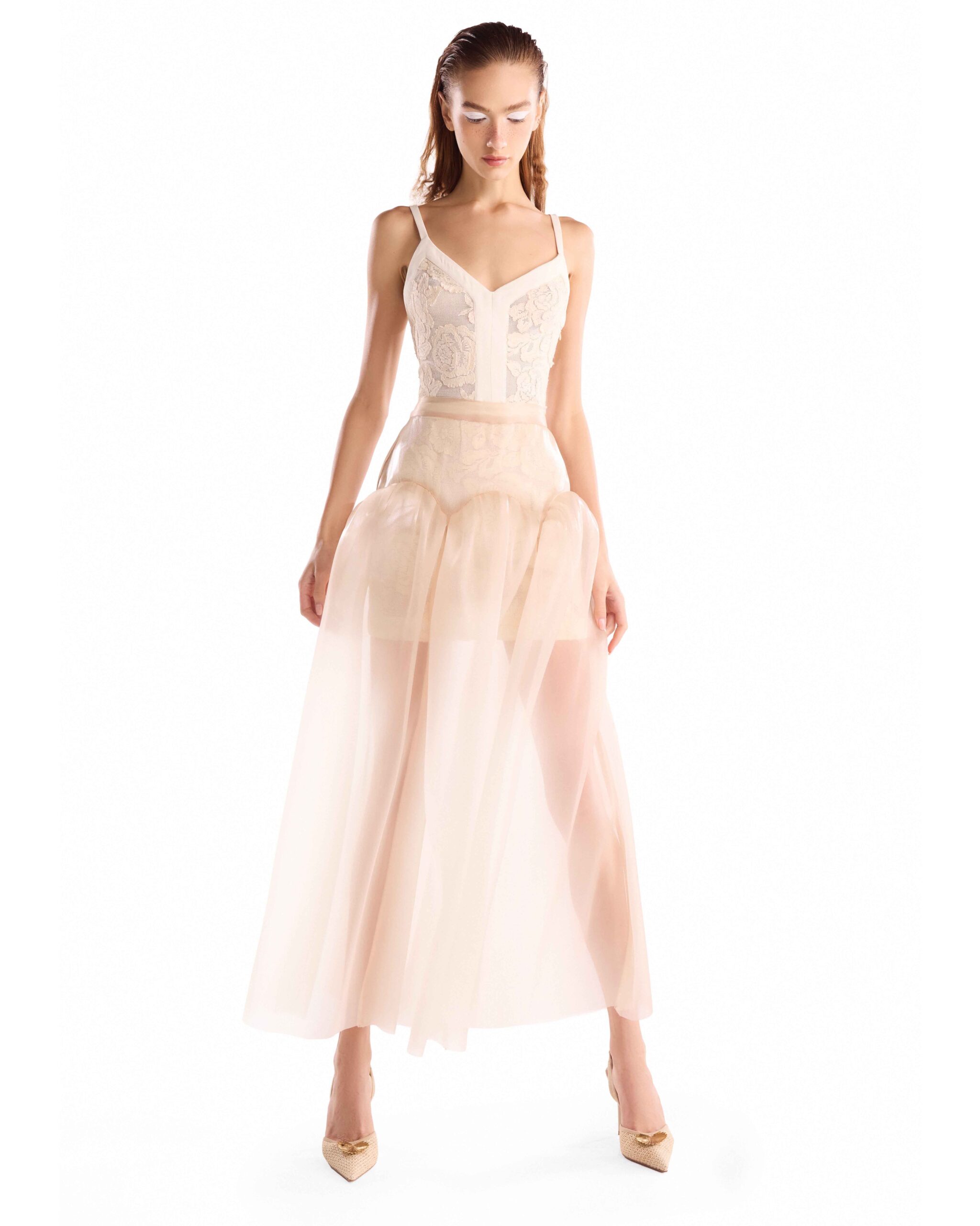Fitted creamy brocard dress complemented by a removable liquid organza overskirt for versatile, elevated elegance.