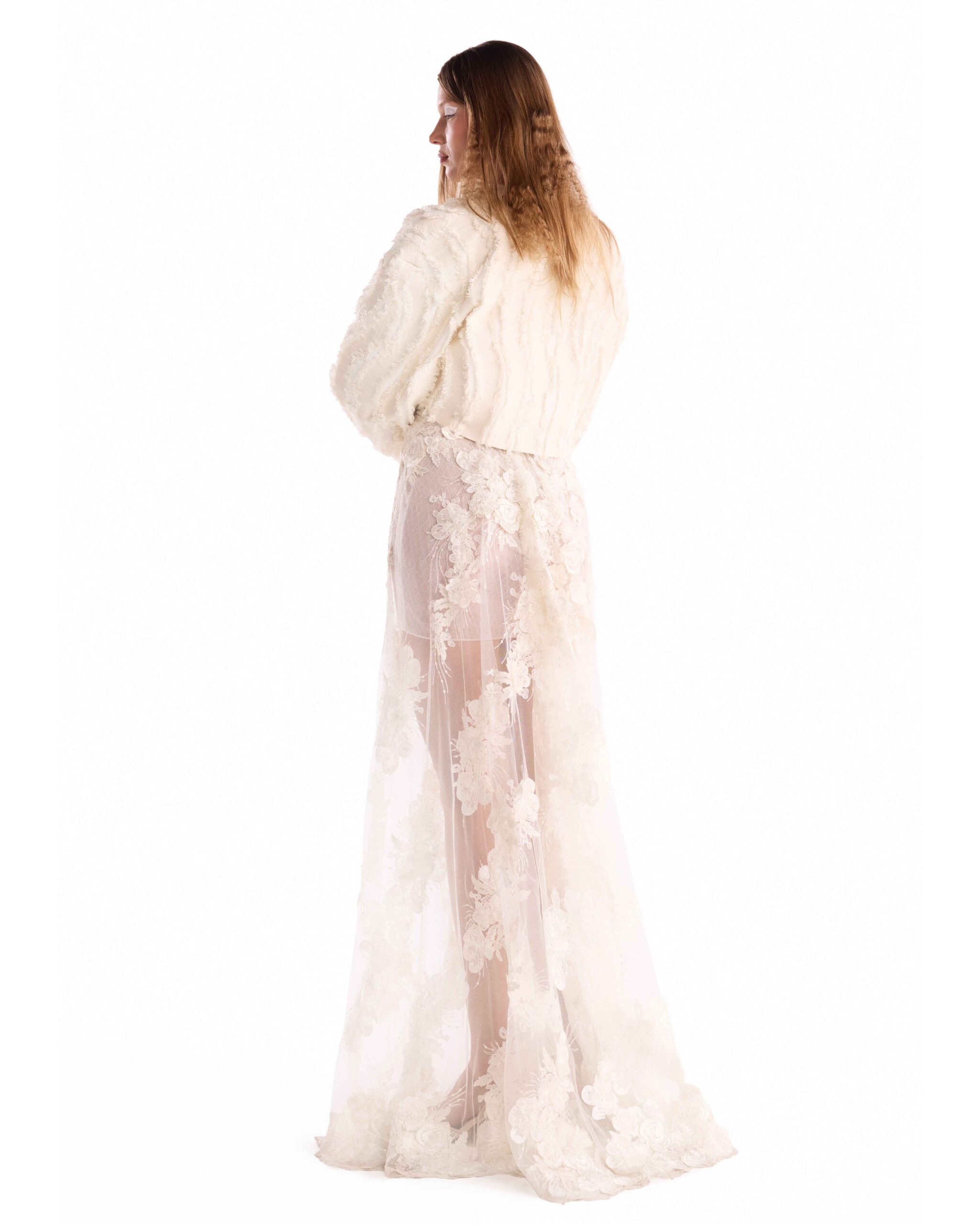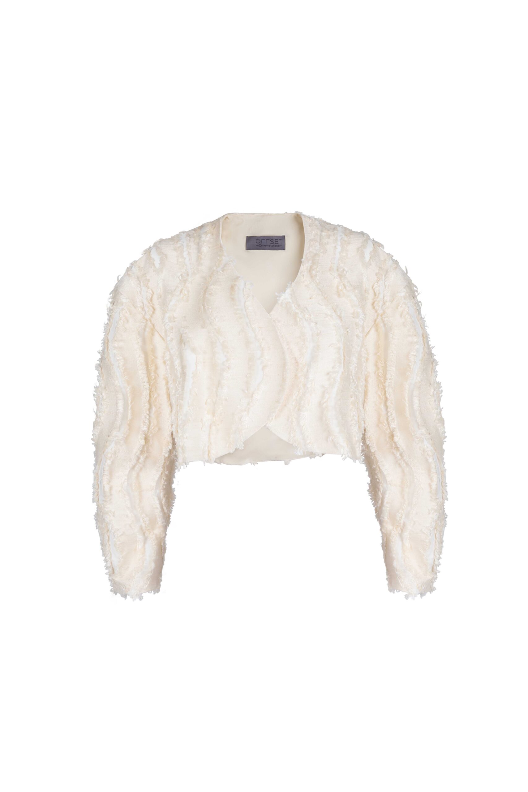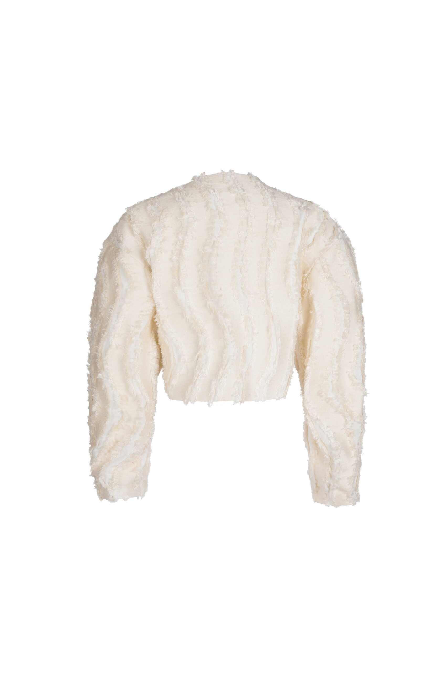 A cropped creamy jacket in frilled jacquard, offering texture, softness, and refined layering appeal.
