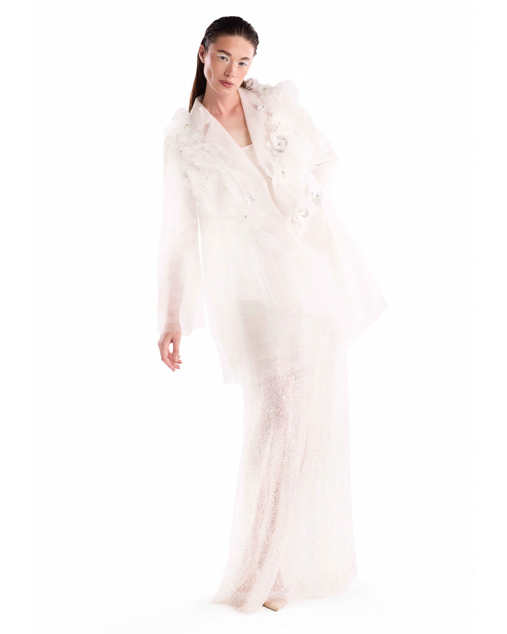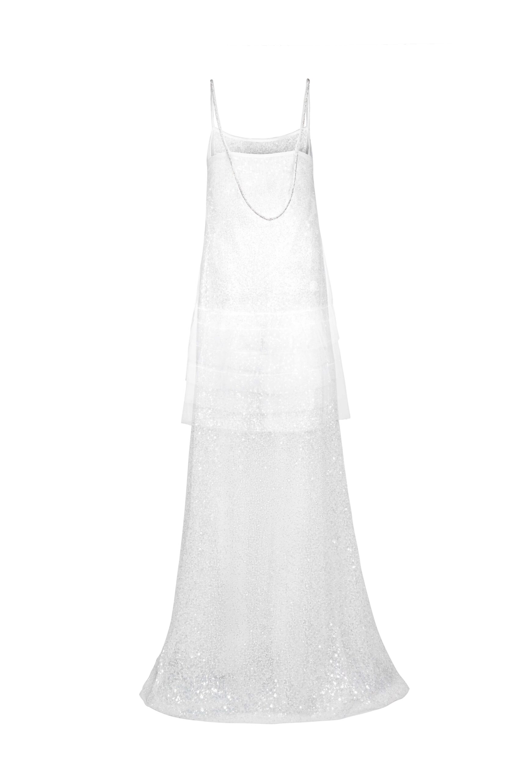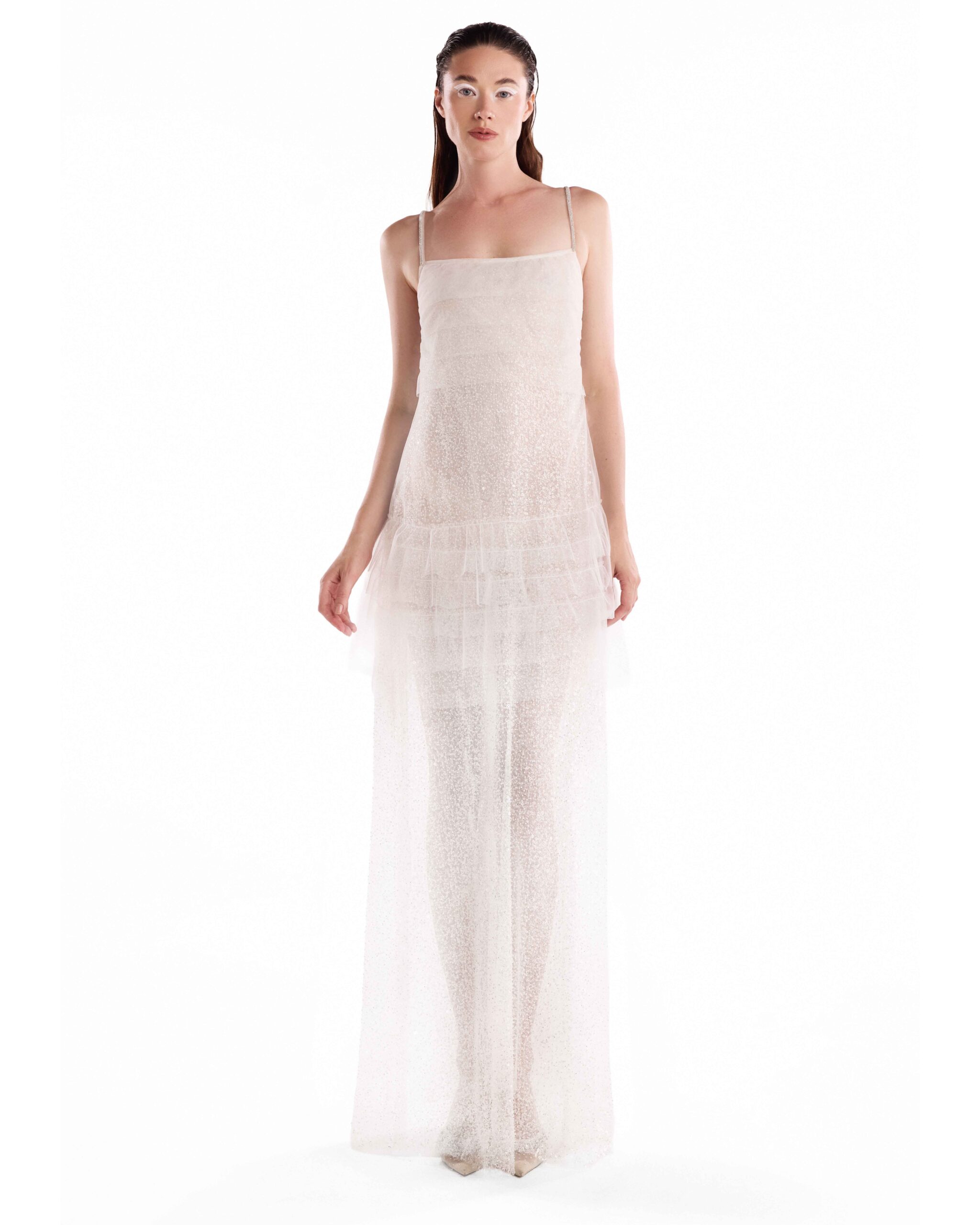 Sheer lace and tulle dress with fine straps, layered construction, and a fluid floor-length silhouette.