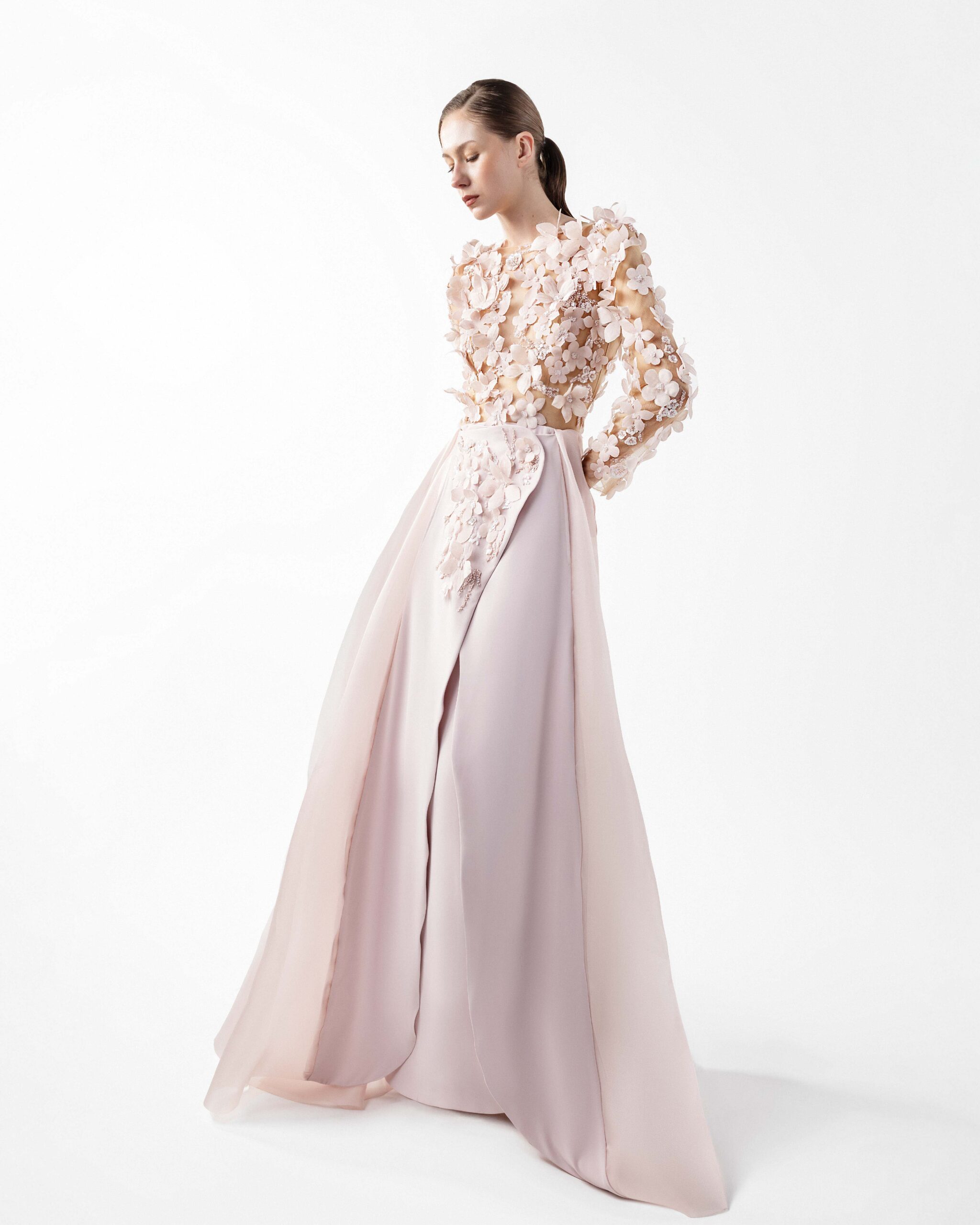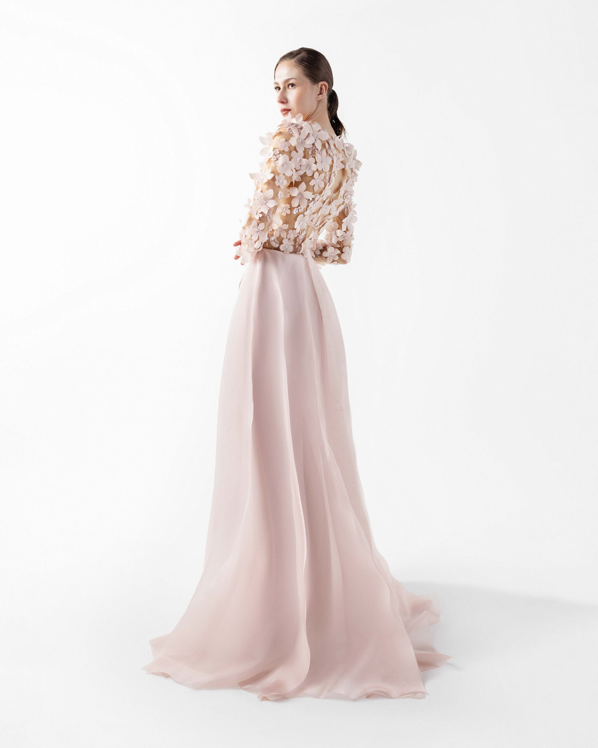 This enchanting pink gown features an illusion bodice and long sleeves blossoming with 3D floral appliques, cascading into a beautifully fluid envelops skirt. A truly romantic and ethereal statement for any special occasion.