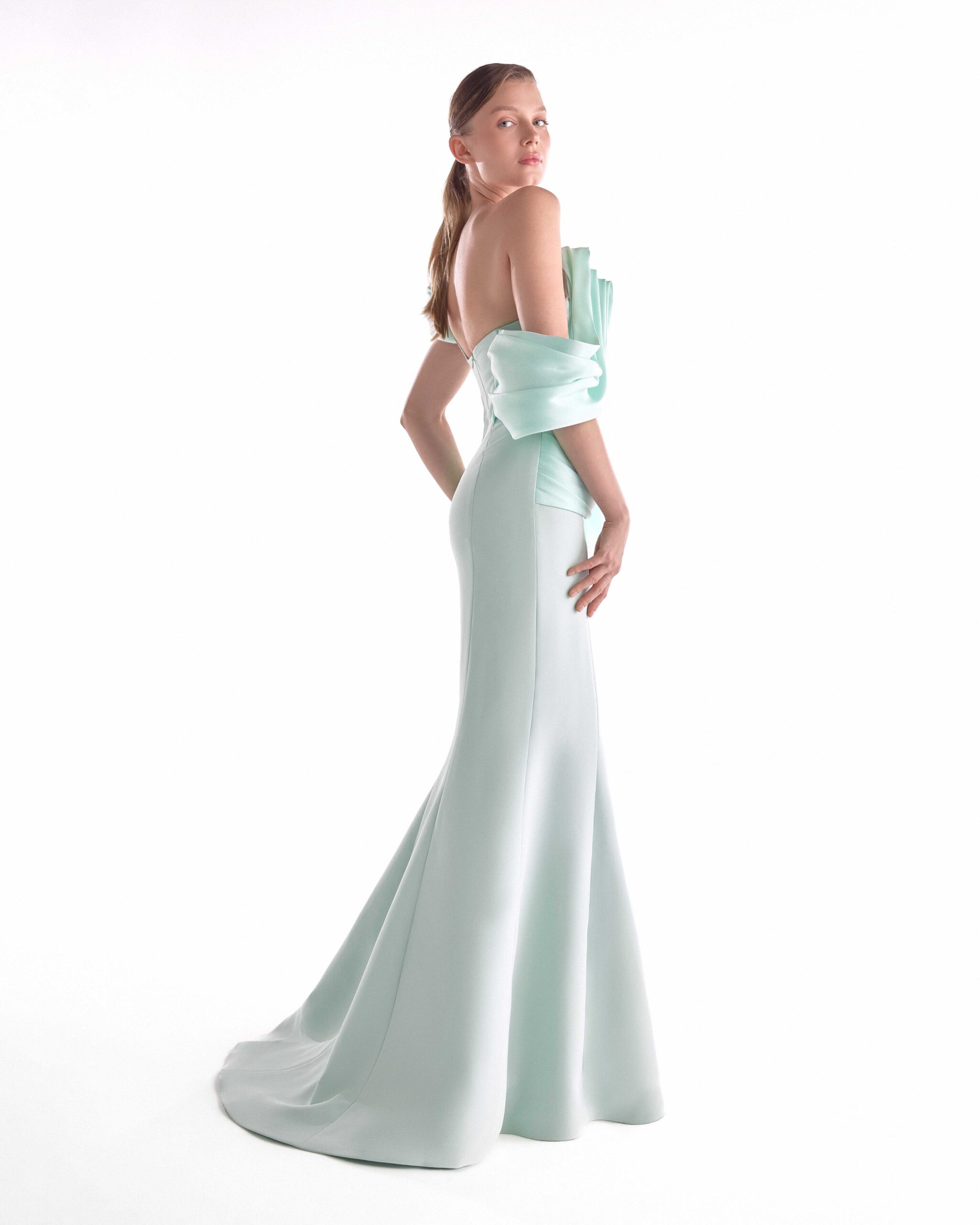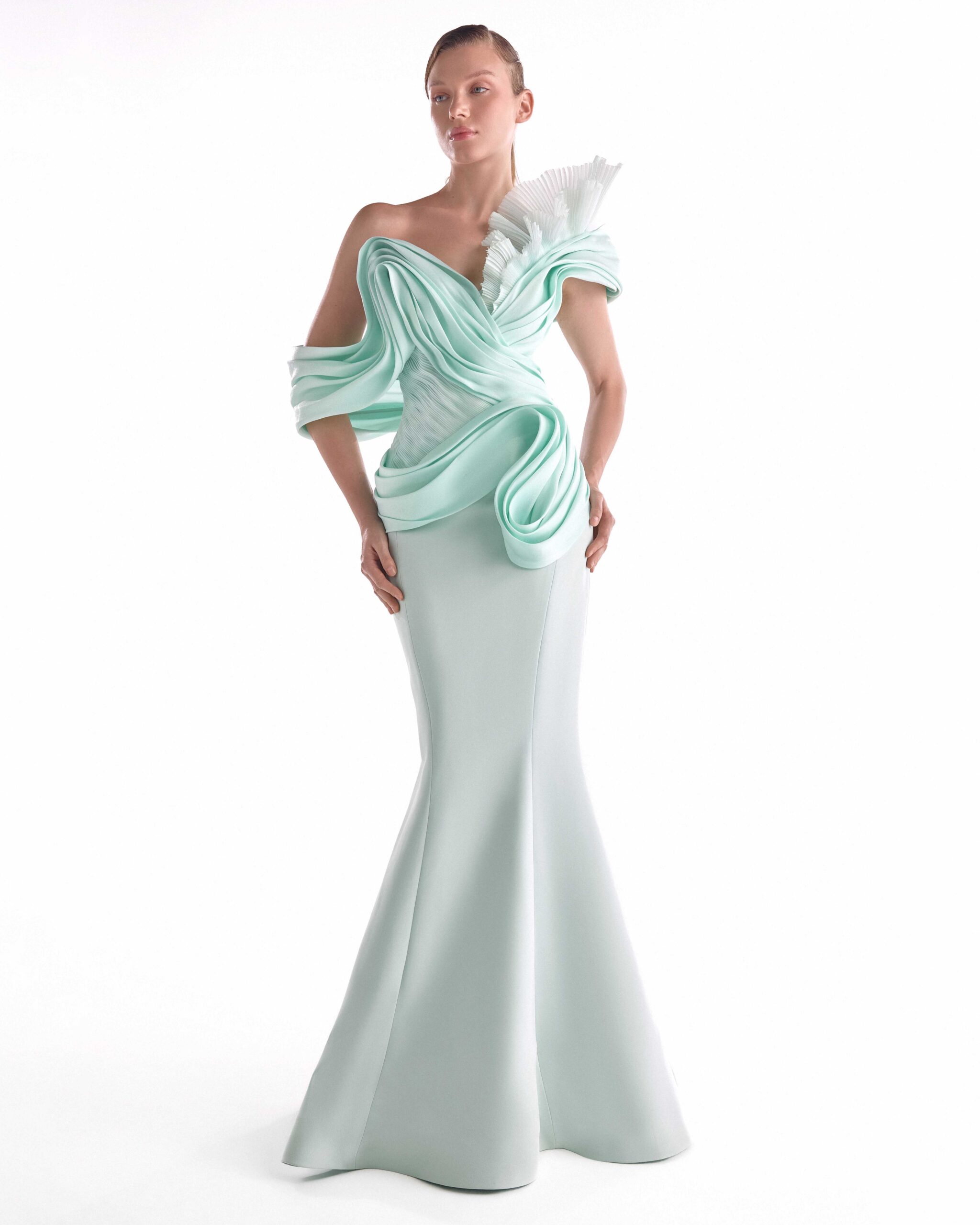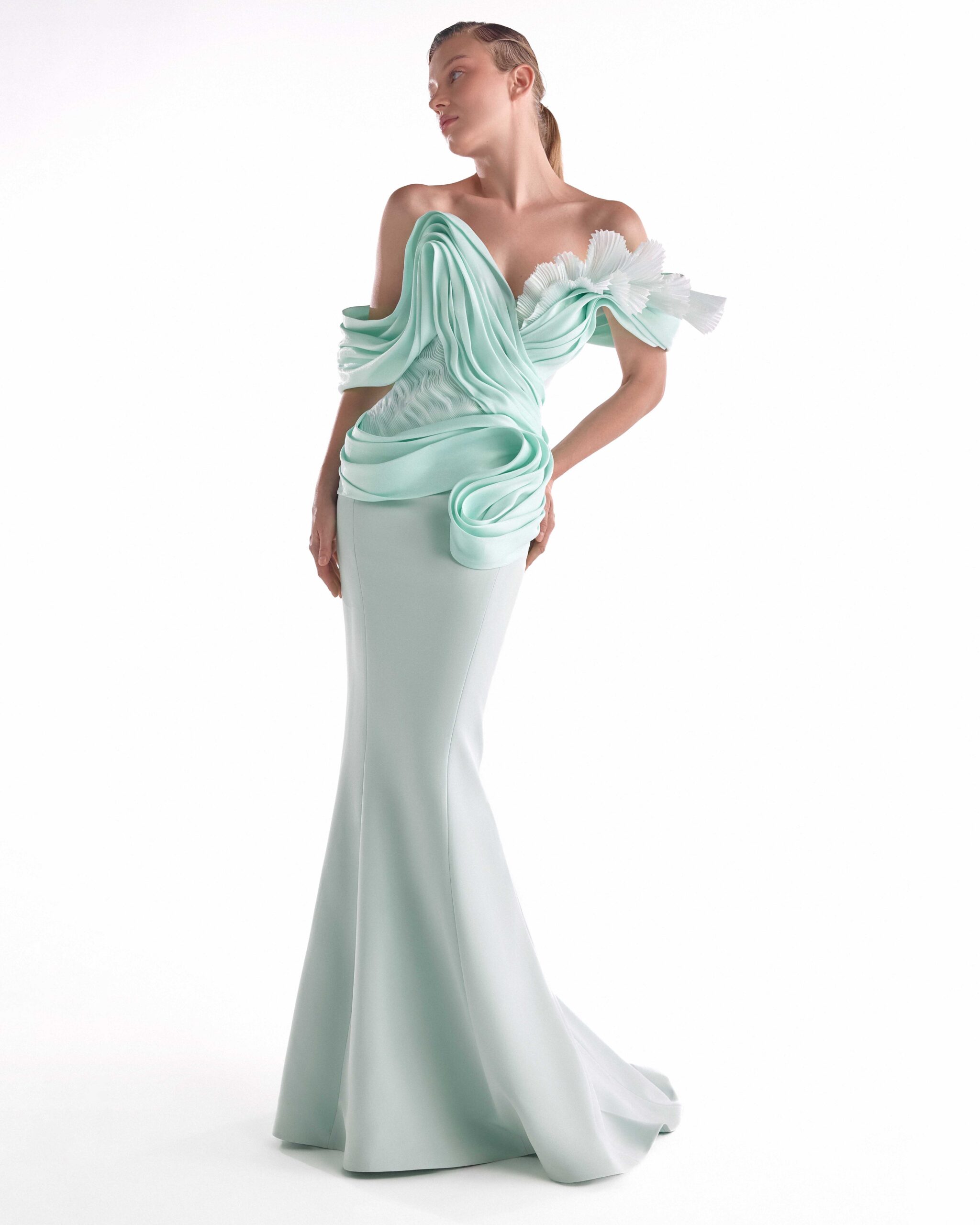 Mint mermaid gown featuring fluid organza draping and pleated sculptural accents for an effortlessly elegant silhouette.
