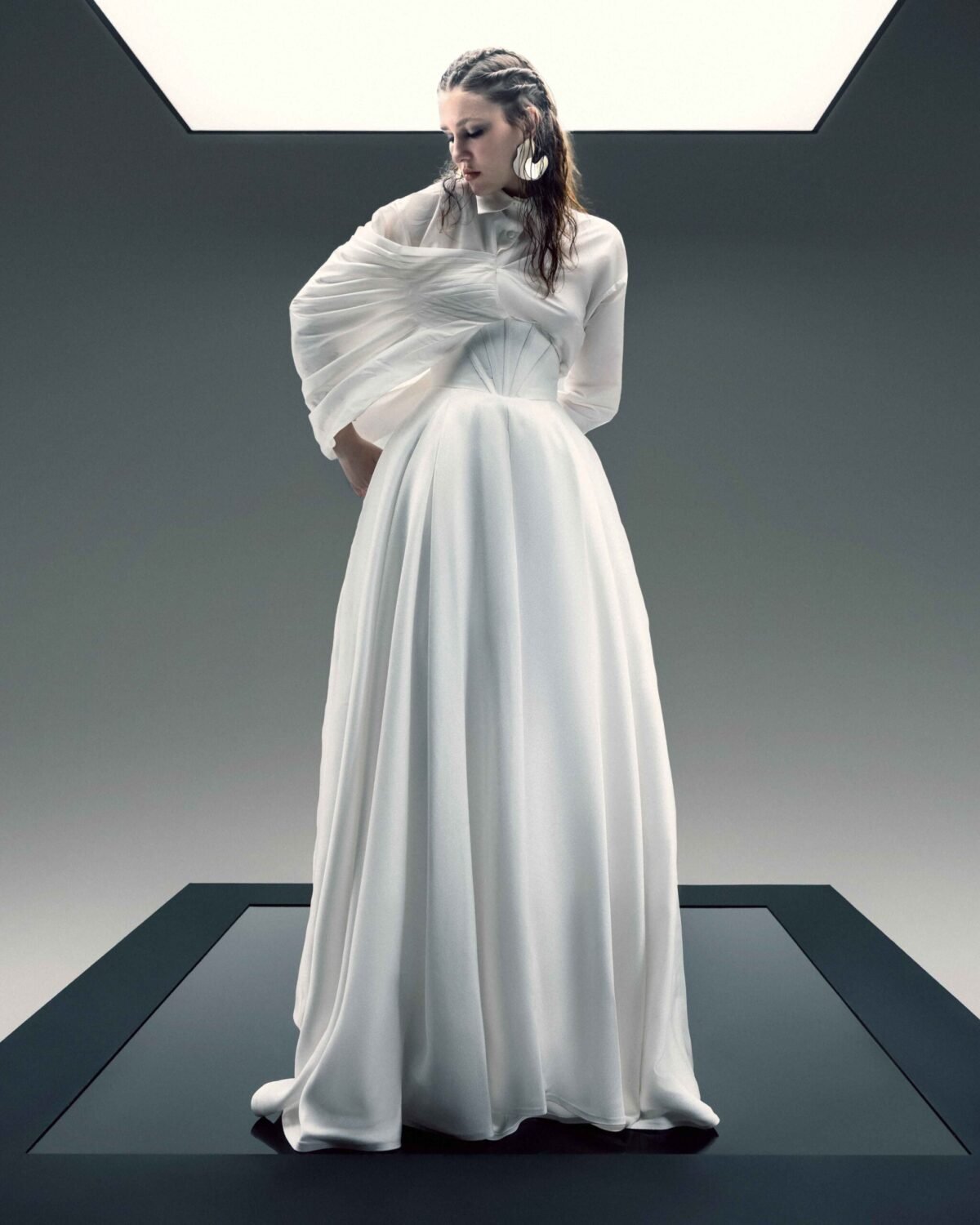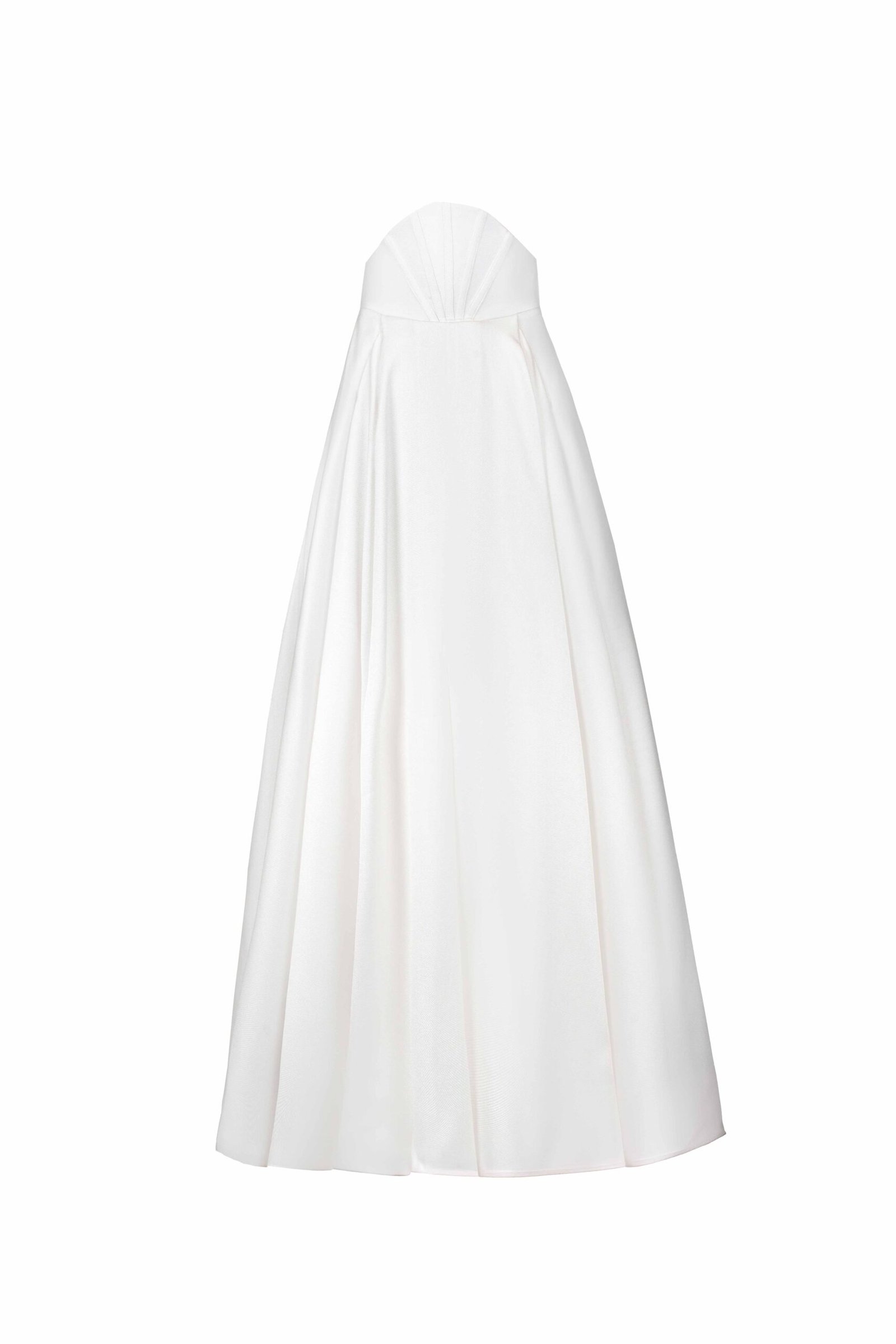 Corset-style high-waisted skirt in off-white Mikado piqué with full-volume drape and structured silhouette.