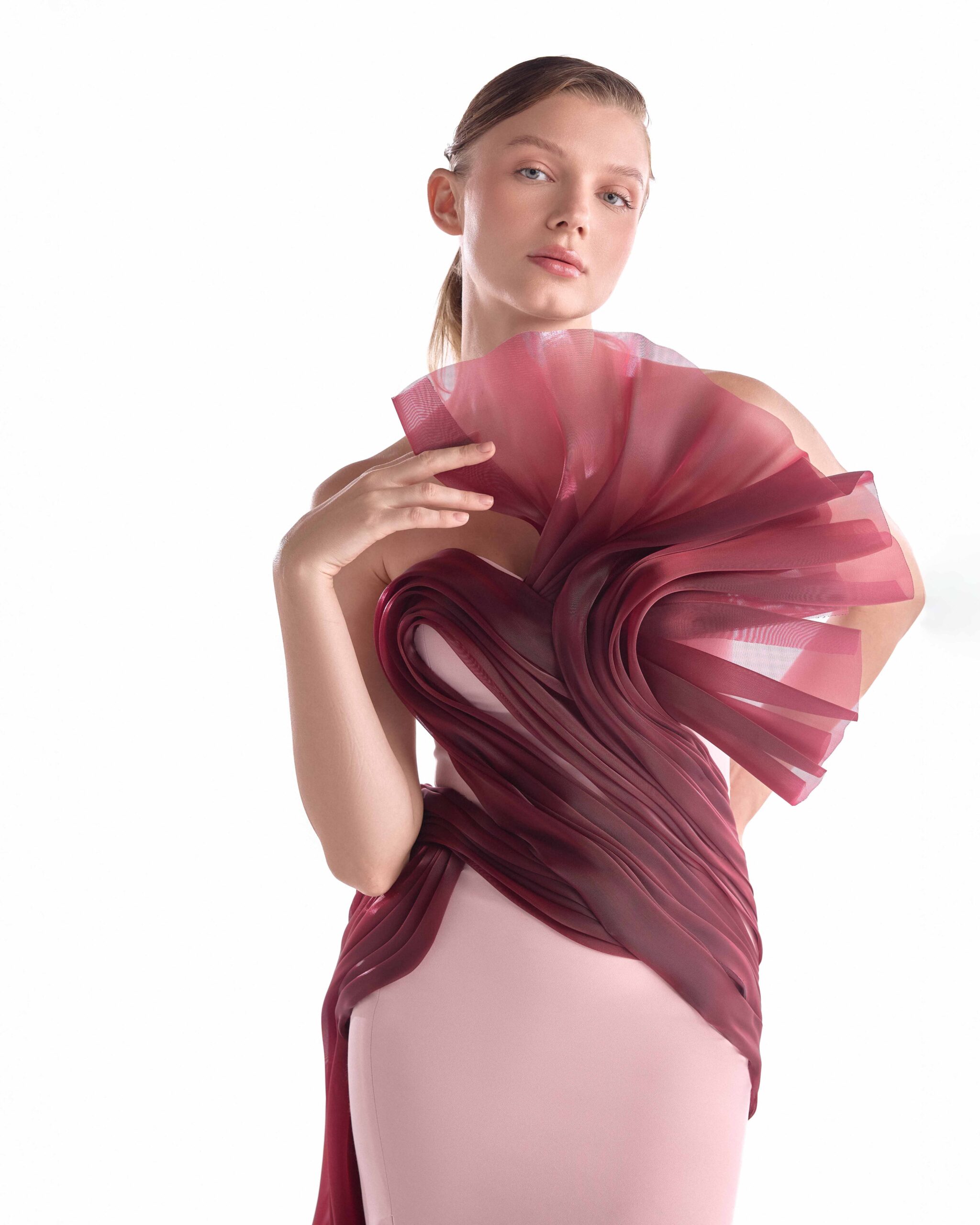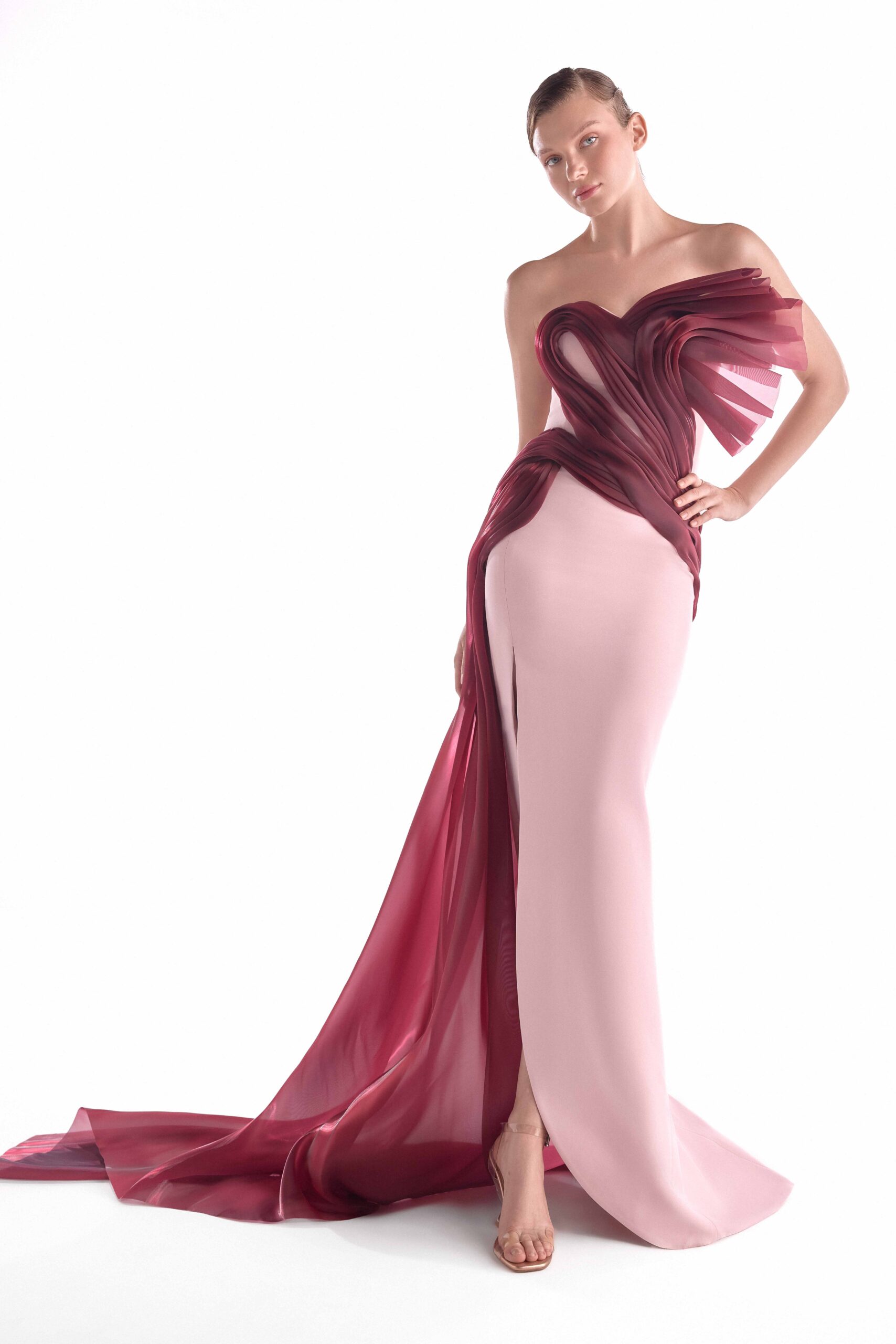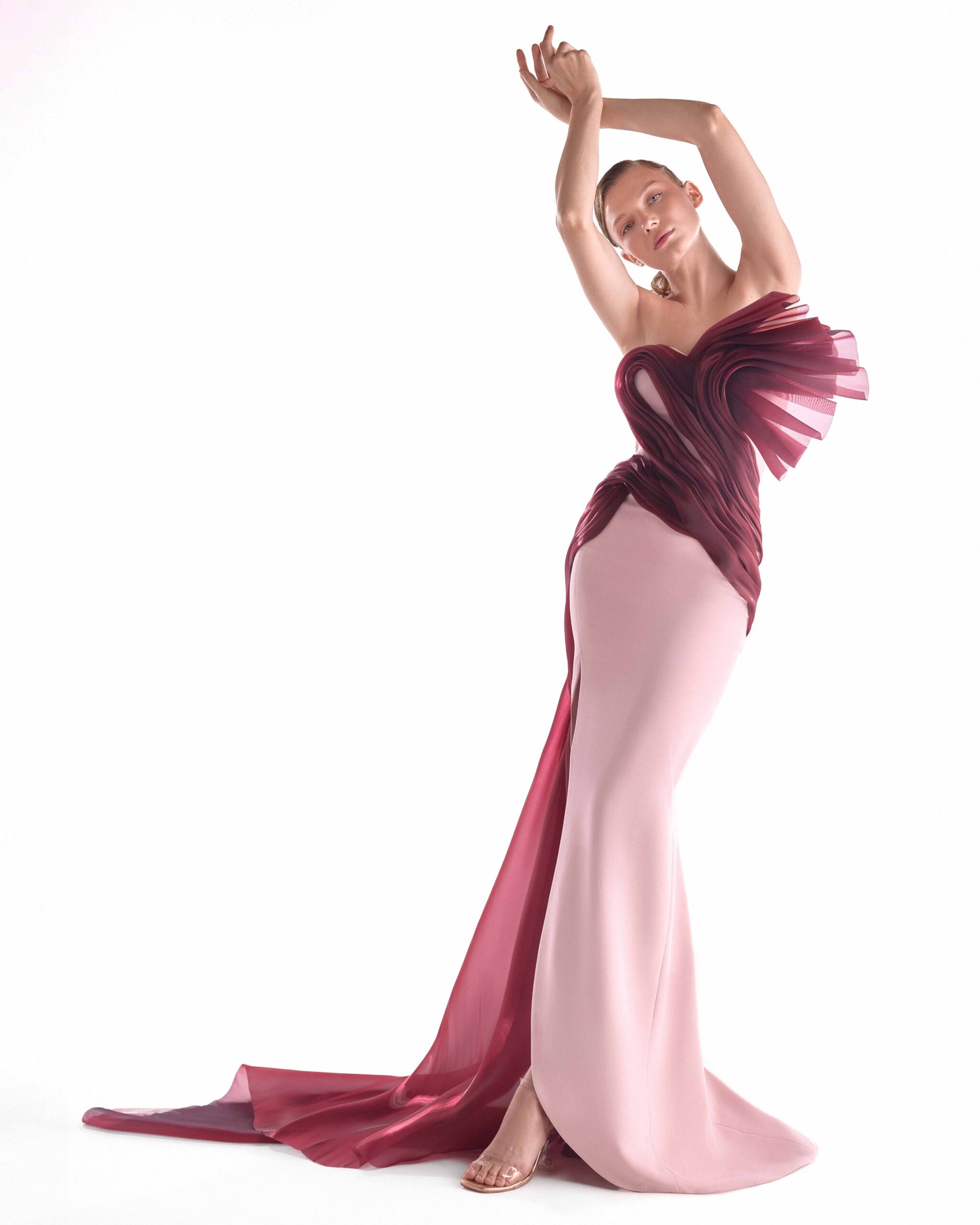 Elegant pink evening gown with a sculpted crimson organza manipulation and flowing sheer train, combining architectural drama with fluid elegance.