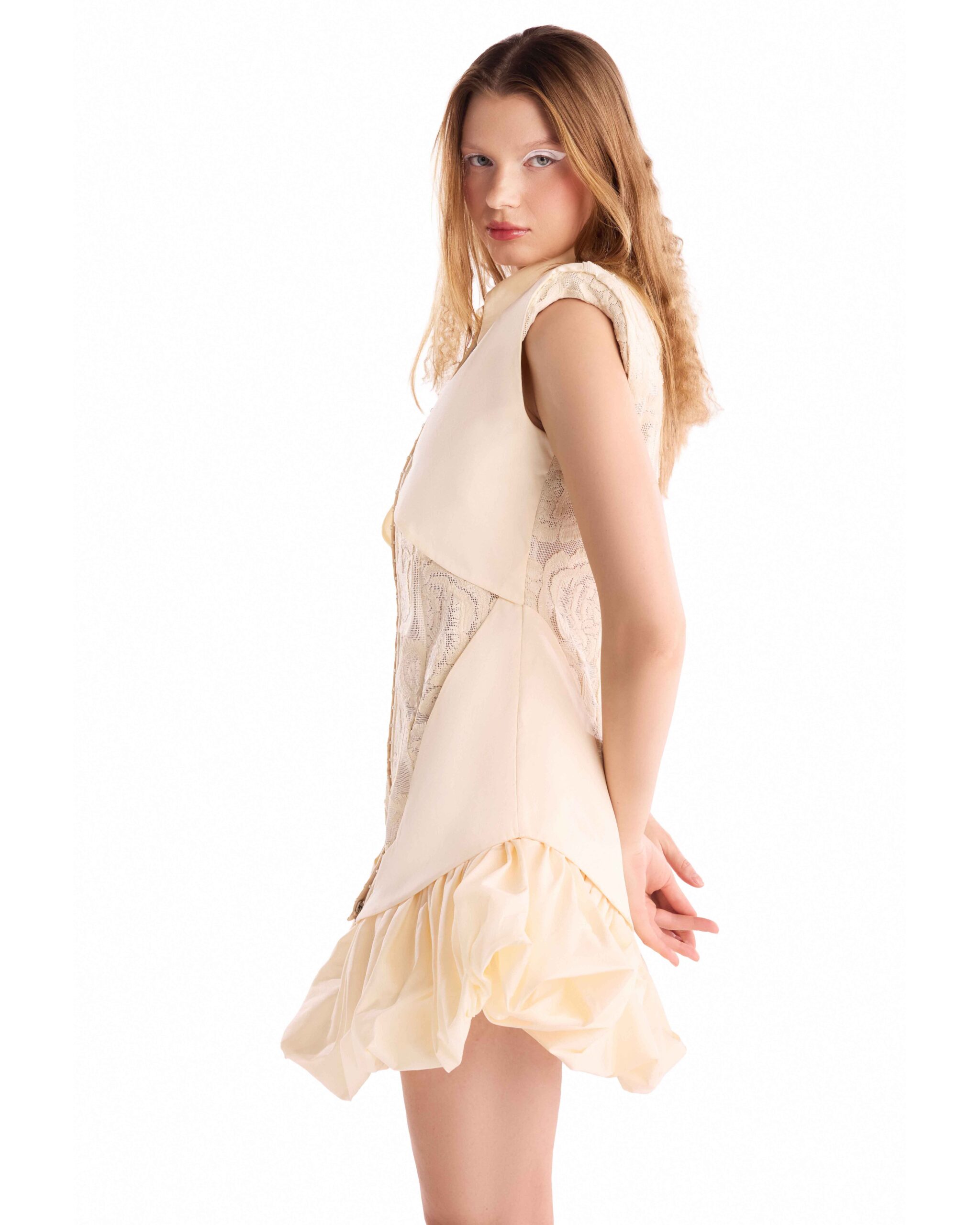 Cream jacquard and taffeta mini dress featuring a front zipper with hooks closure, sculpted lines, and a softly voluminous taffeta hem.