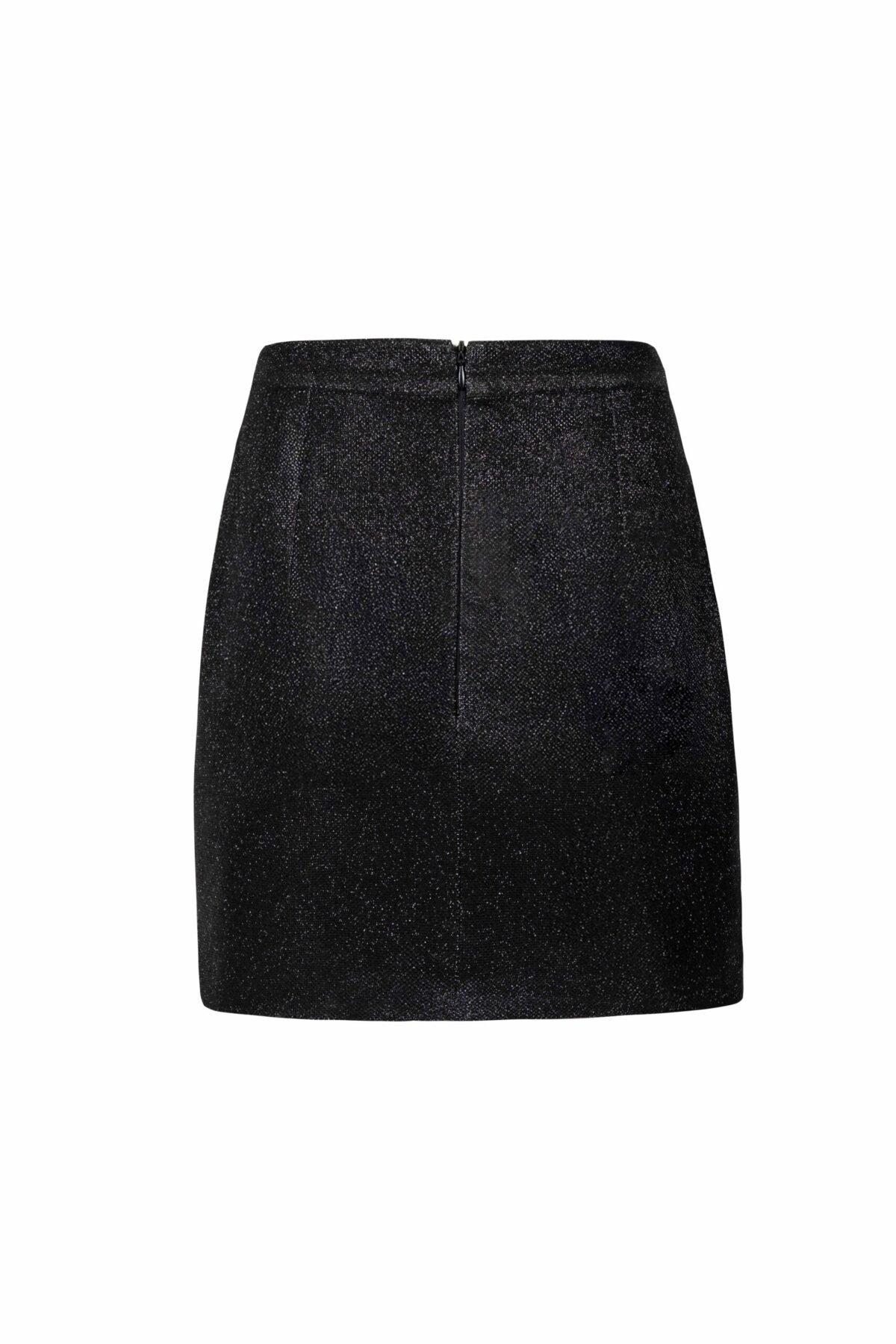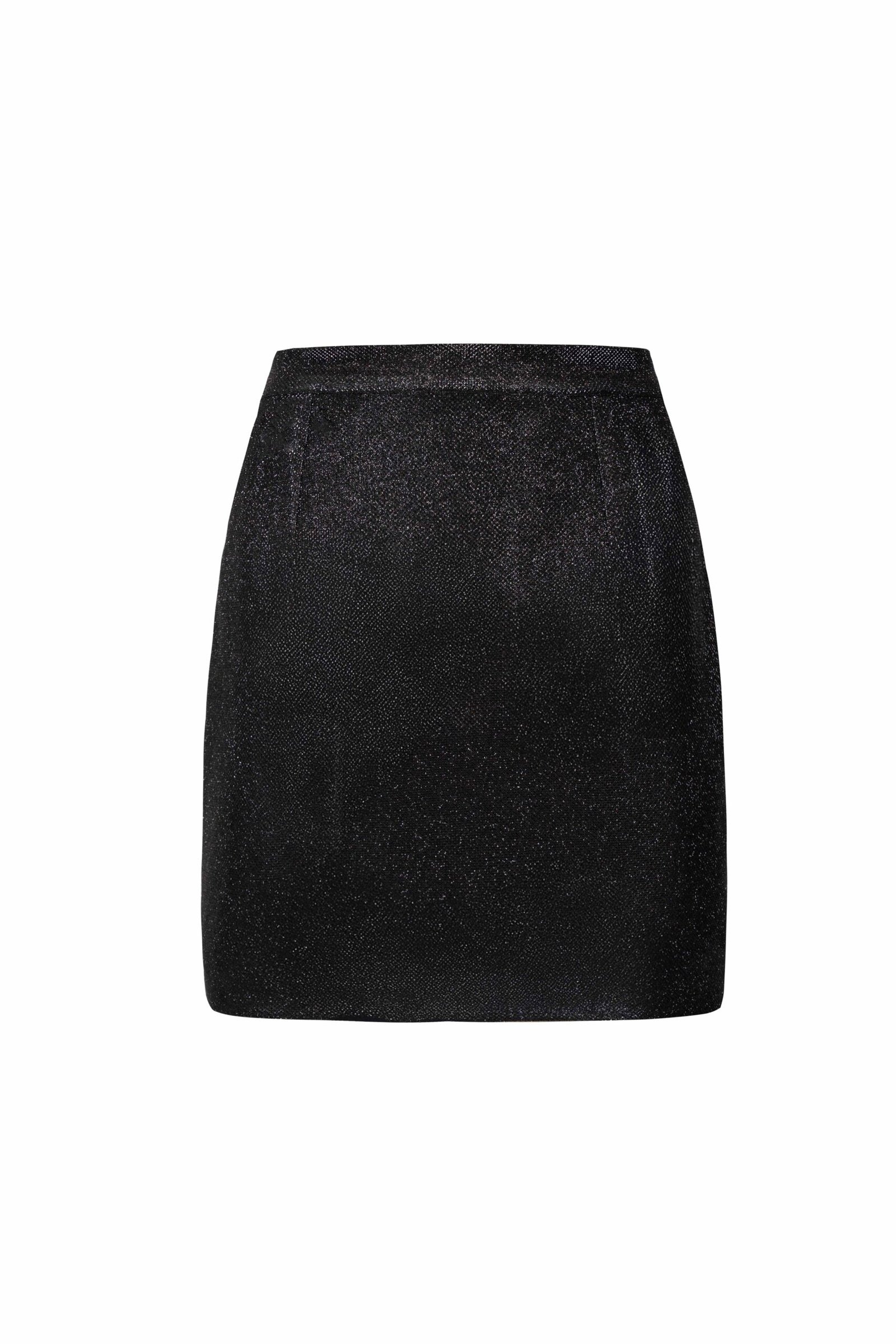High-waisted black lamé mini skirt with a clean, tailored fit and radiant shimmer—perfect for night-out and formal looks.