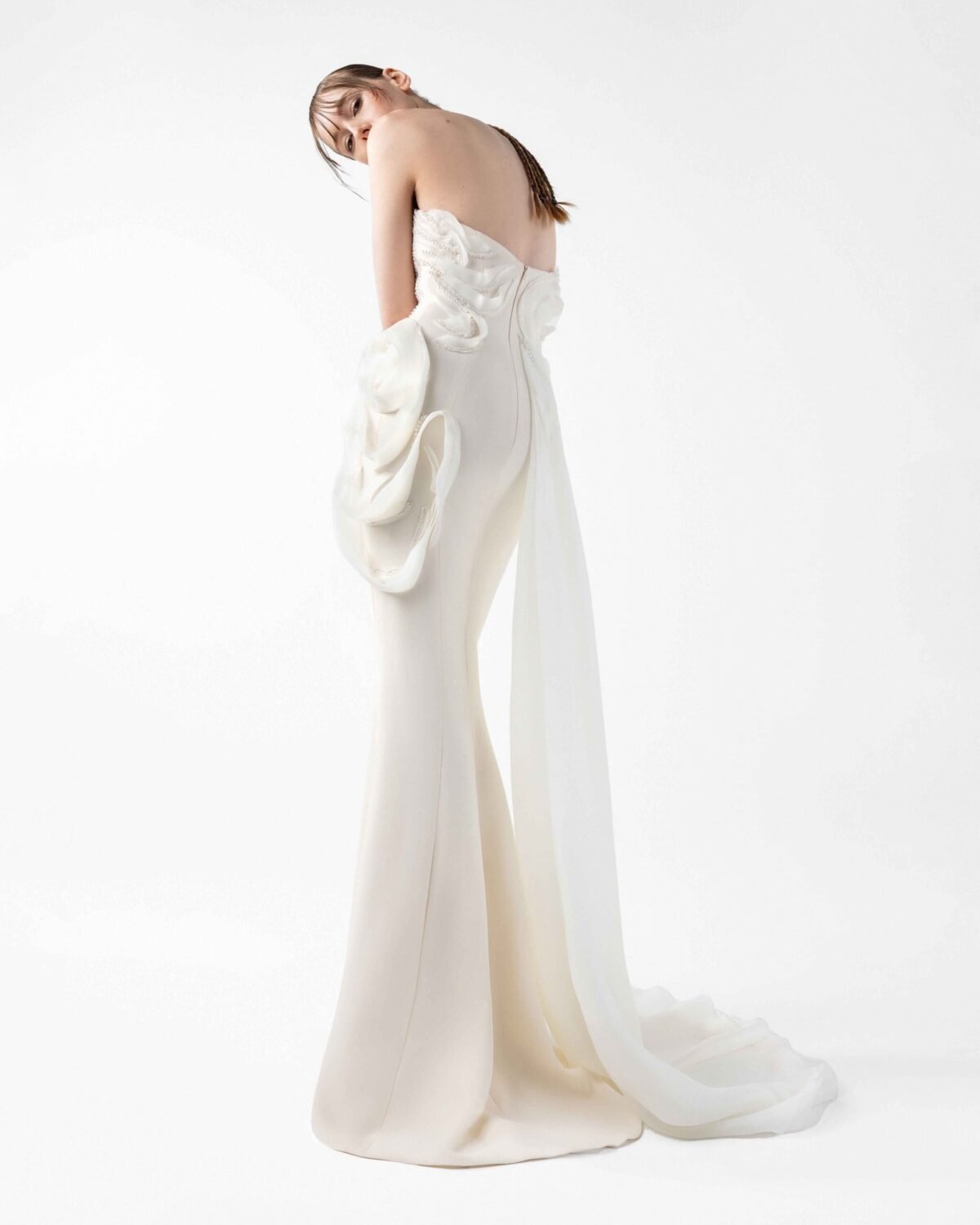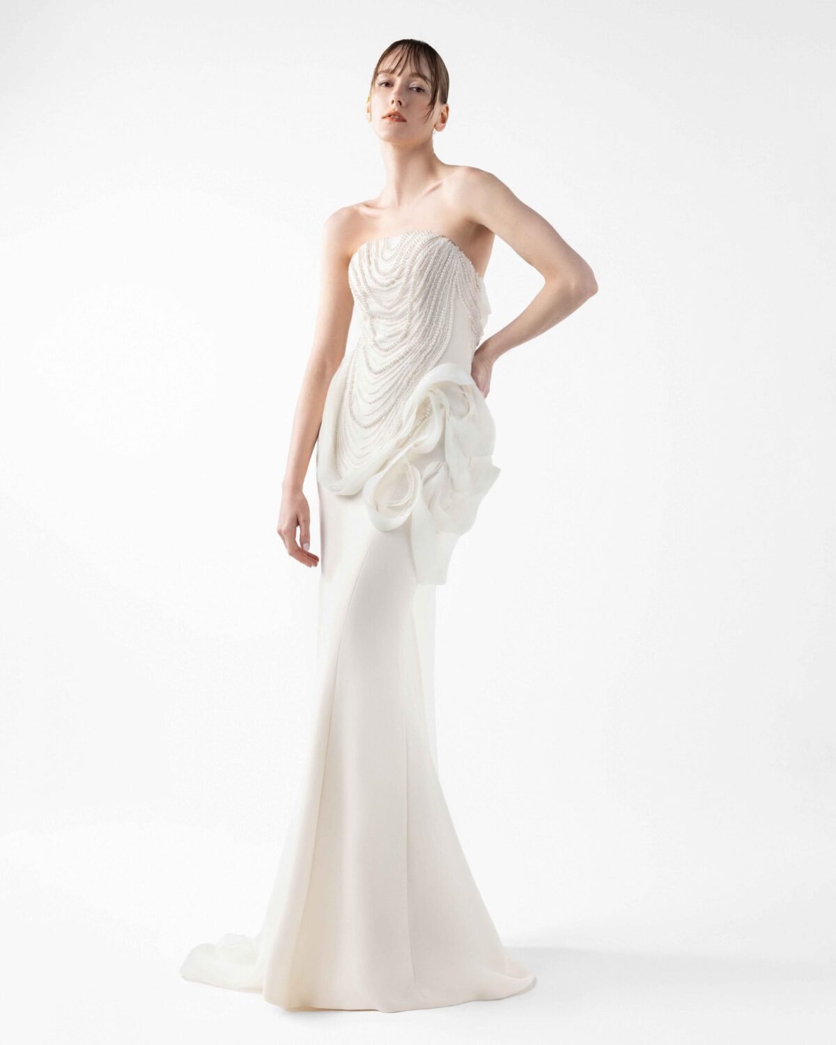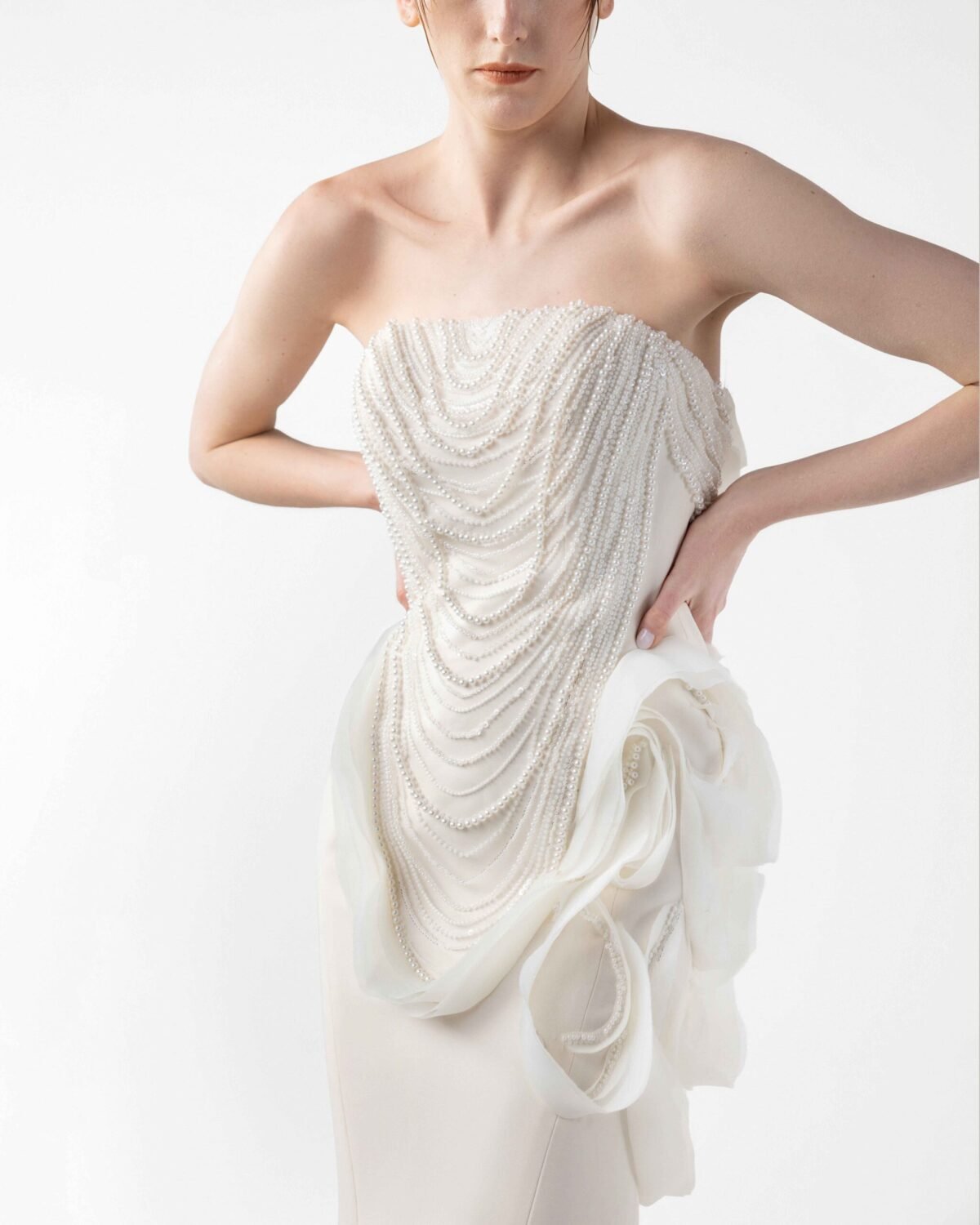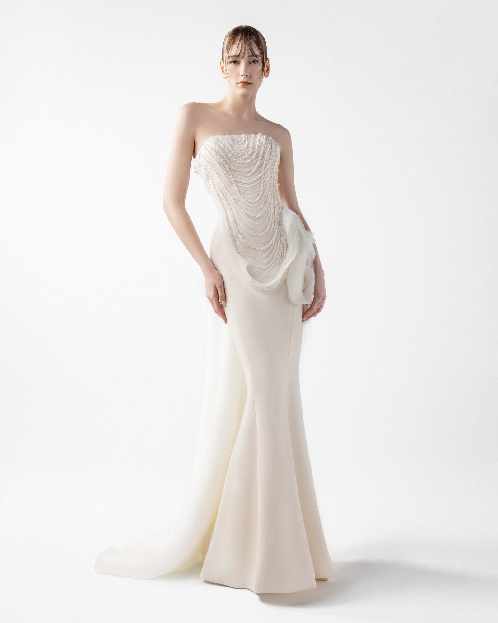 Strapless cream mermaid gown with pearl lace detailing and sculpted organza inserts. An elegant silhouette that radiates refined romance.