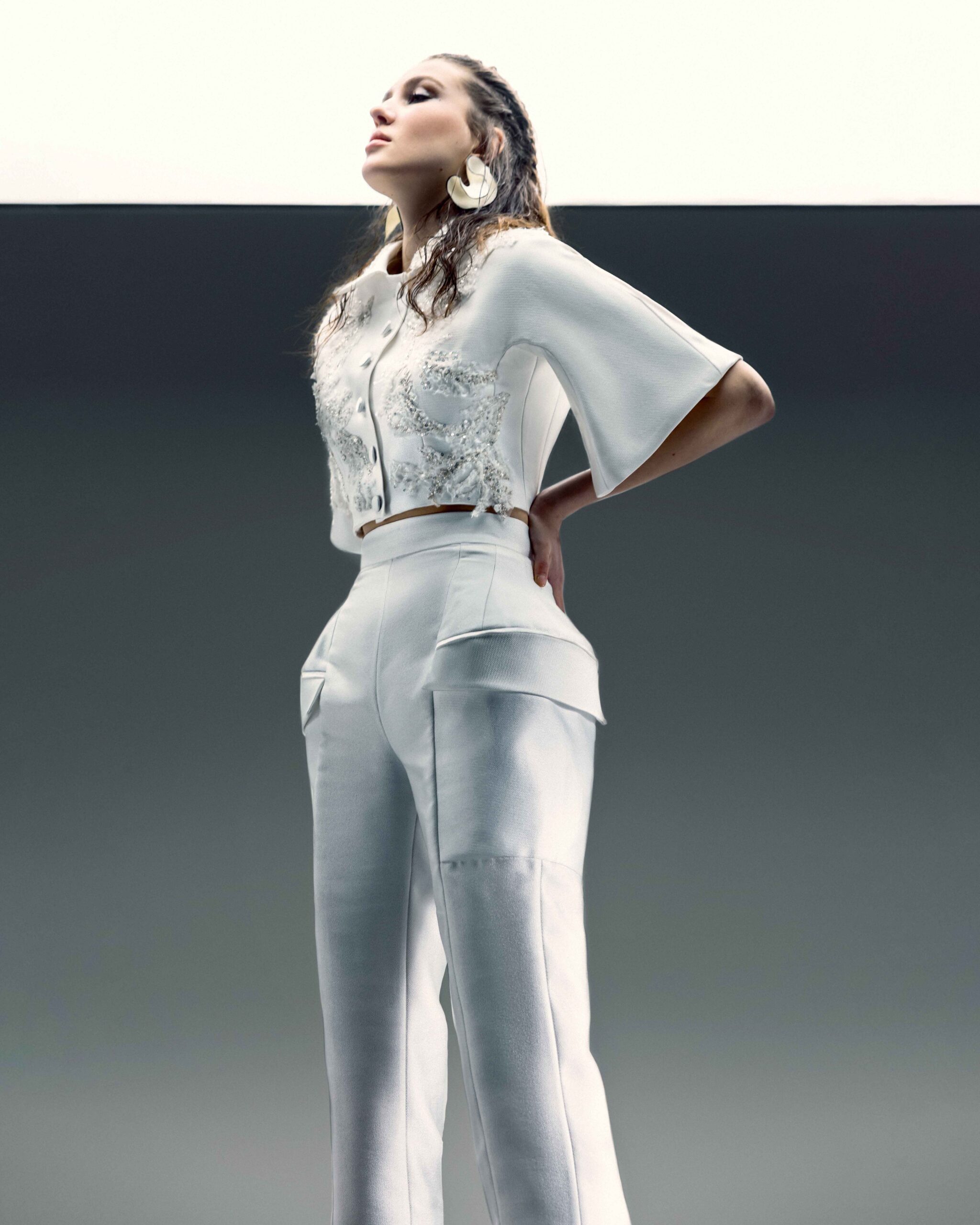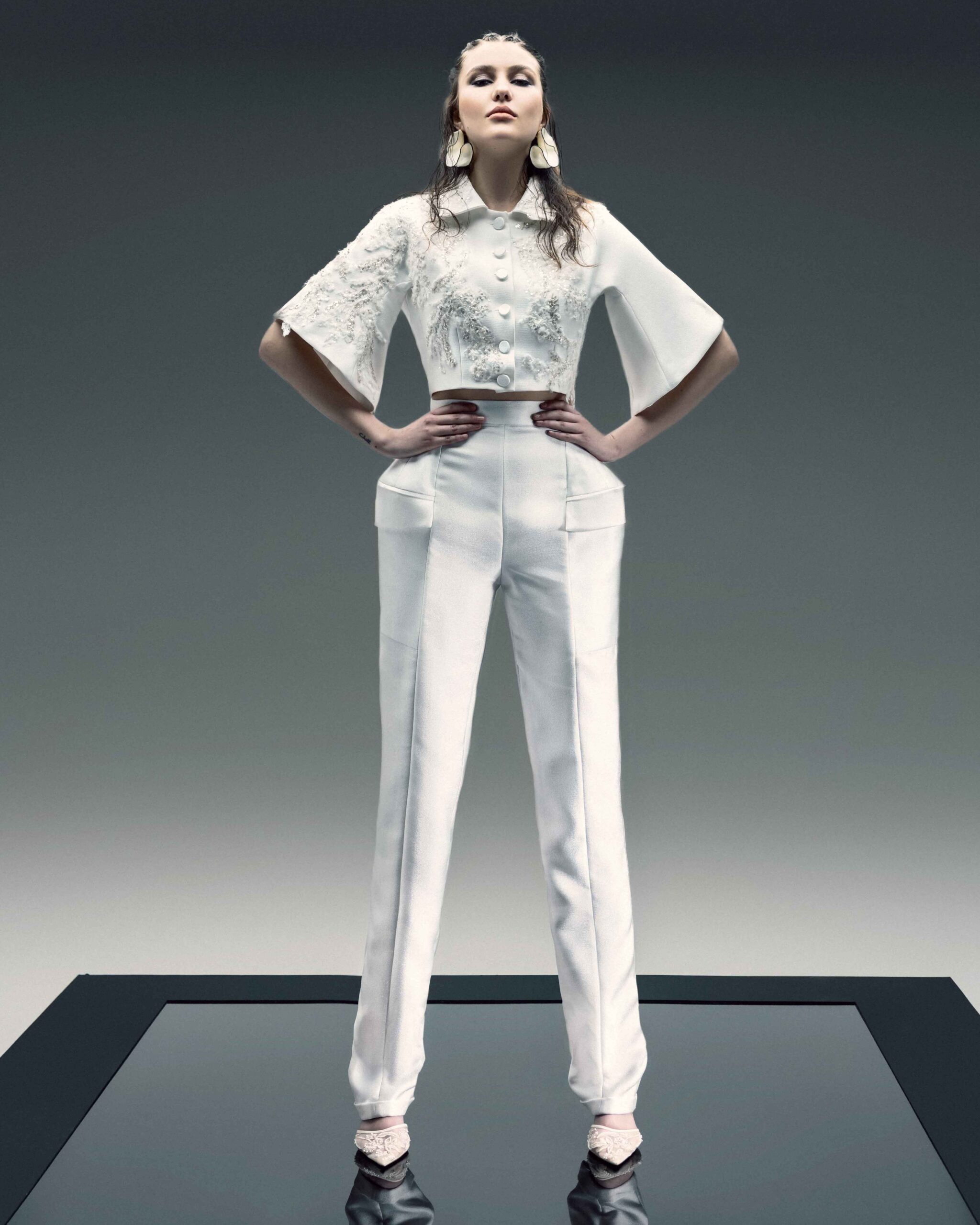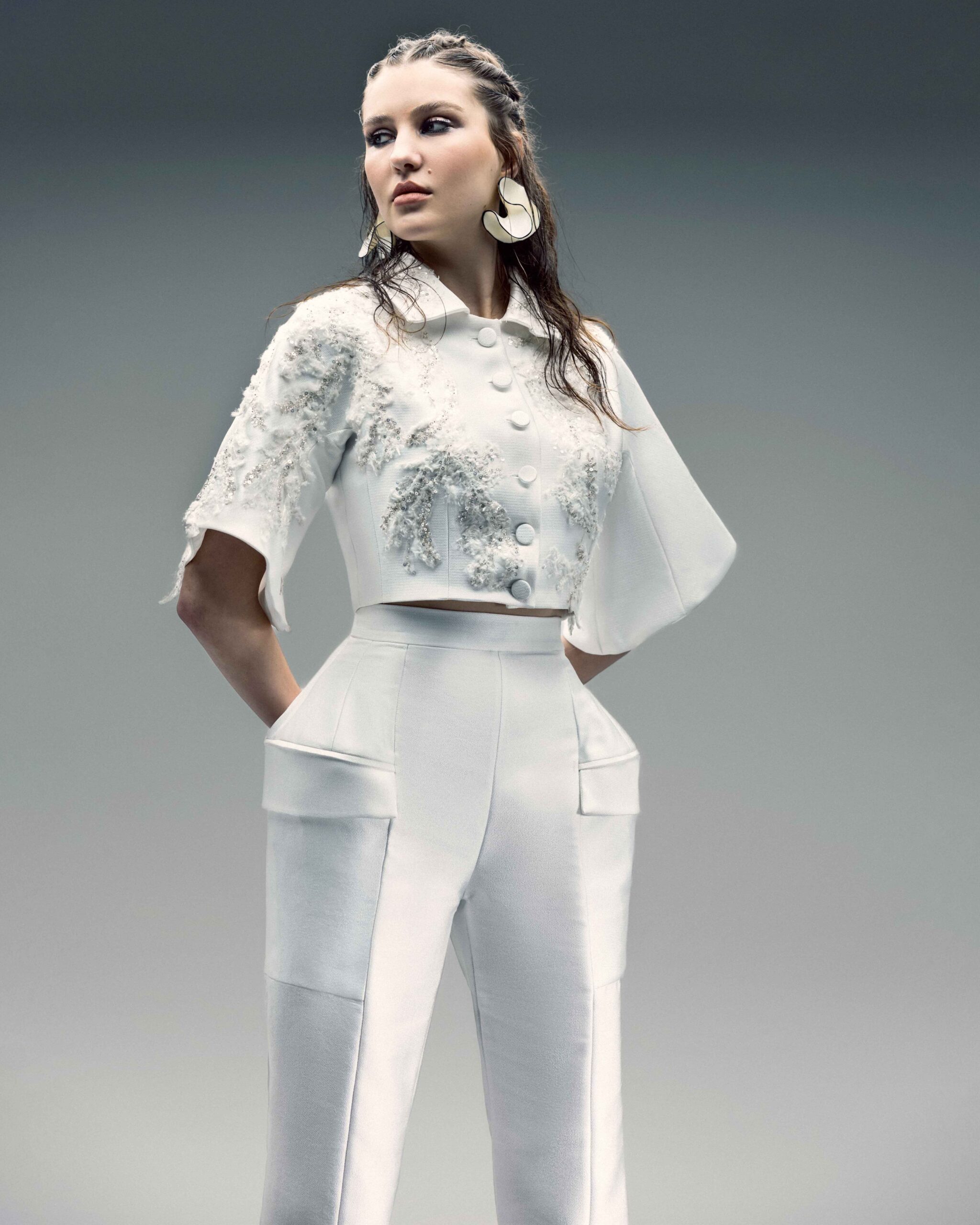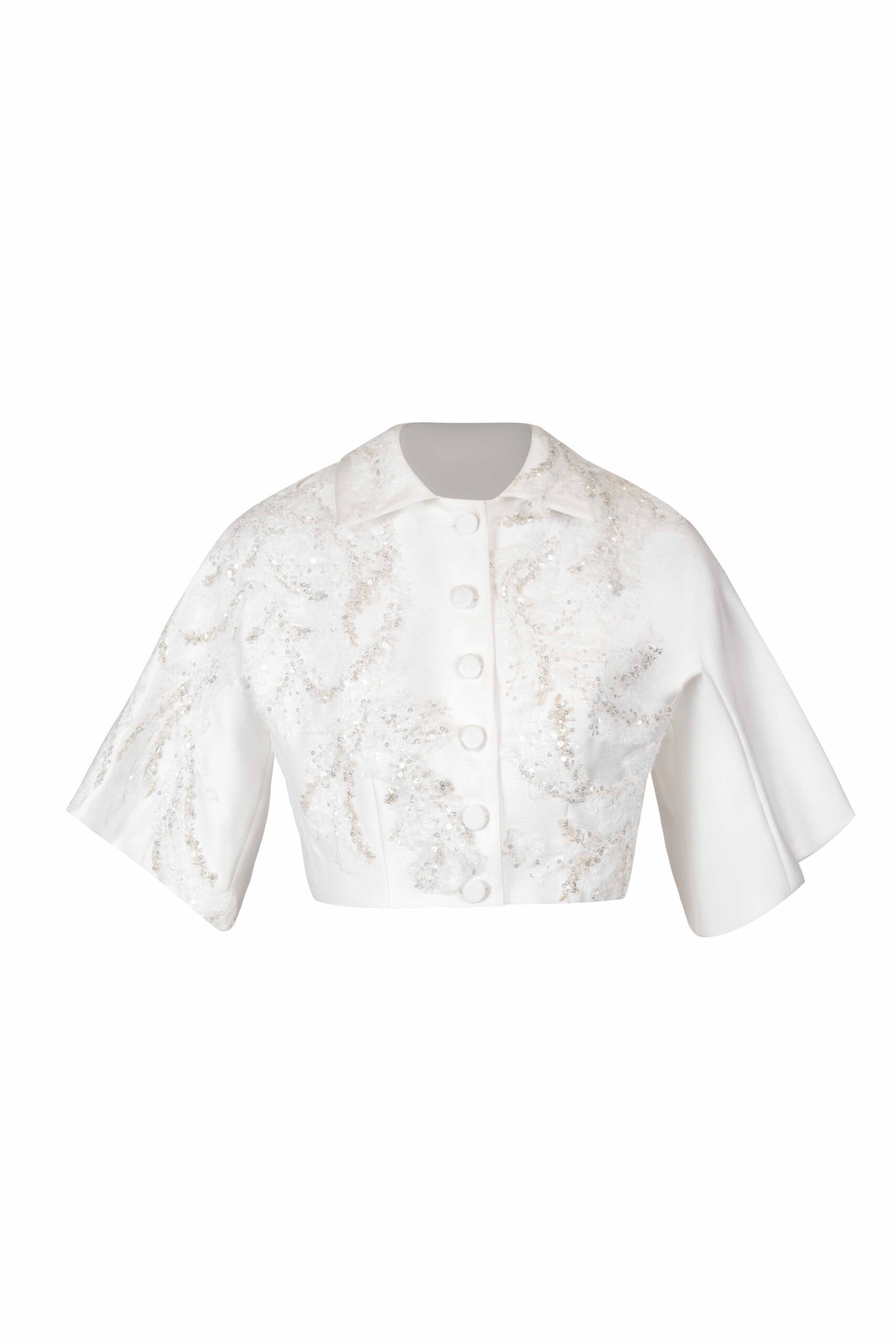 Exude elegance in our cropped ivory jacket with sculpted sleeves and delicate embroidery, blending structure and softness with timeless flair.