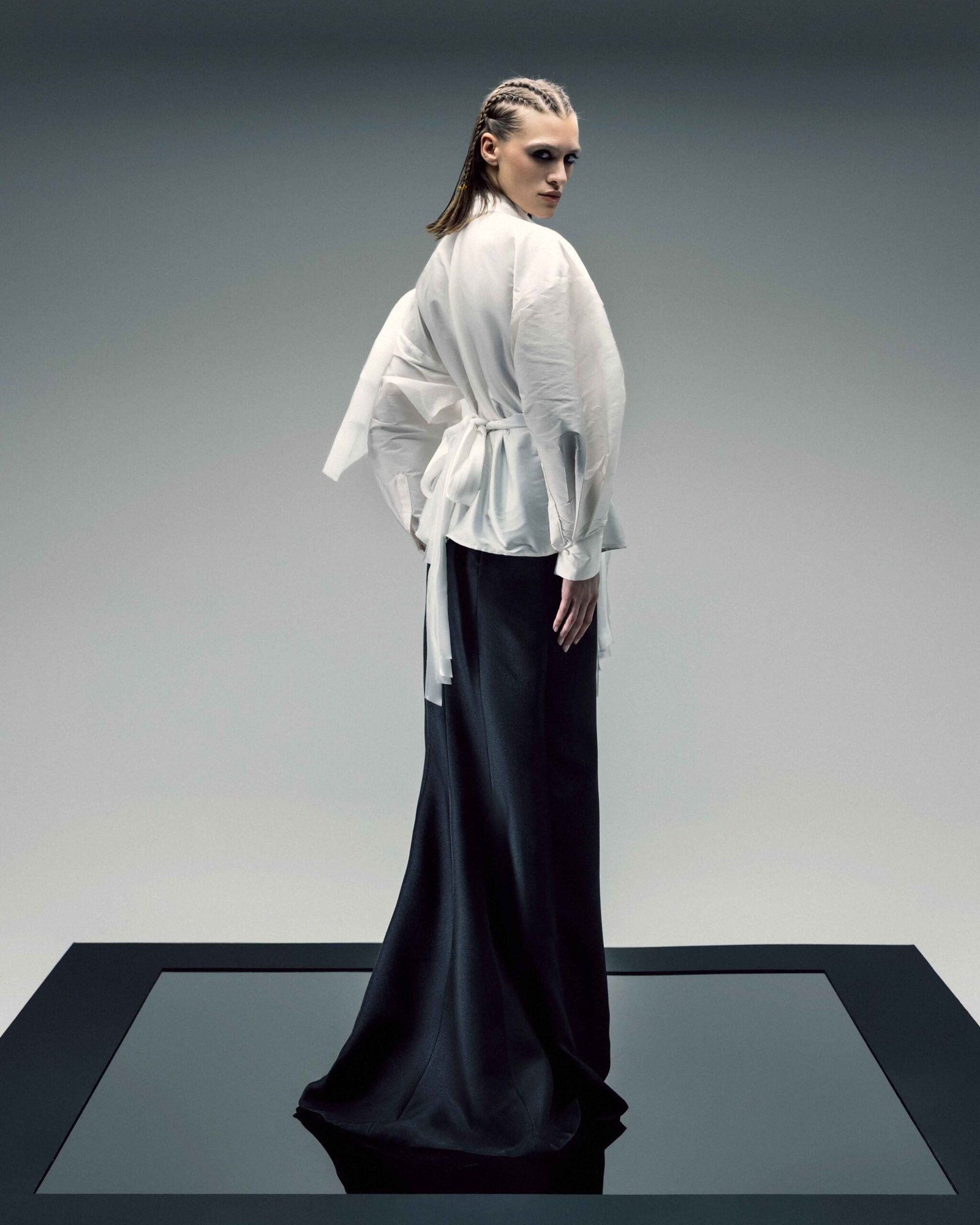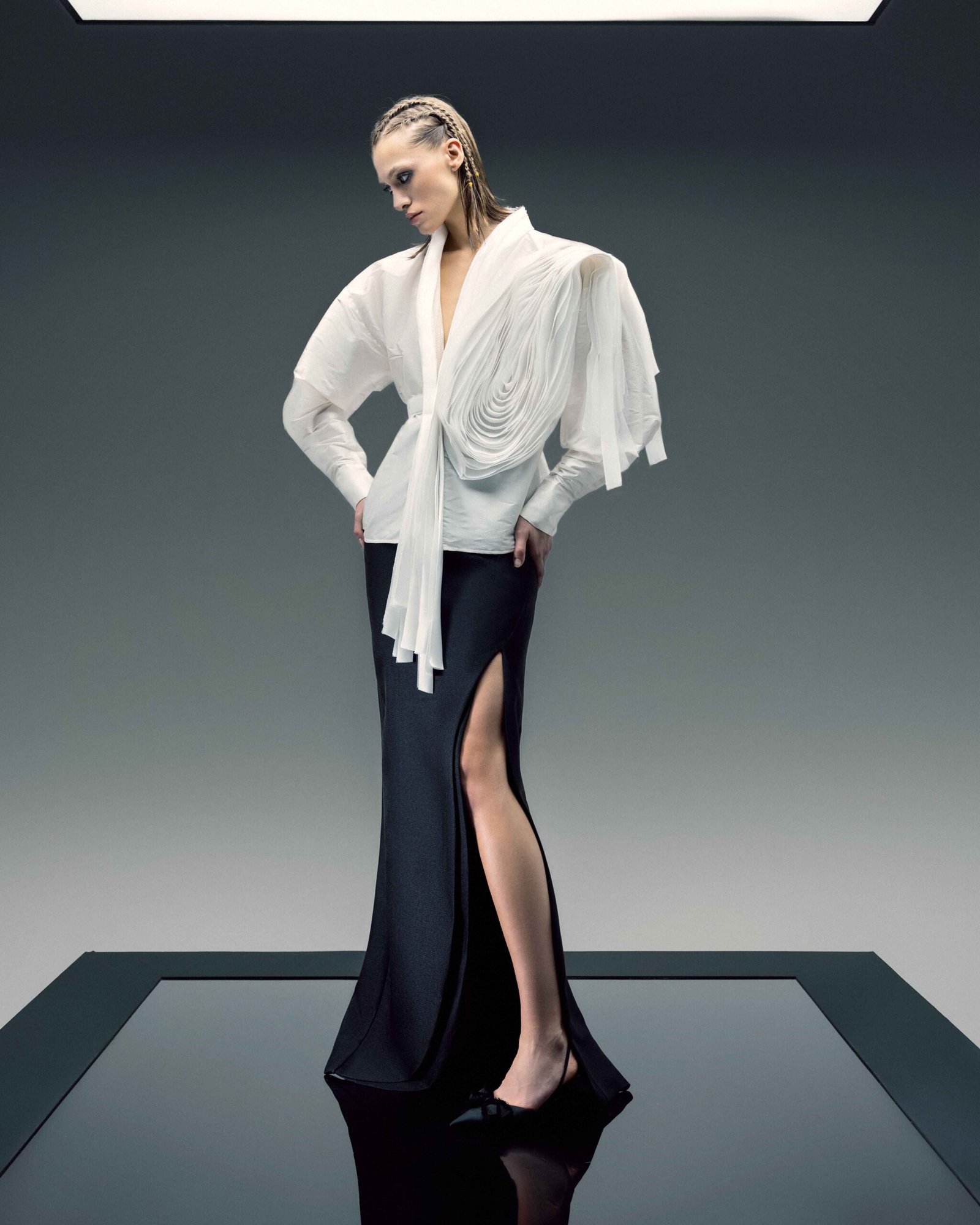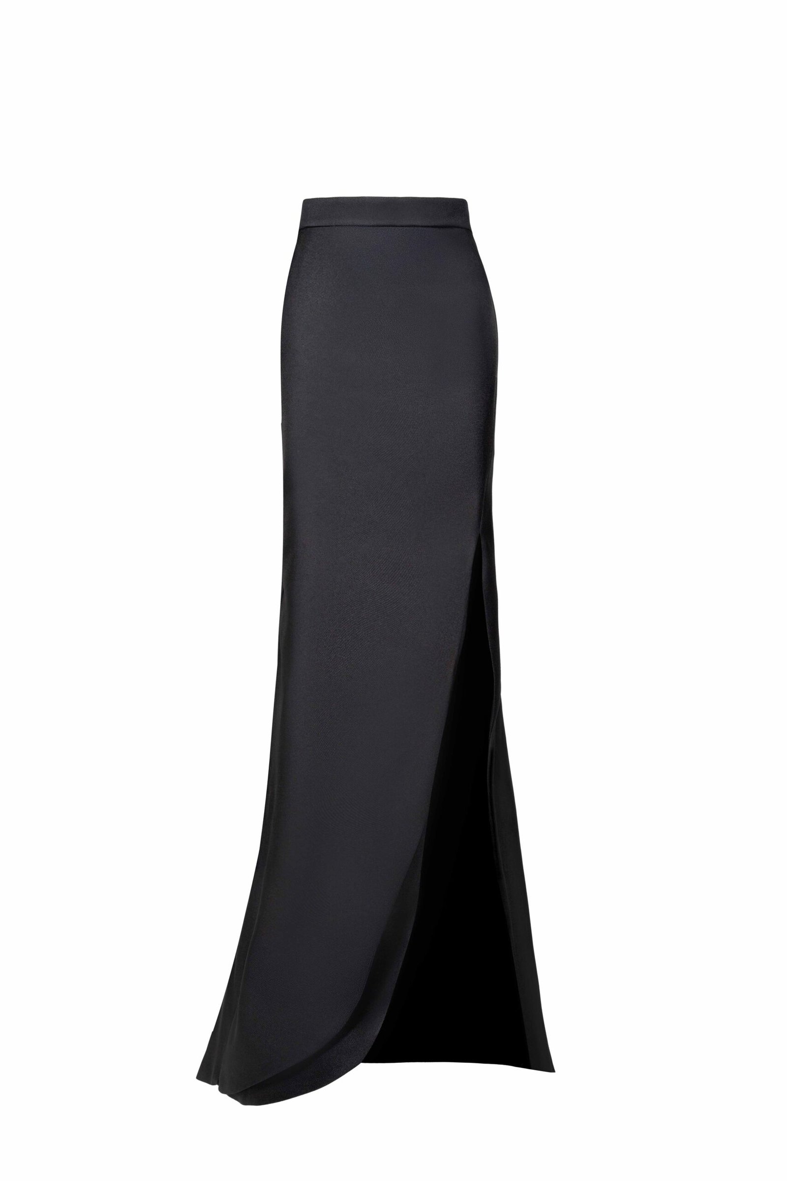 Sleek black Mikado maxi skirt features a flattering column silhouette and a bold layered high slit, blending classic elegance with modern allure.