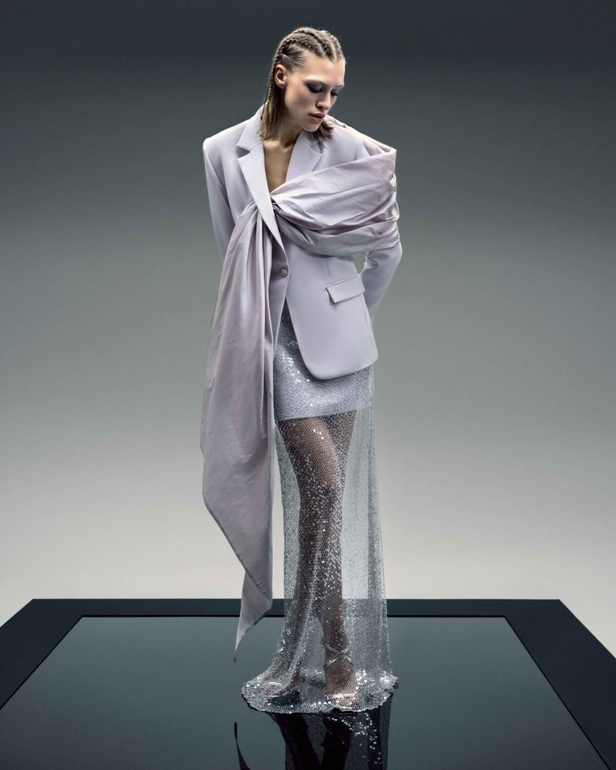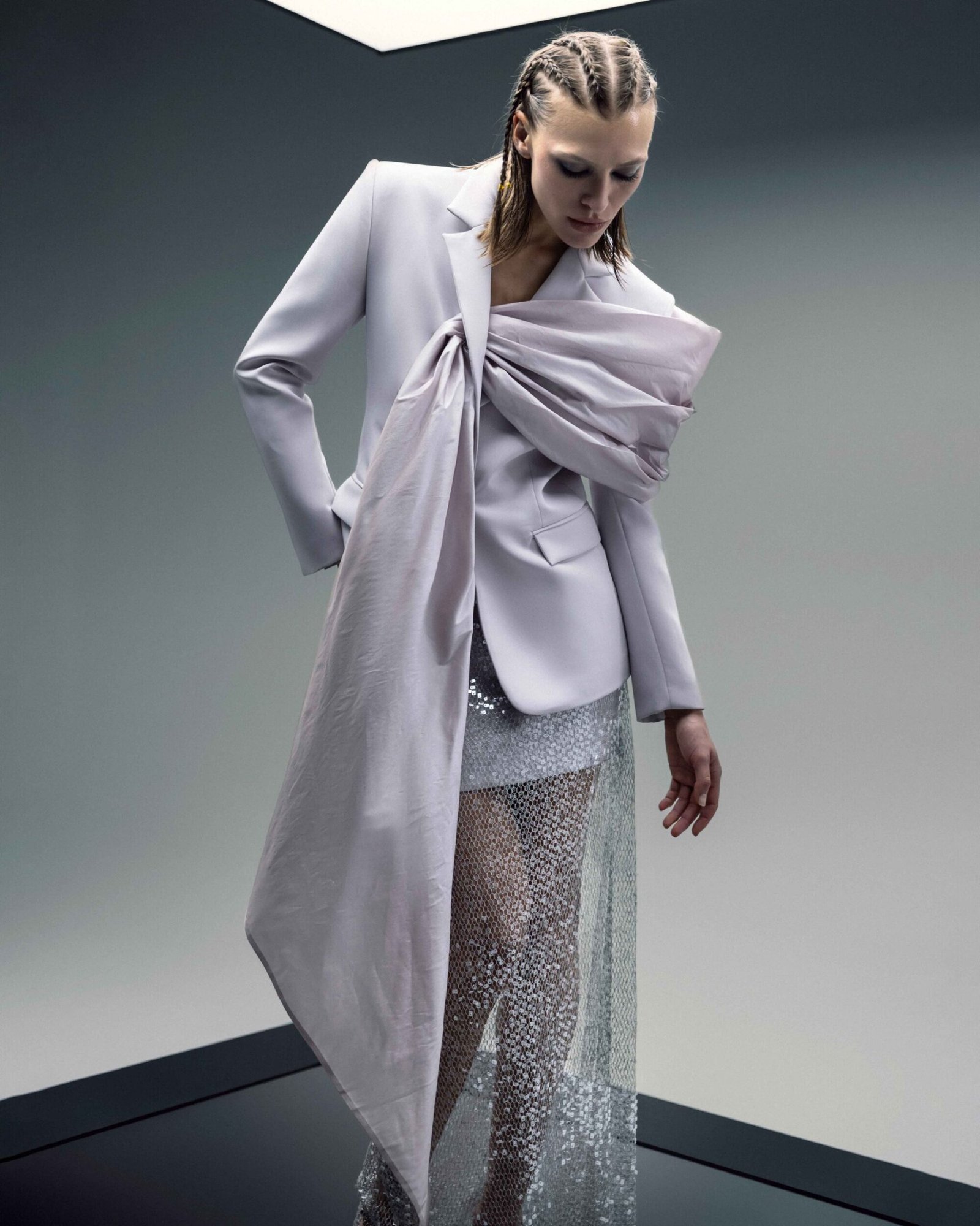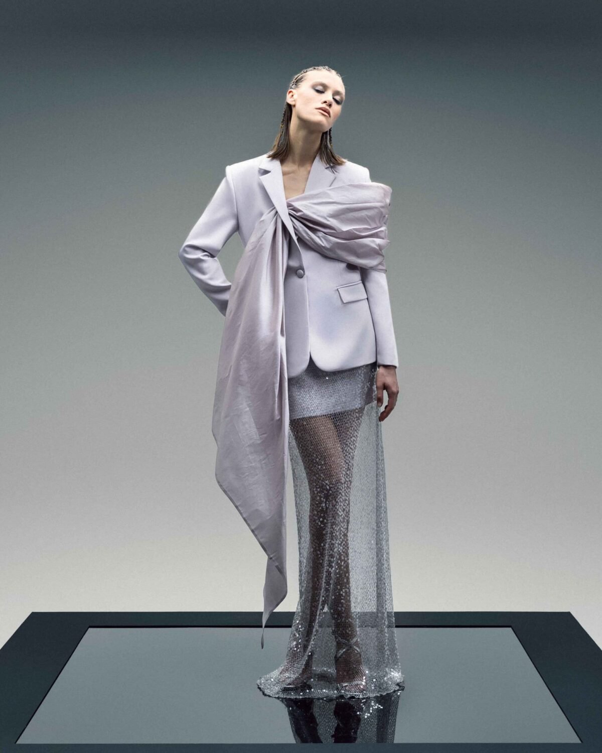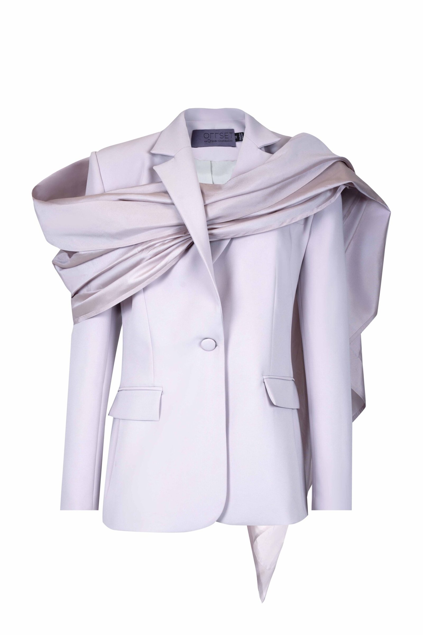 introducing our tailored old rose crepe jacket with a sculpted silhouette, taffeta shoulder draping panel, and a striking open-back detail.