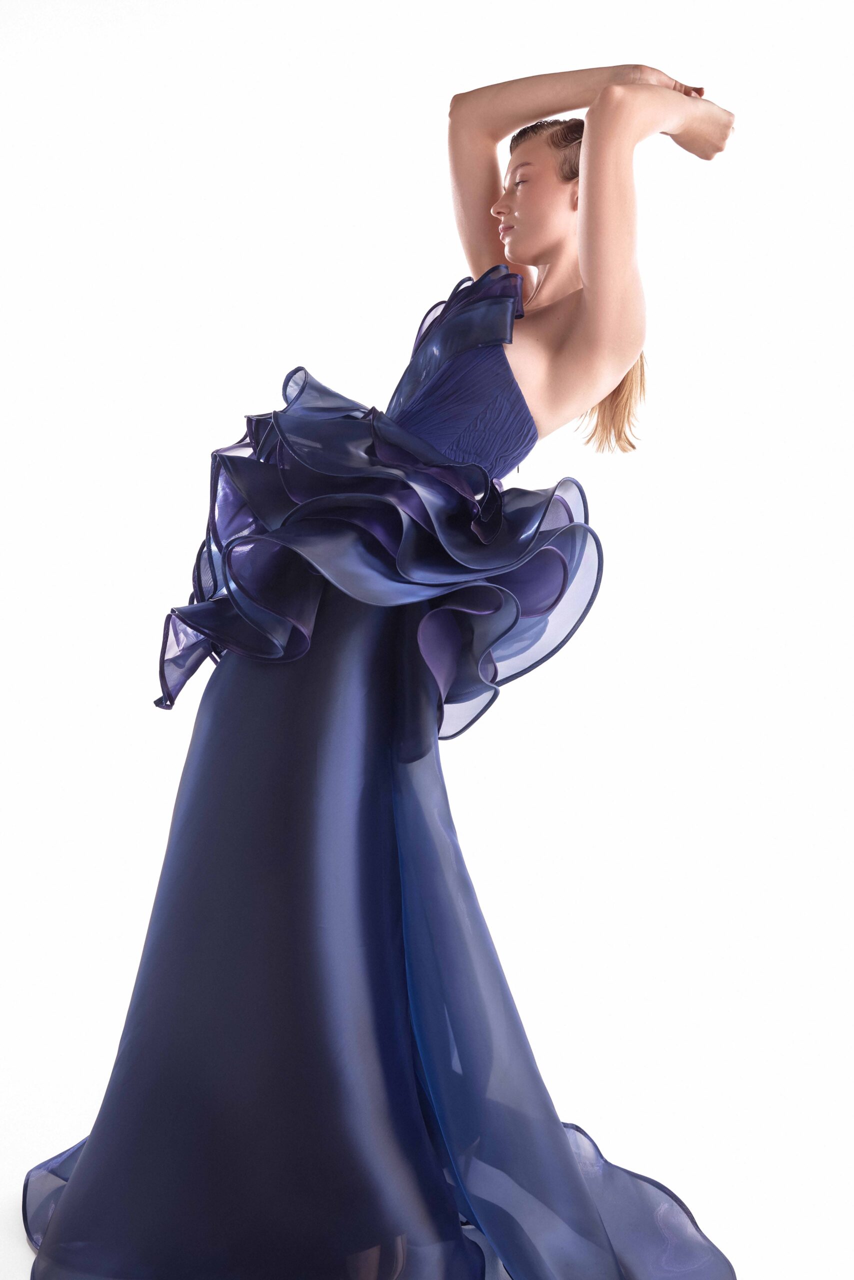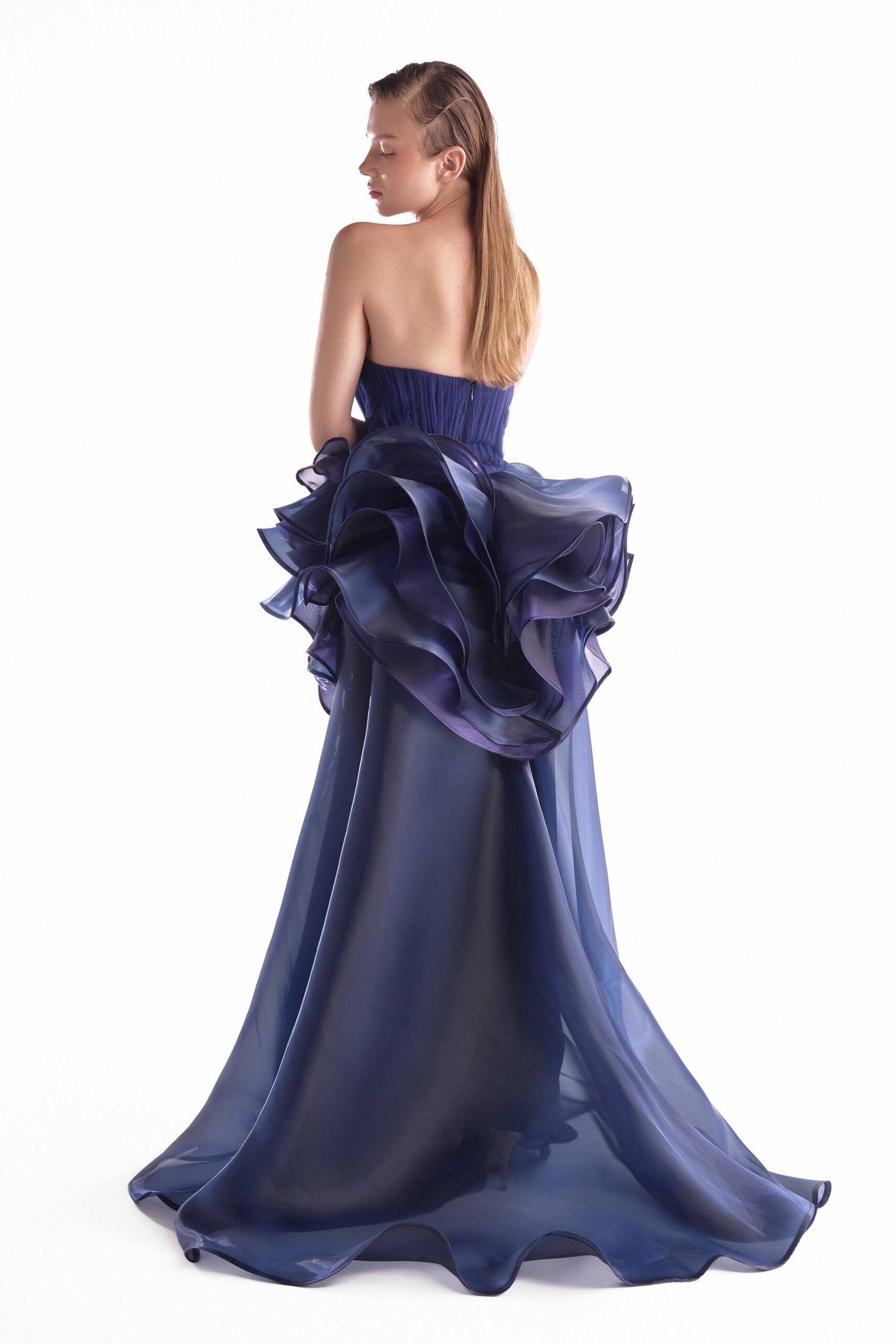 Dazzling in a strapless layered purple and navy fluid organza gown, featuring a dramatic sculptural bloom and a sheer cascading skirt.