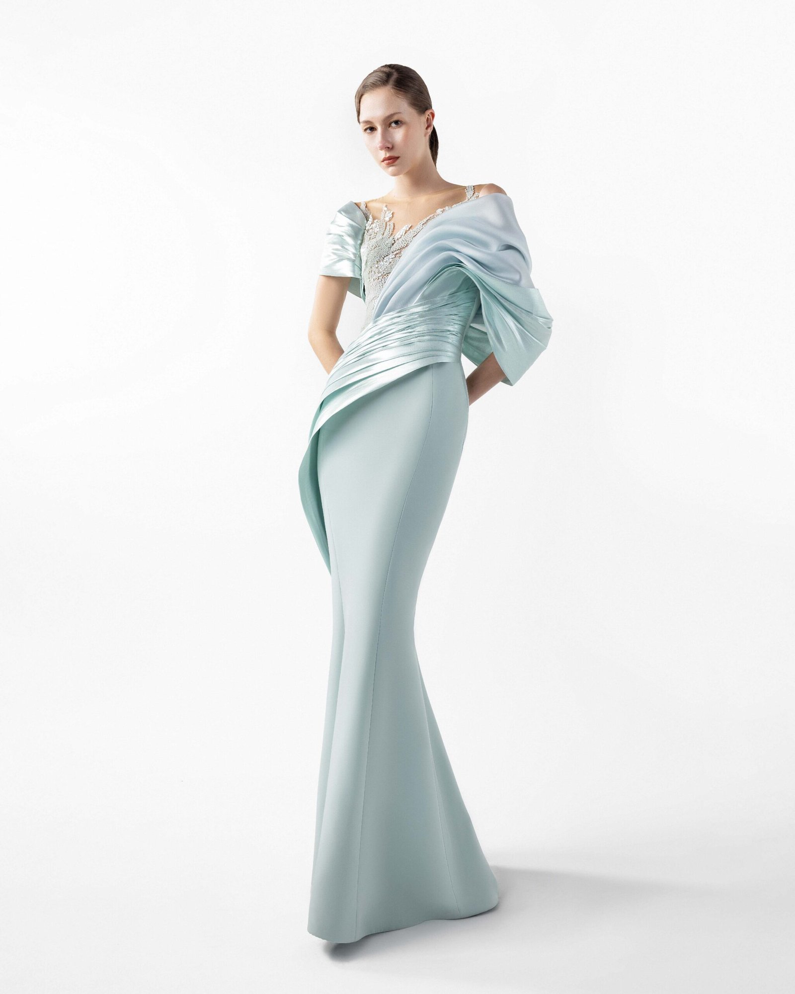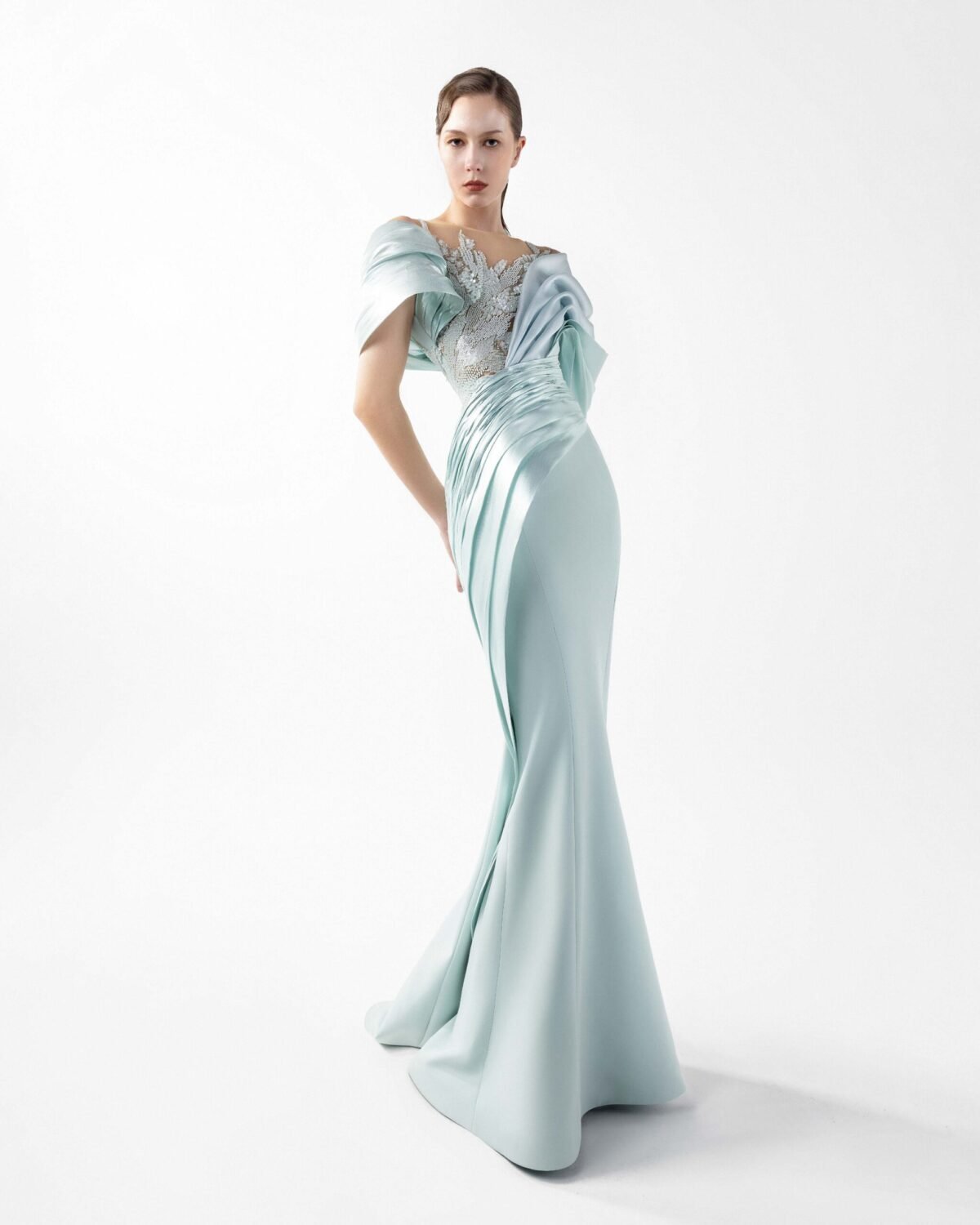 stun in a mint blue crepe mermaid gown with a lace illusion bodice, metallic draped shoulders, and a sculpted silhouette—elegant from every angle.