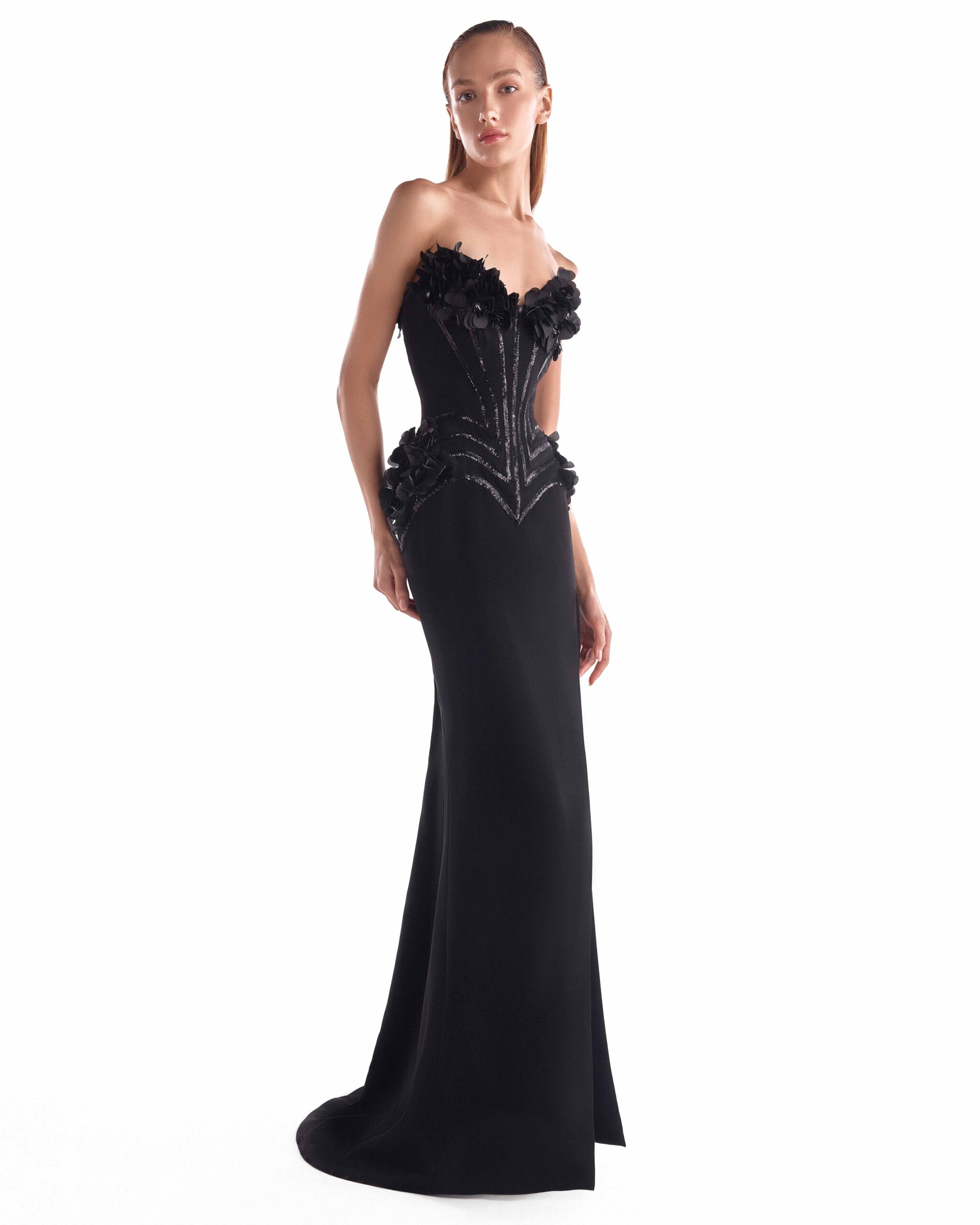Elegant black strapless heart shaped bust mermaid gown with a sculpted sequinned corset and handcrafted 3D floral appliqués.