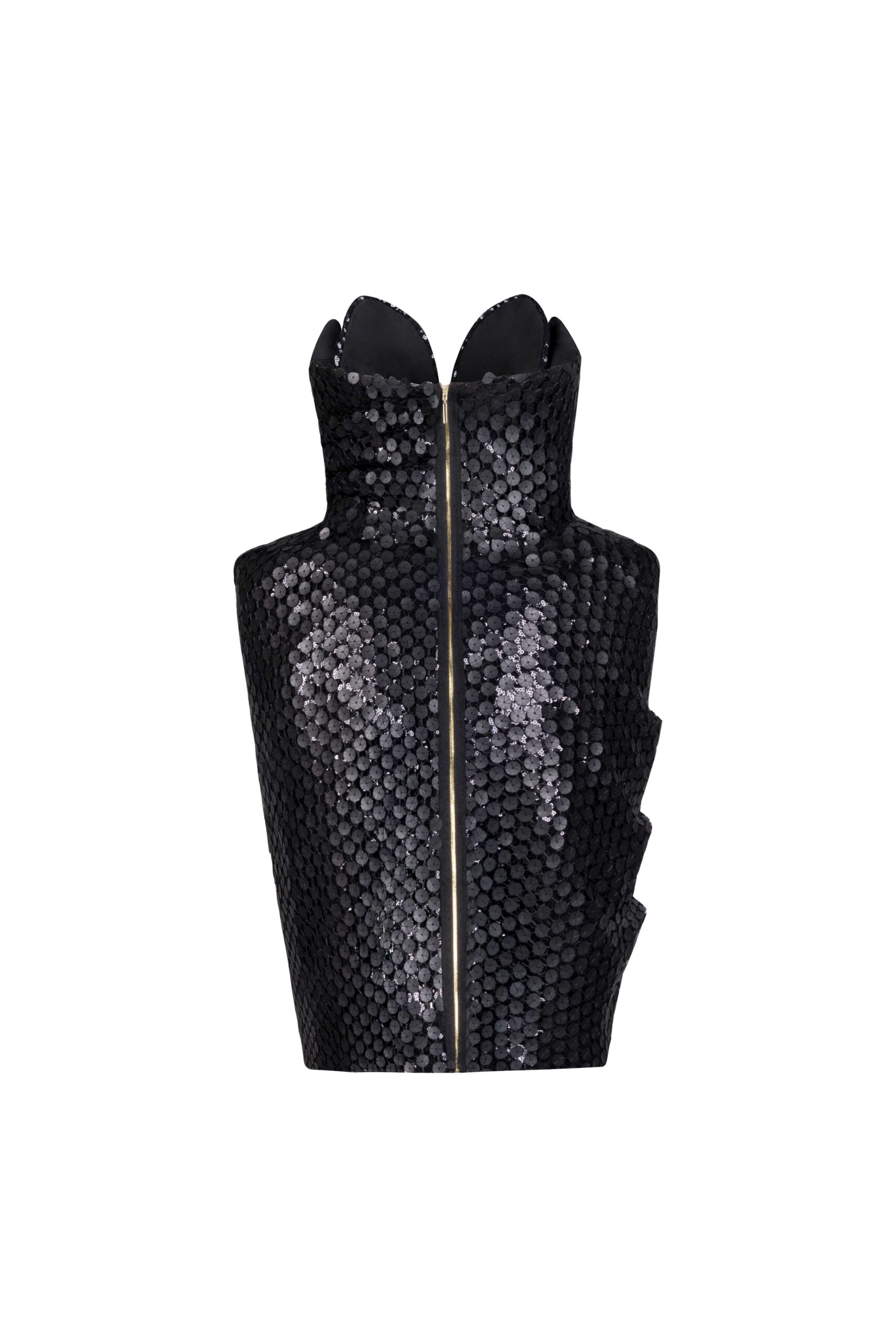 A strapless black sequin mini dress featuring sculptural draping and a daring slit. Bold, luminous, and unapologetically feminine.