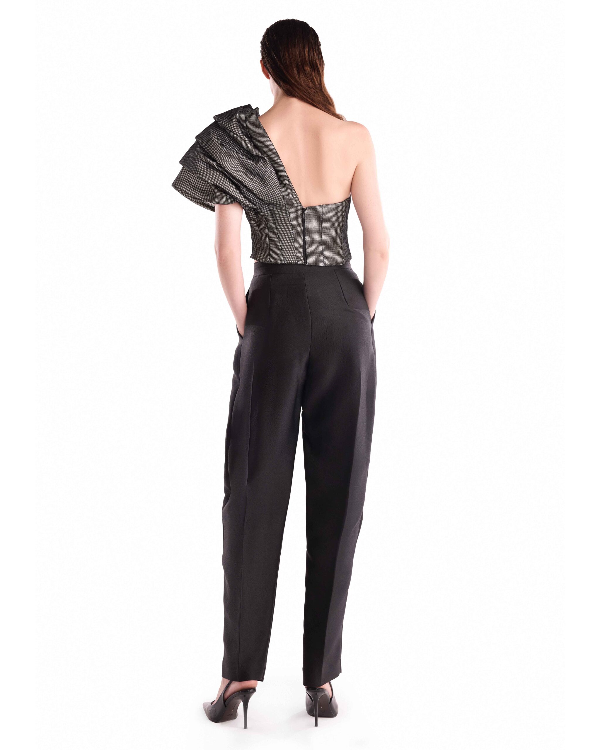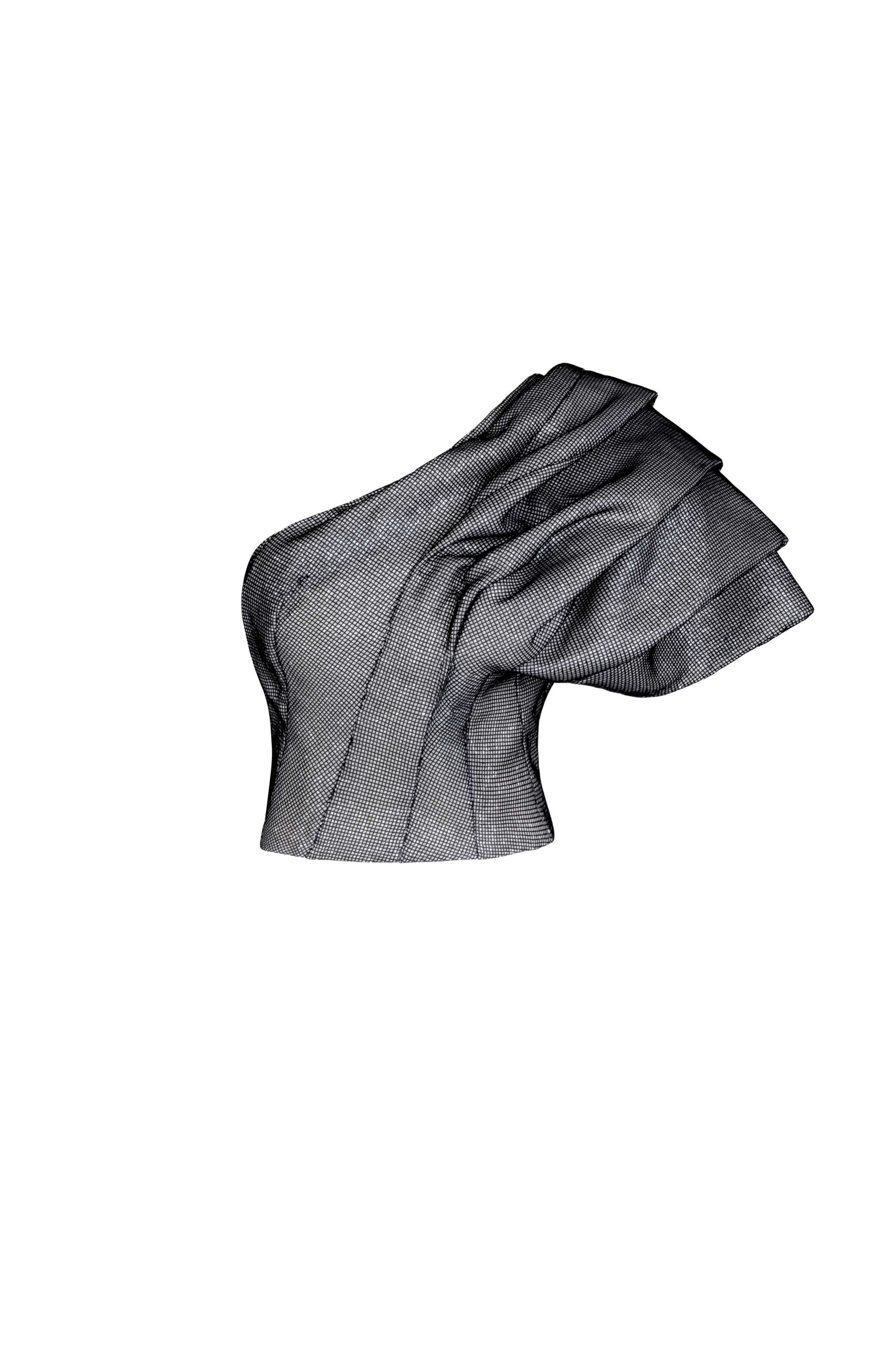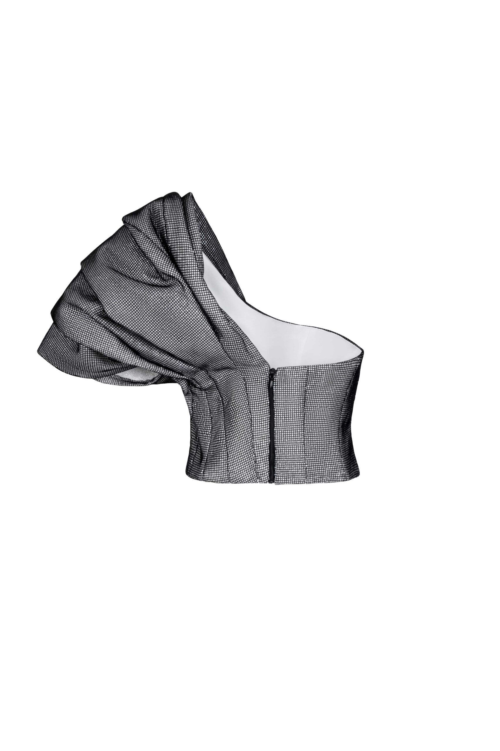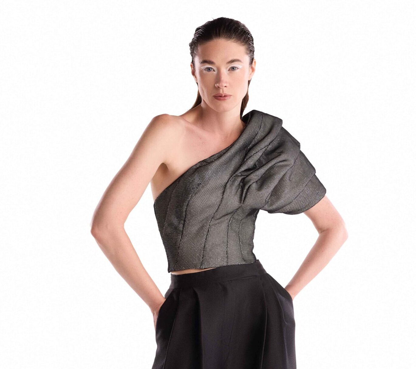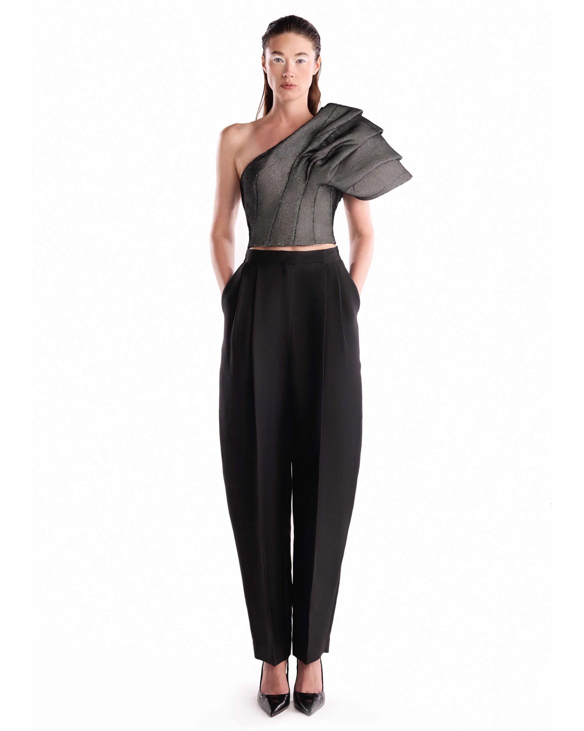 One-shoulder metallic jersey top featuring sculptural shoulder layering and a sleek, fitted silhouette.