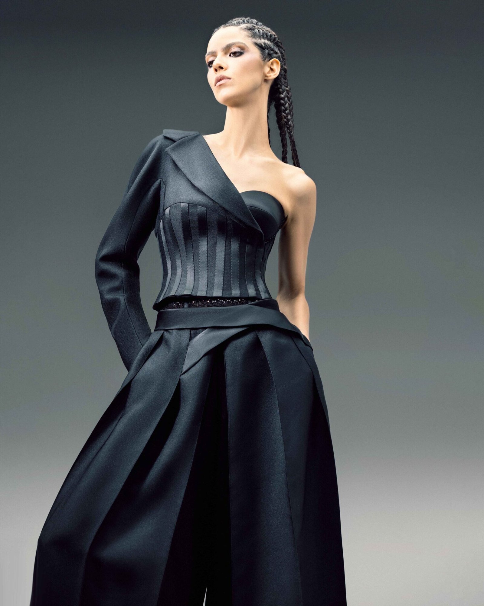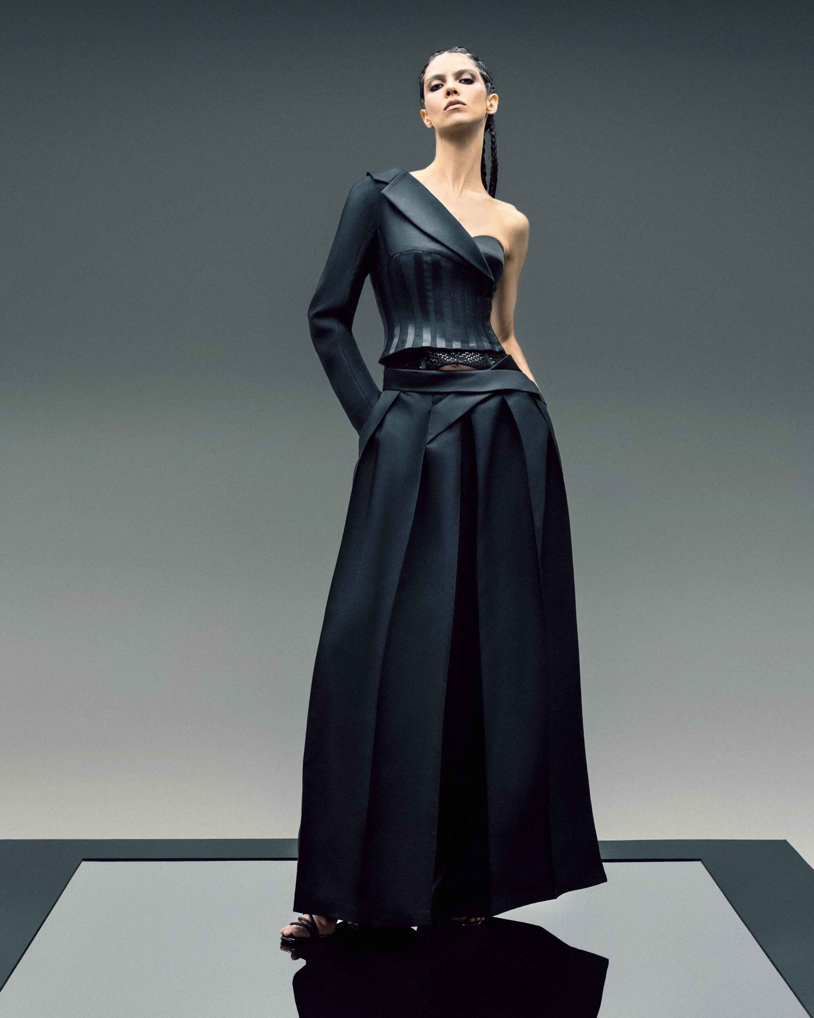 One-shoulder Mikado piqué jacket with integrated corset and Razmir striping—sharp, sculptural, and confidently bold.