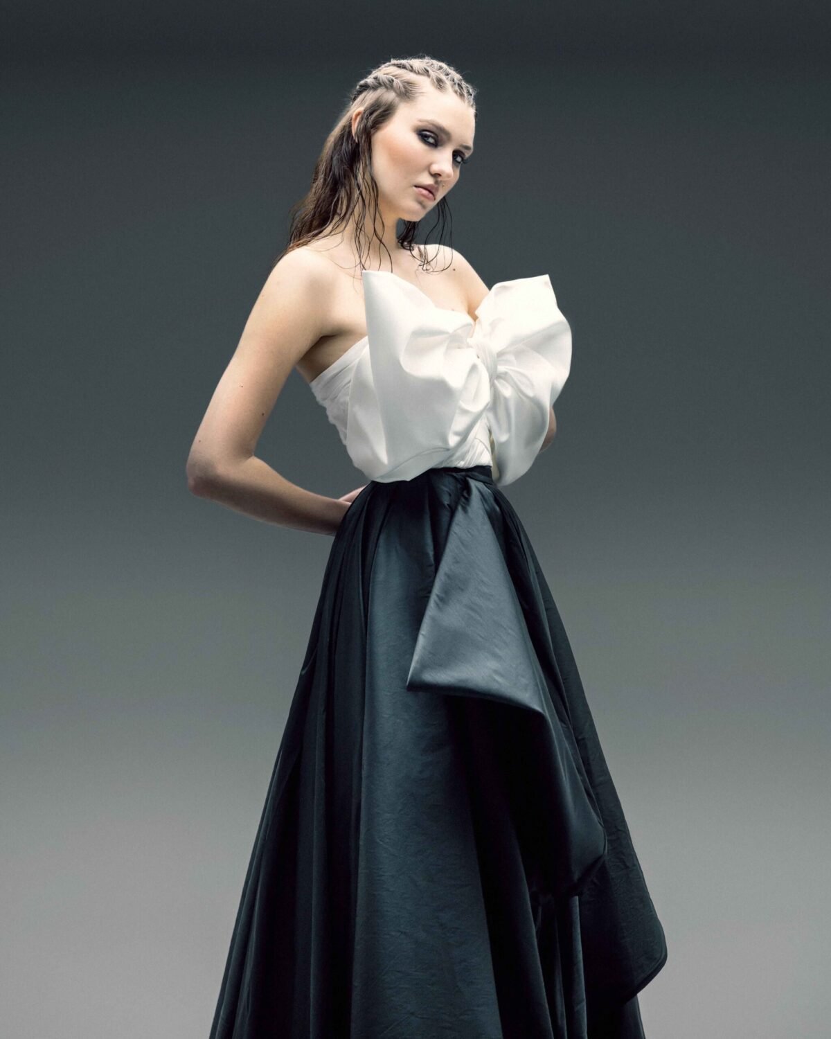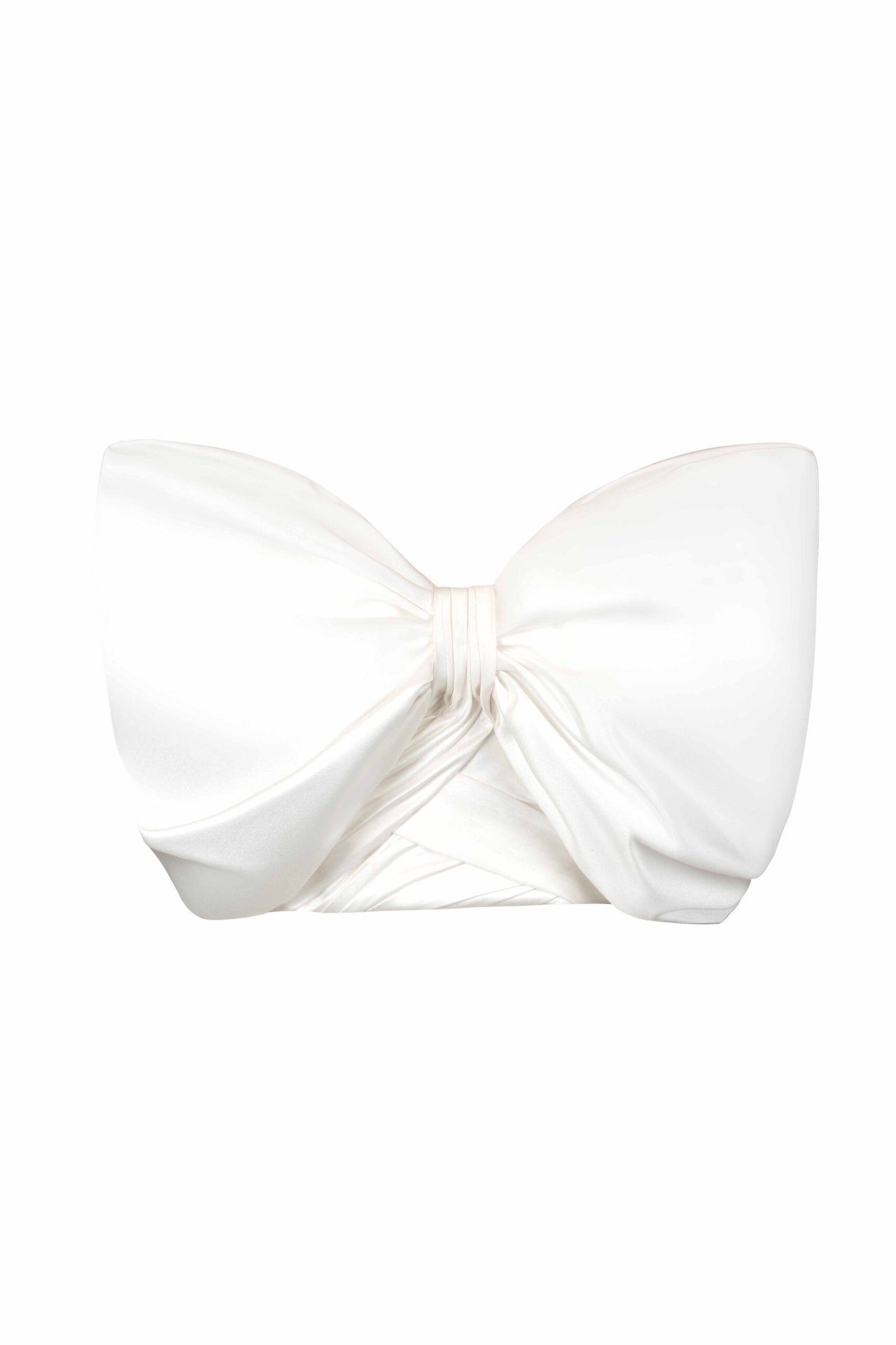 Striking off white Corset featuring an exaggerated, sculptural bow design, creating a dramatic and feminine statement piece.