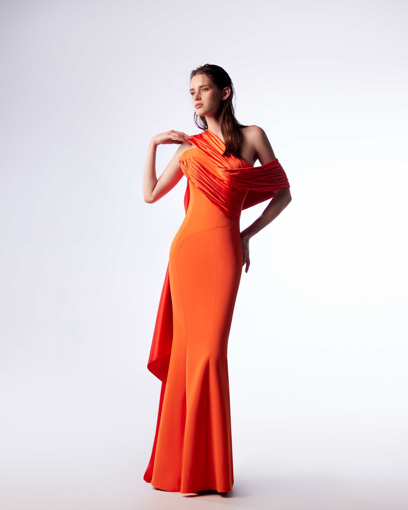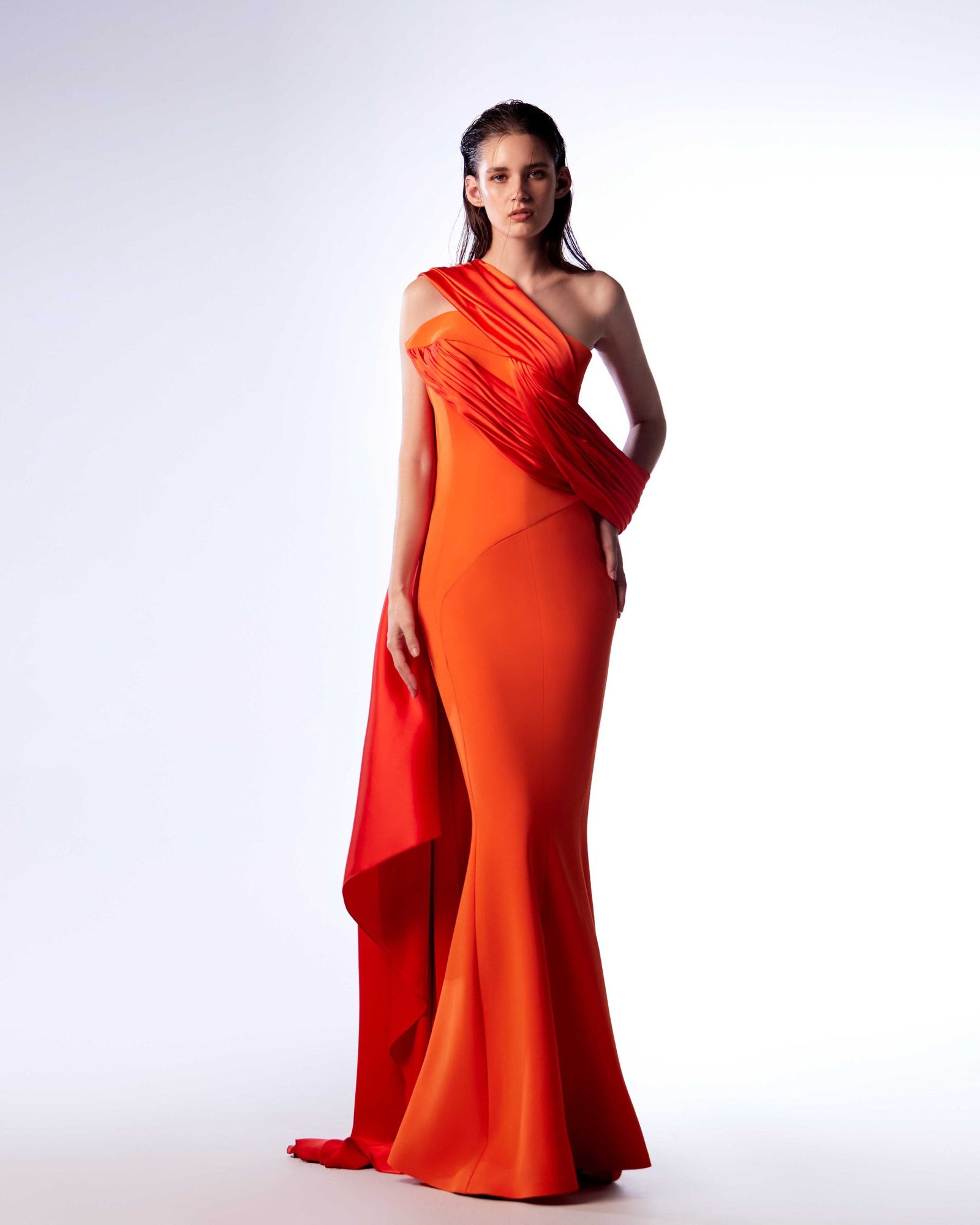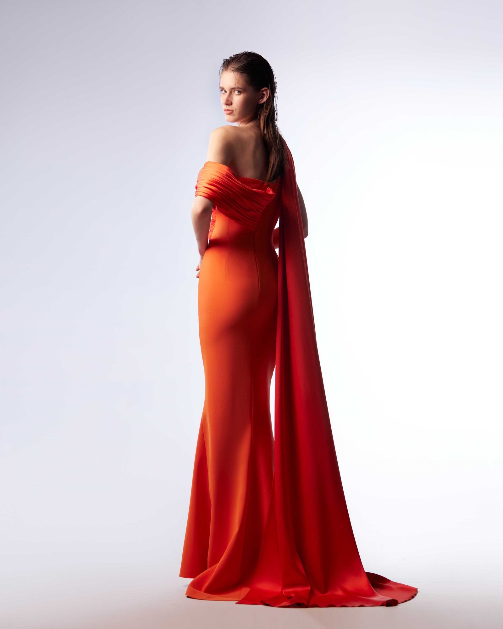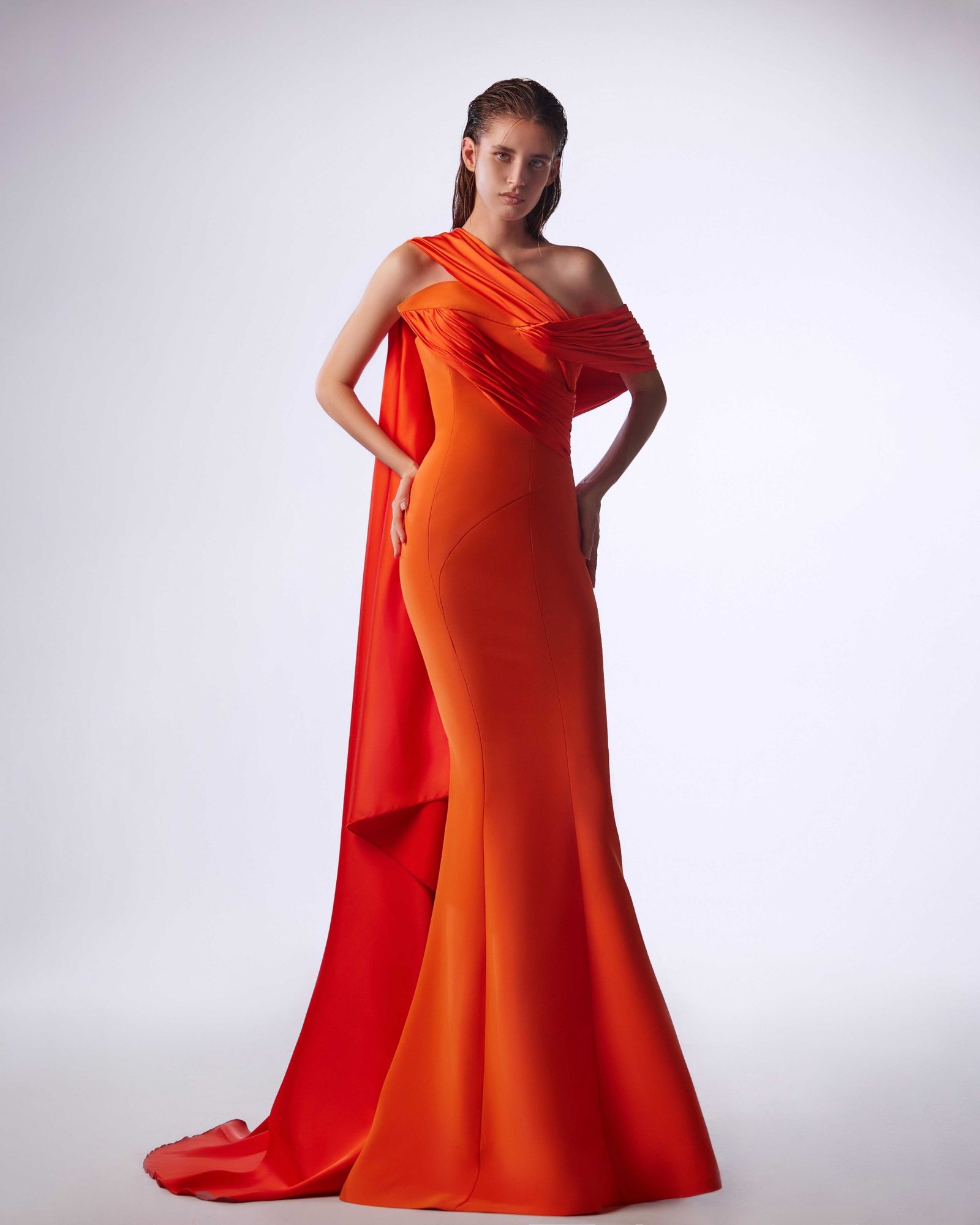 Radiate in this orange mermaid evening dress with exquisite satin draping and a one-shoulder cape design. The perfect blend of glamour and elegance for any standout occasion.