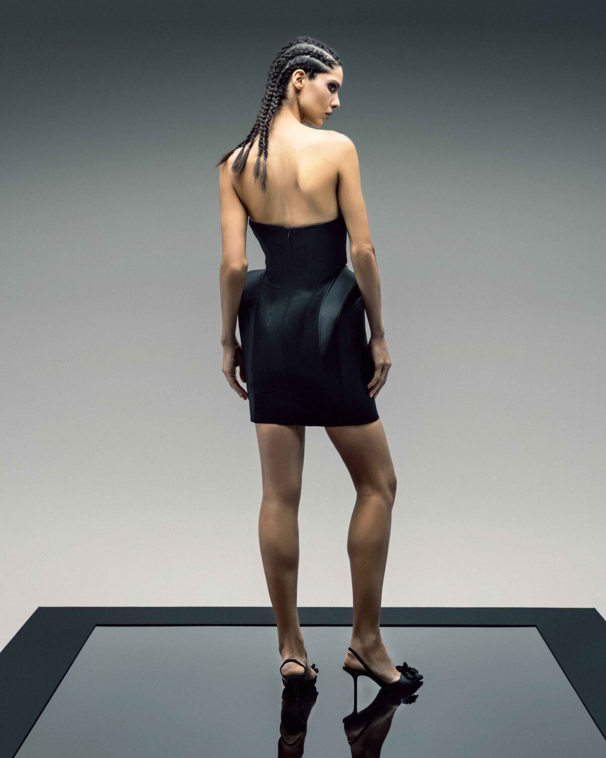 Crafted from luxurious Razmir, this corseted mini dress features an elegantly sculpted hip design, combining classic structure with a modern, daring silhouette.