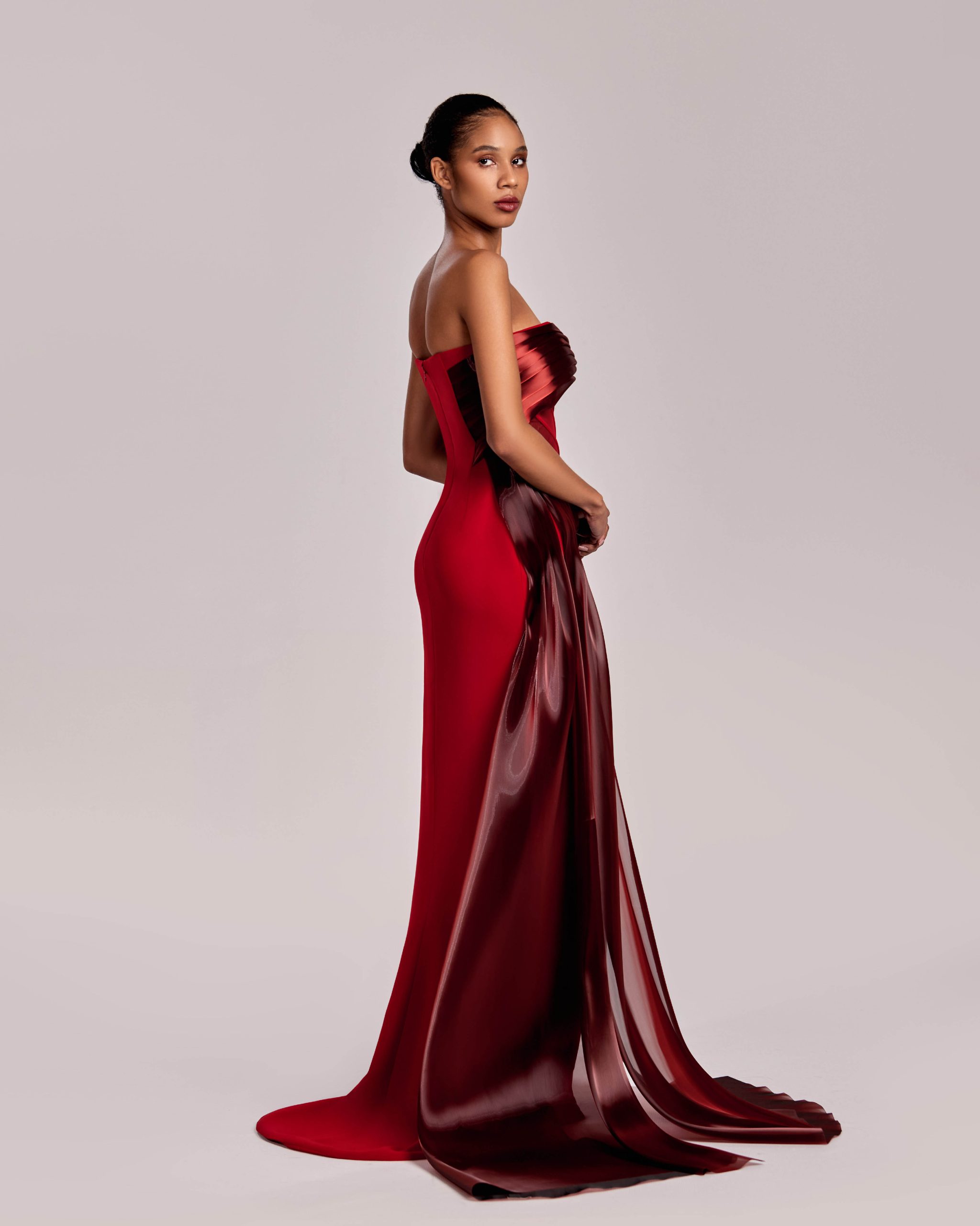 A striking red gown with a shiny organza and sheer mesh corset bodice, asymmetrical draping, and a high slit. The strapless design and flowing organza add elegance and allure, making it perfect for formal events.