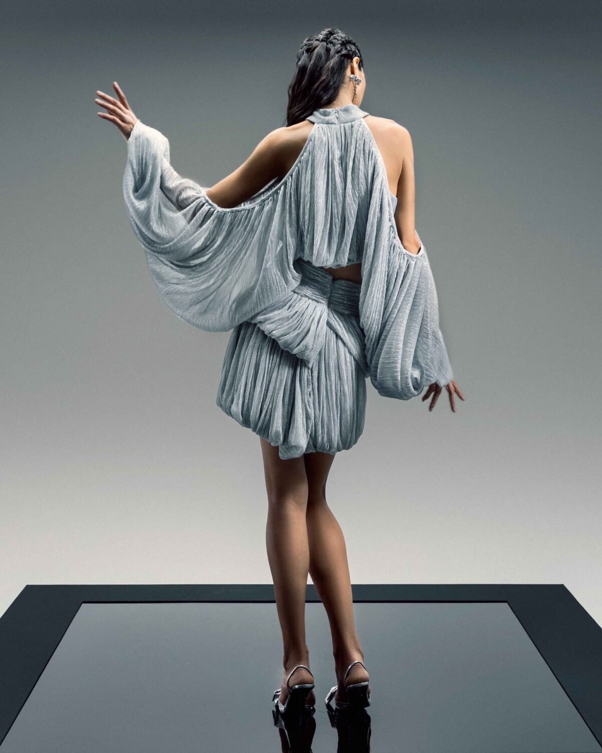 Mini skirt in pleated silver lamé, defined by sculpted drapes and a structured high waist.