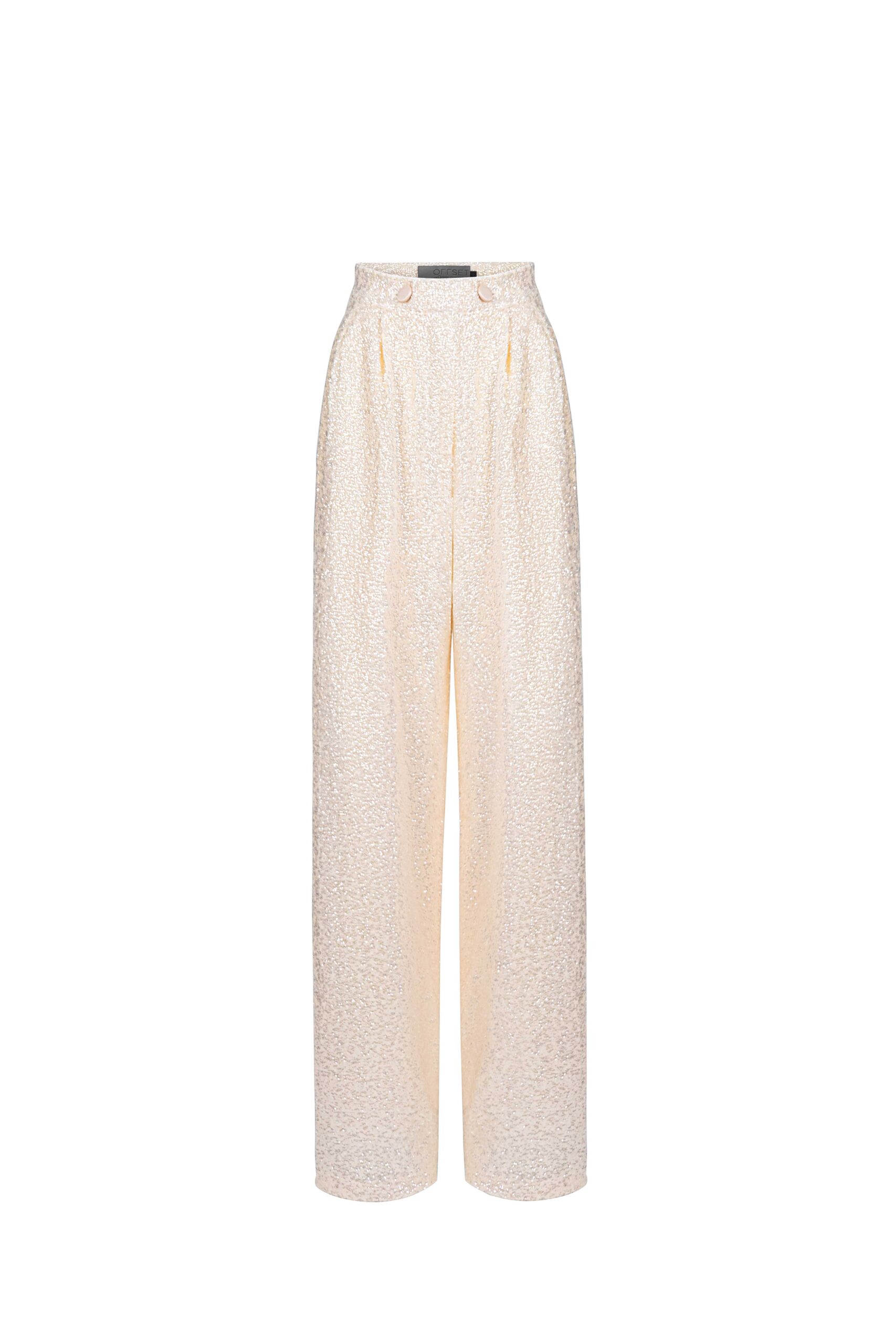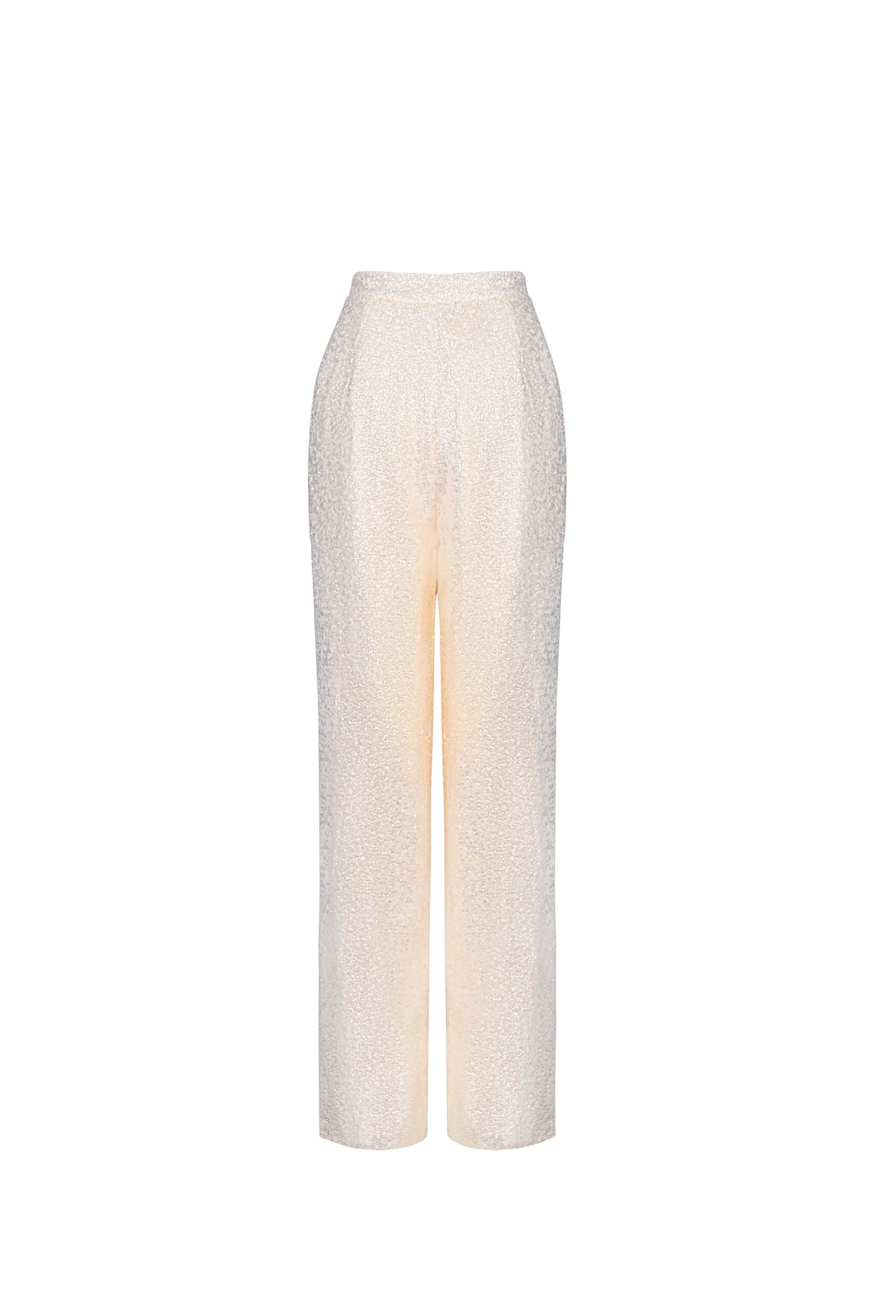 Straight-leg sequined lace pants with an elongated silhouette.