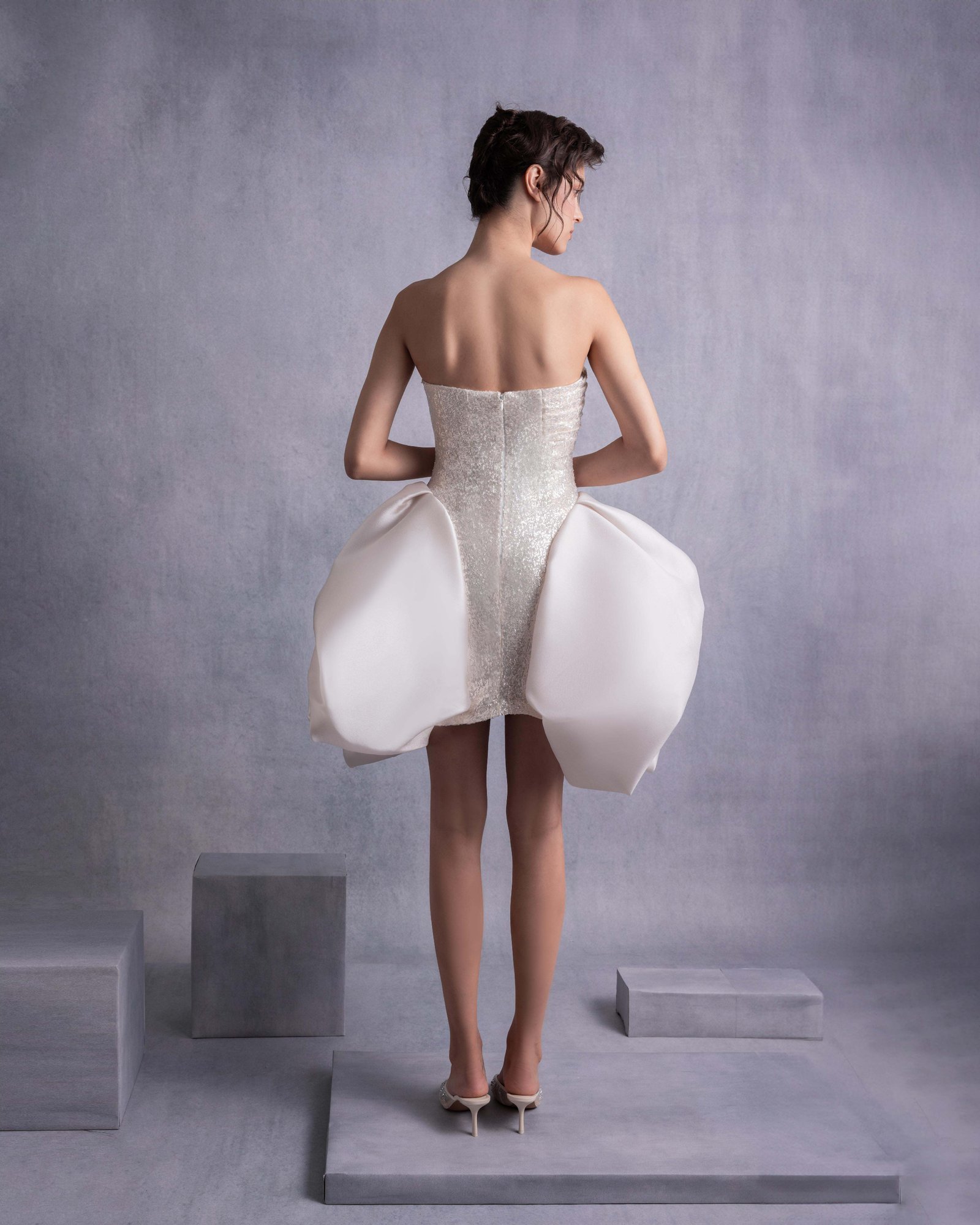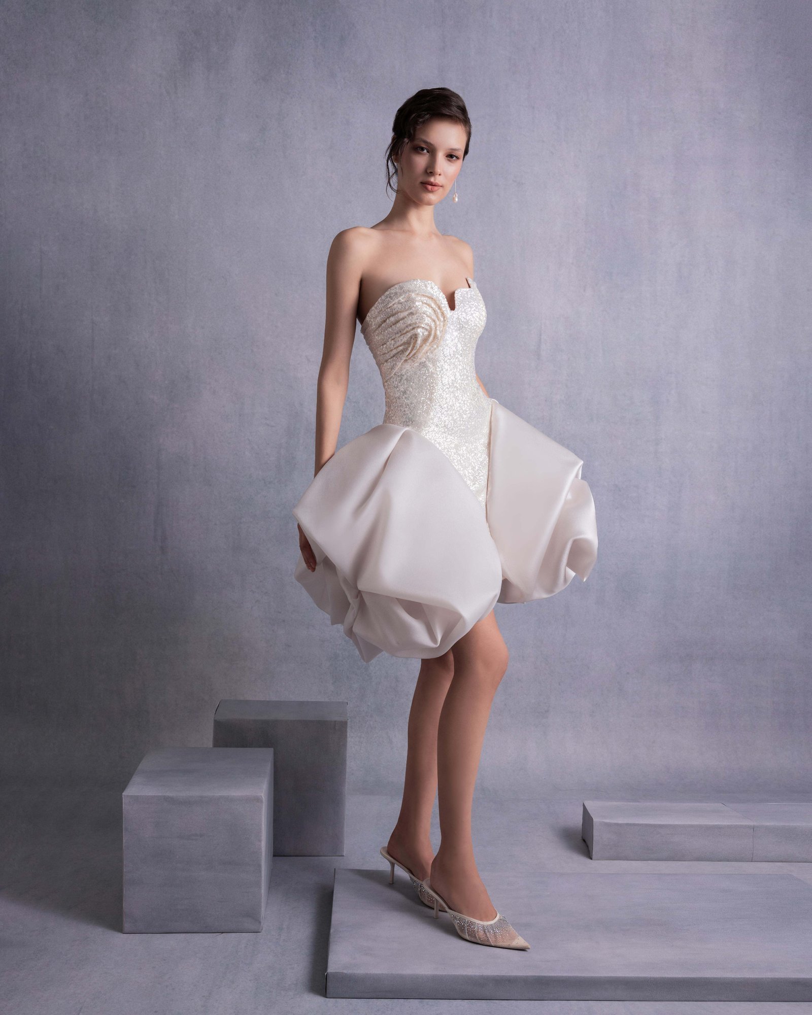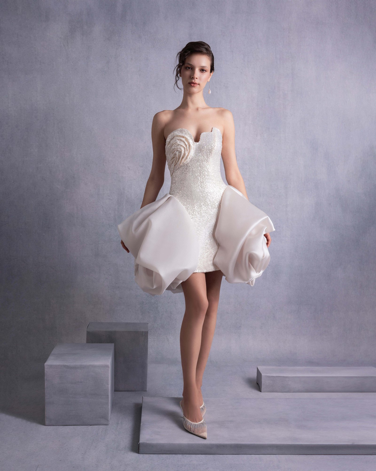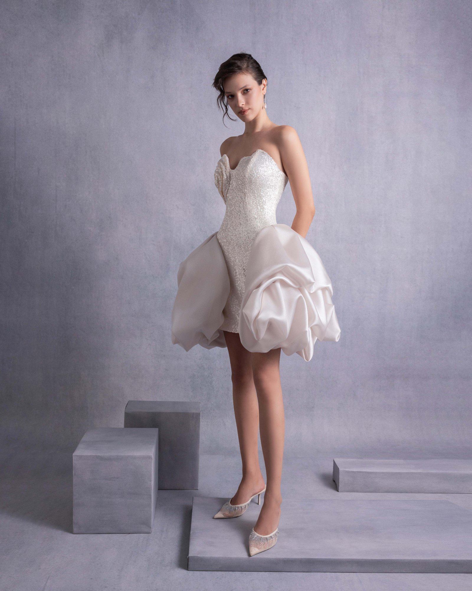 Luxurious gold champagne sequins mini dress featuring a carefully crafted angular bust with 3D manipulation and a dramatic puffy organza skirt overlay, perfect for glamorous occasions.