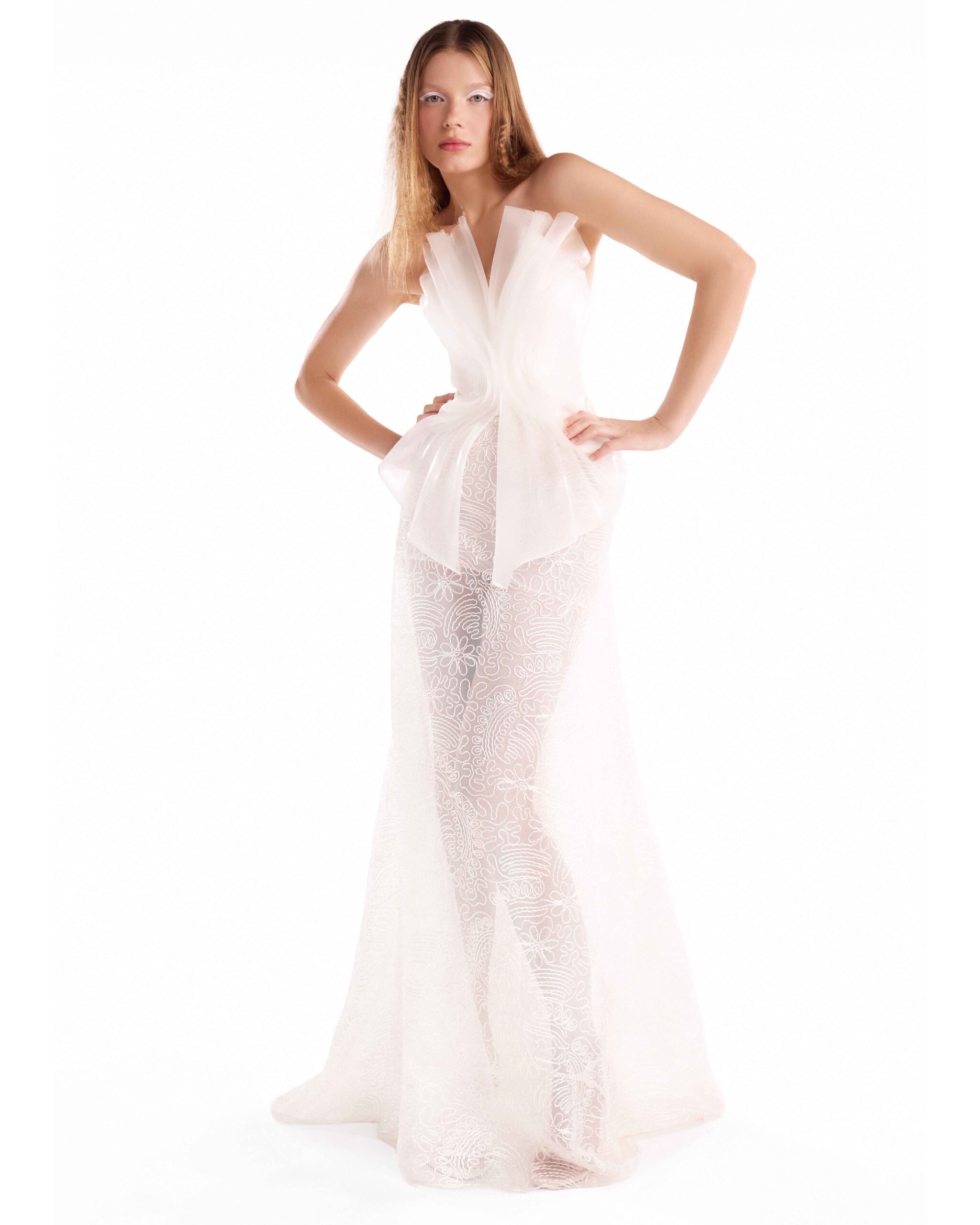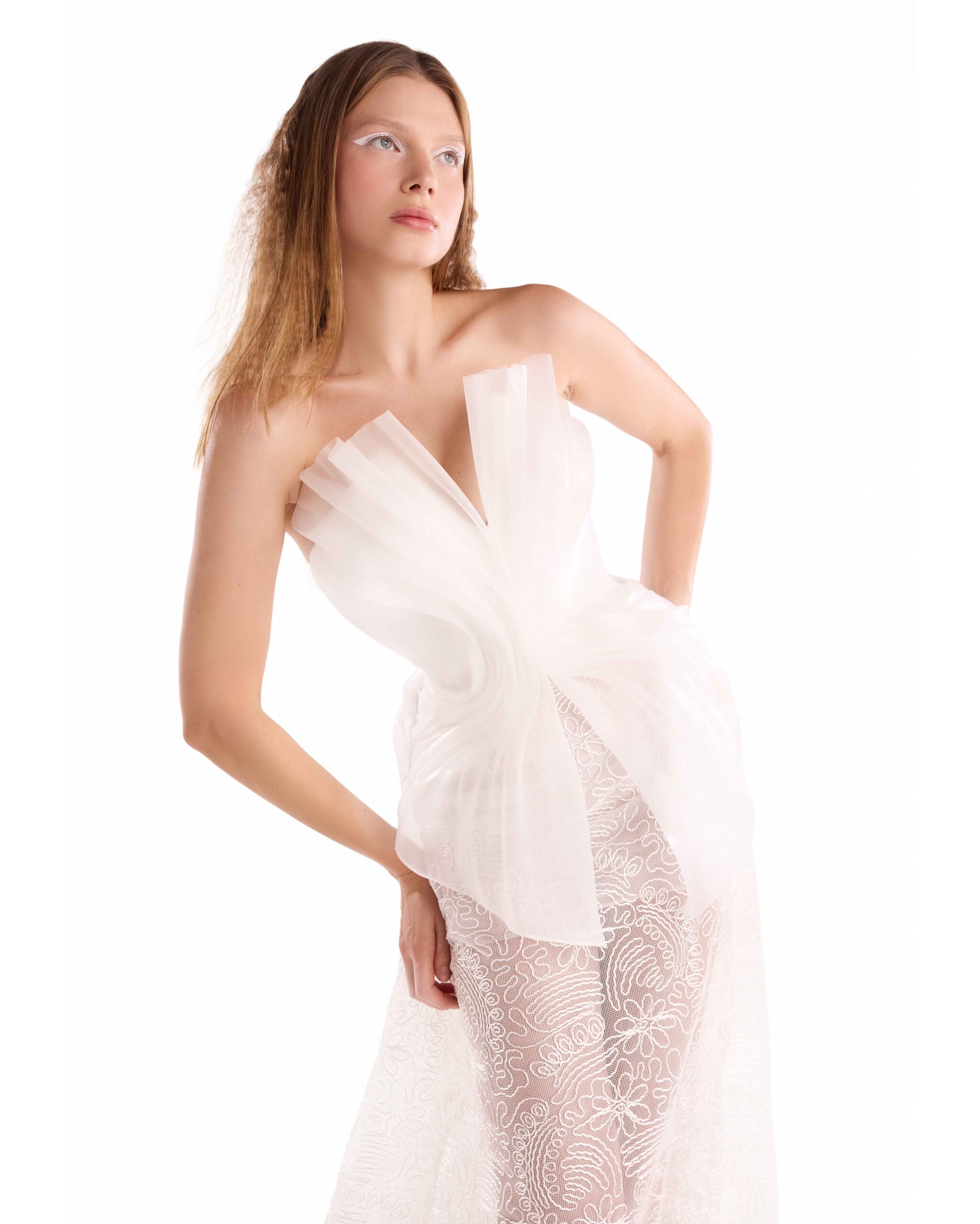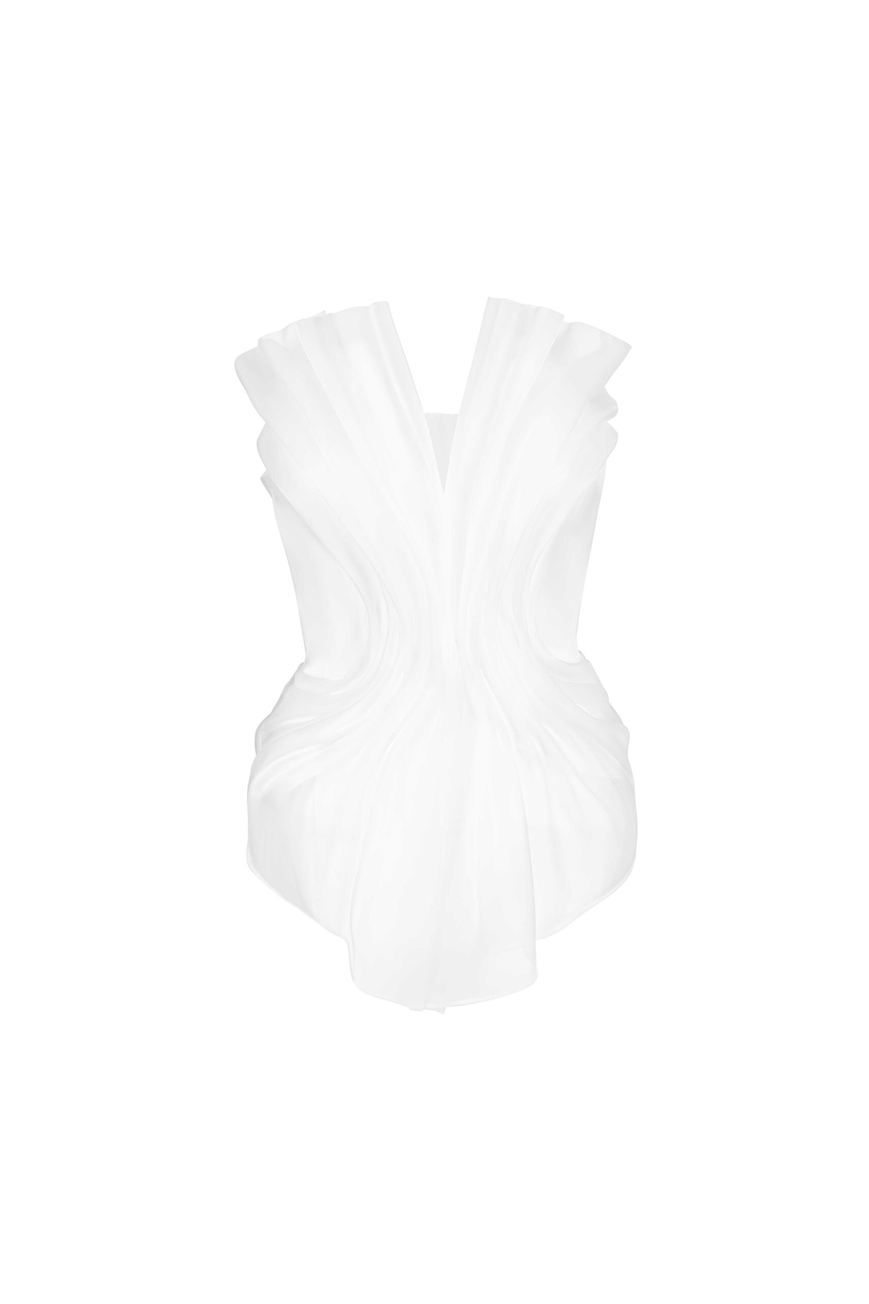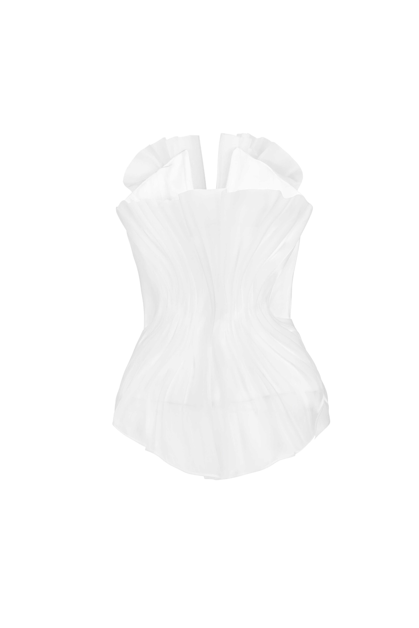 Strapless crepe top with sculptural liquid organza draping and a fluid, contoured silhouette.