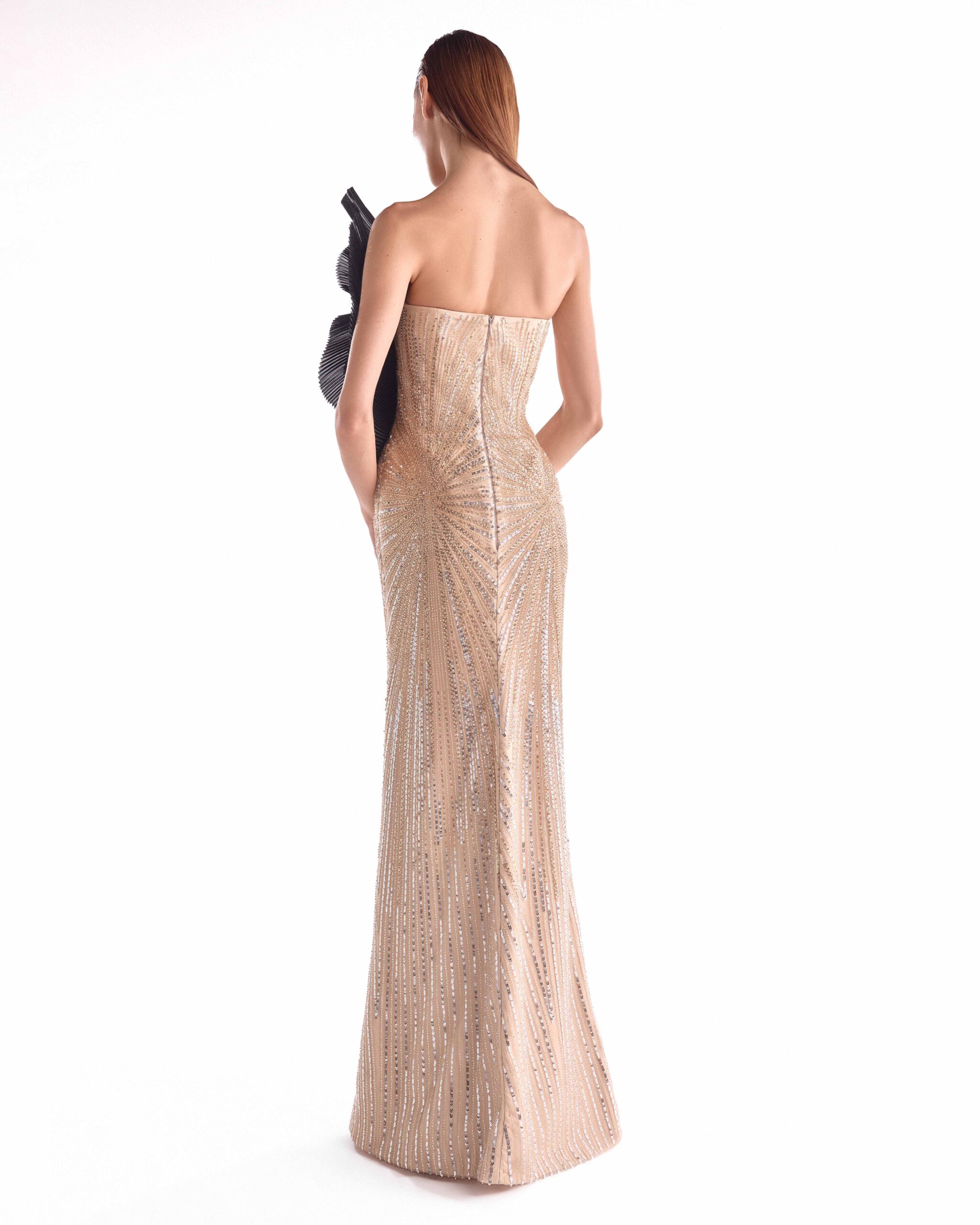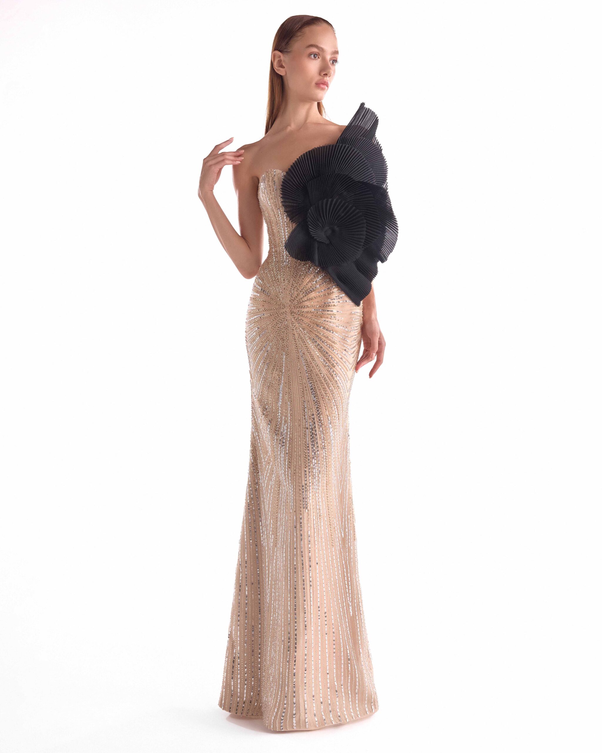 Shimmering gold strapless gown with radiant sequin embroidery and a sculptural black pleated shoulder bloom.