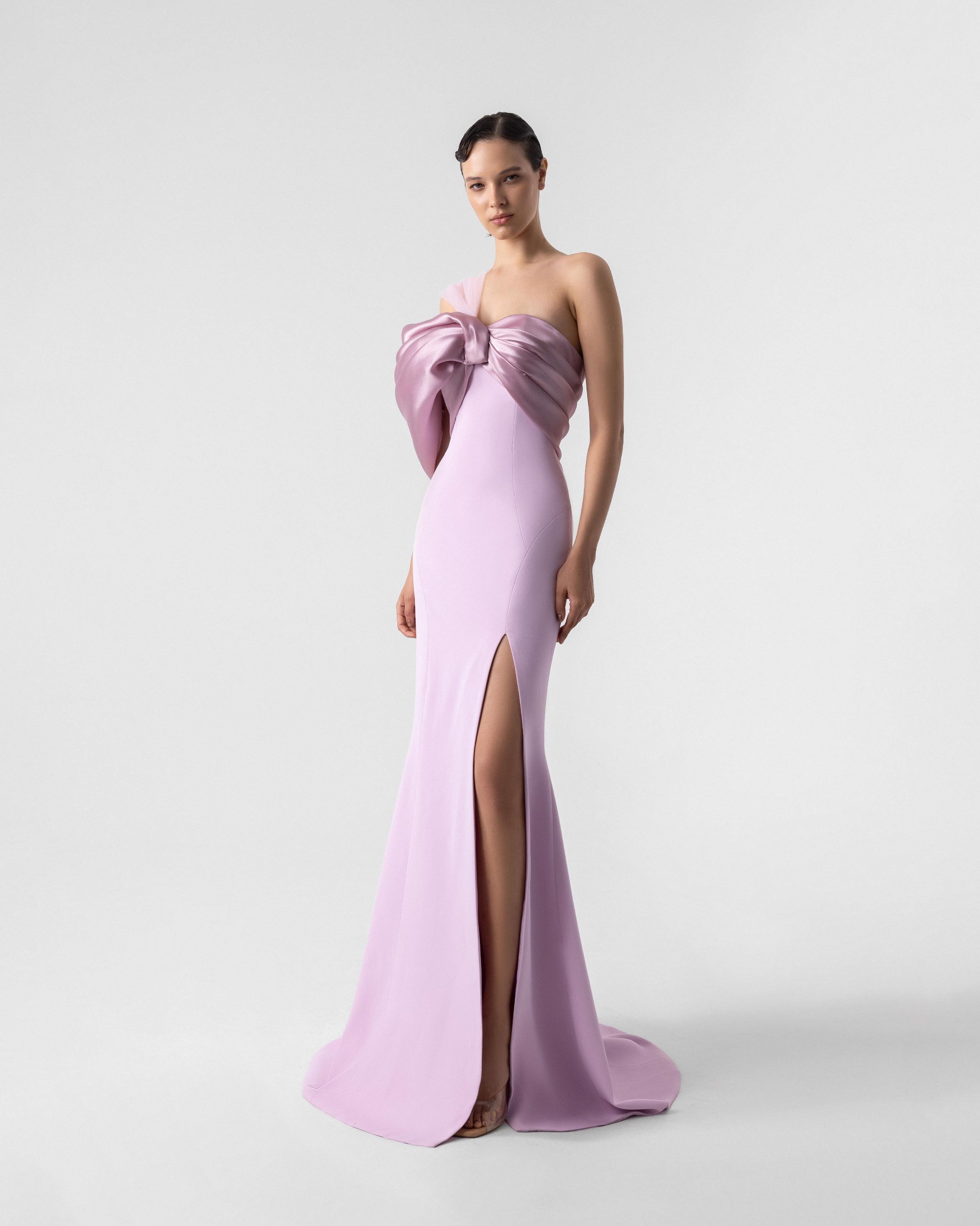 Featuring a sweet, charming one-sided off-shoulder in satin organza, this old rose off-shoulder gown is delicately complemented by tulle couture and a sophisticated slit.