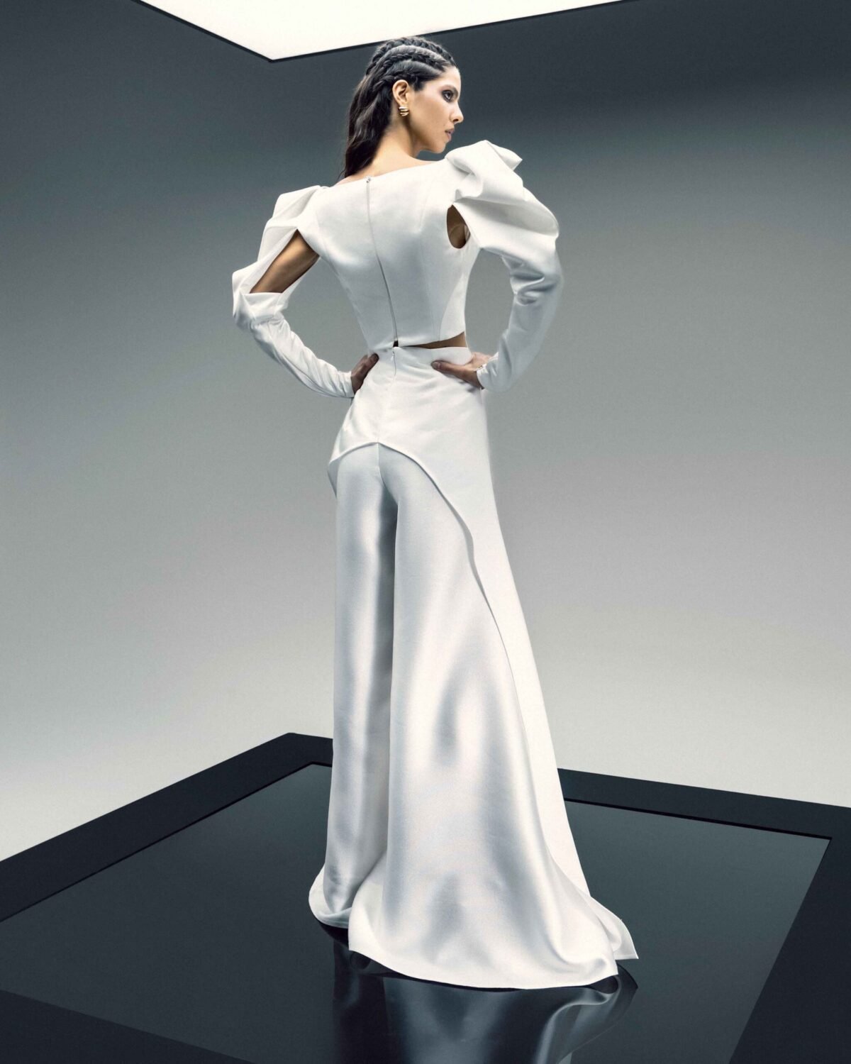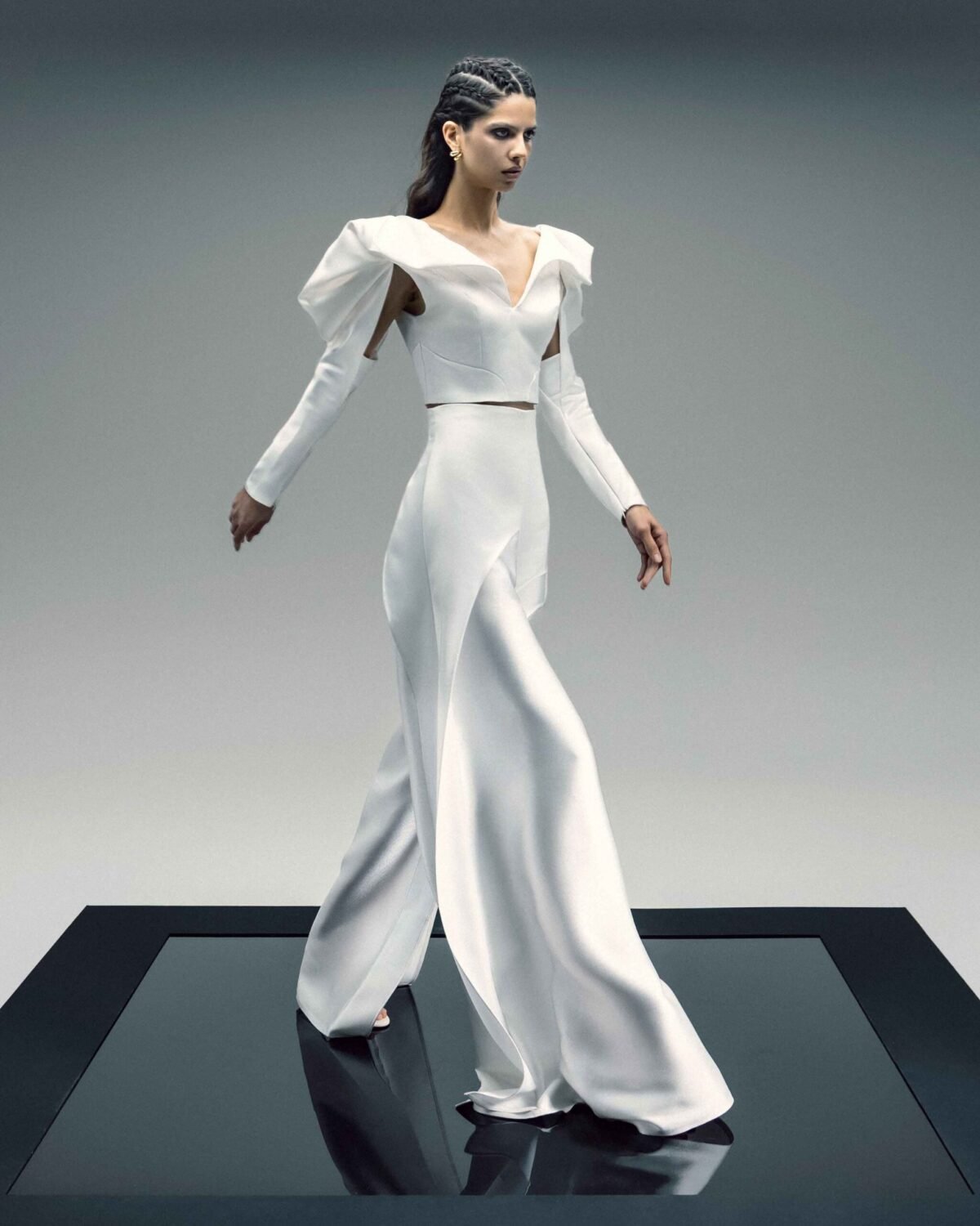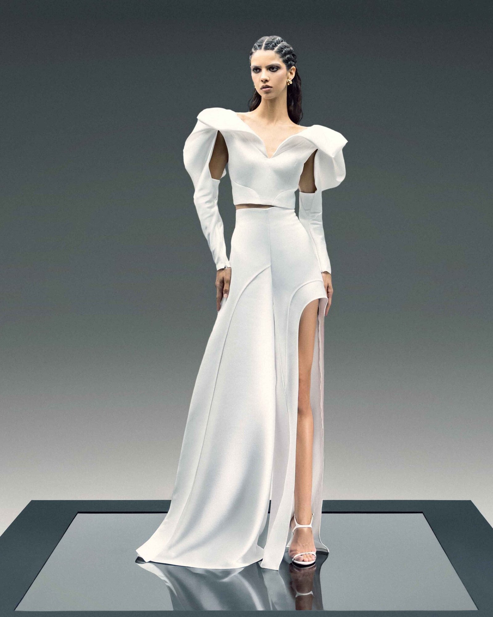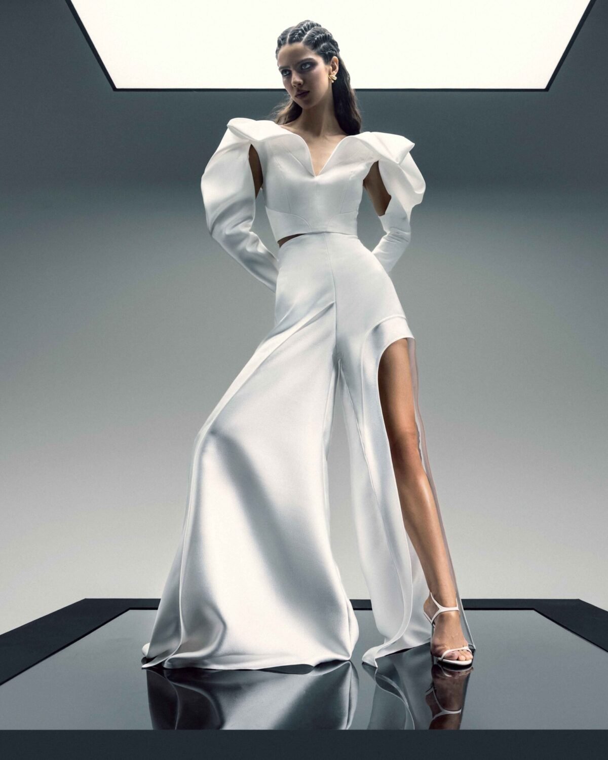 This Luxurious off-white Mikado piquê trousers features wide legs with one slitted side, blending elegance with contemporary design.