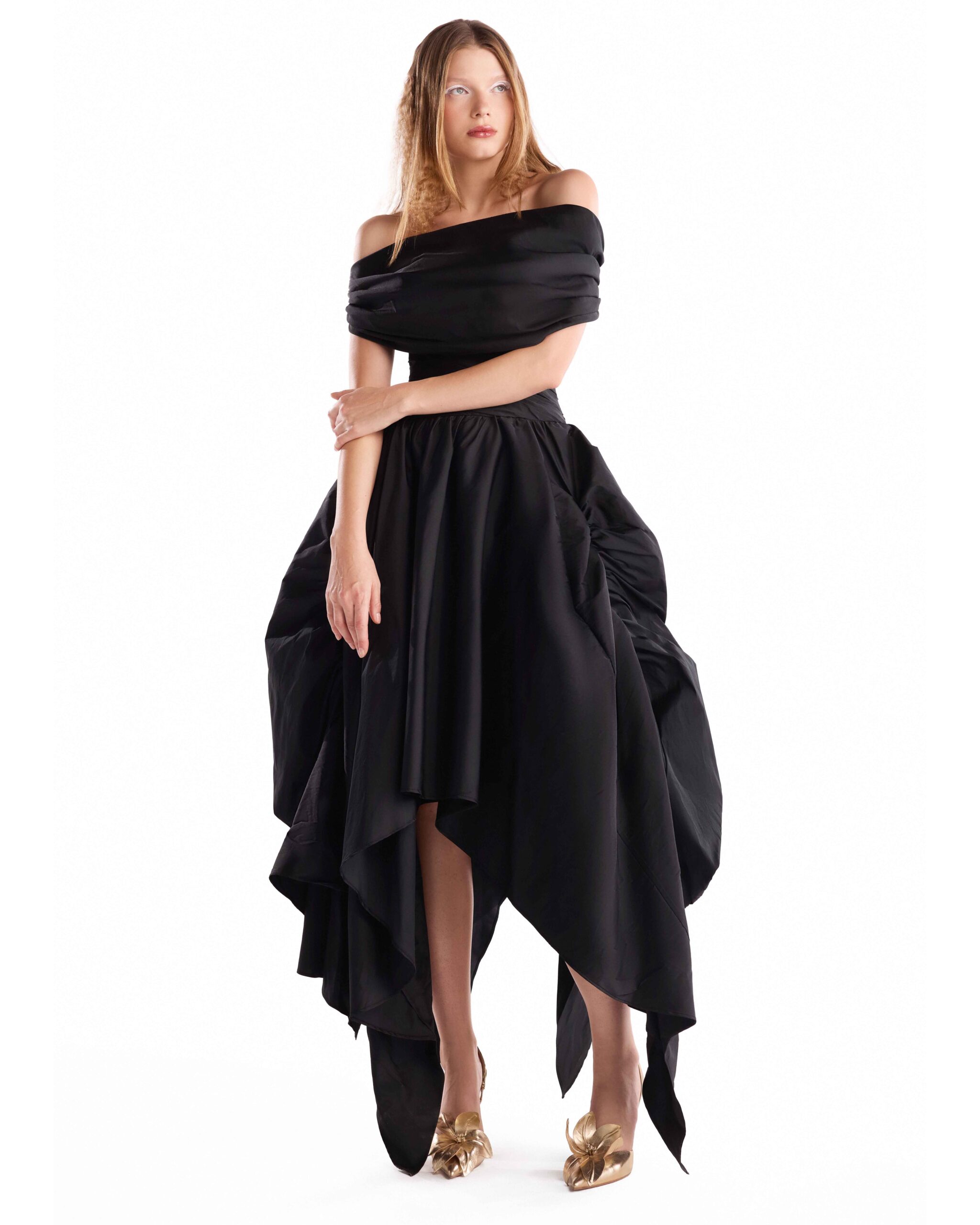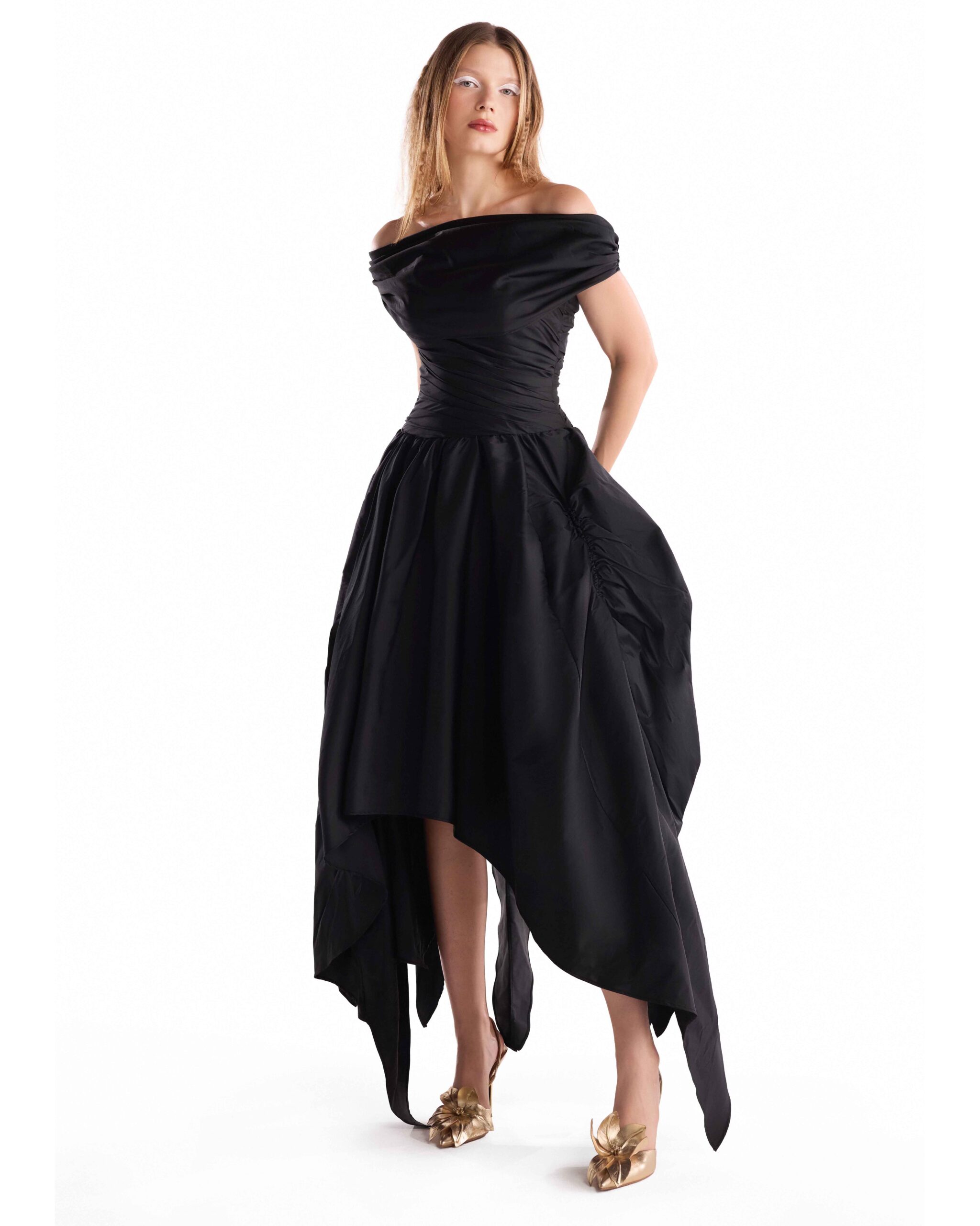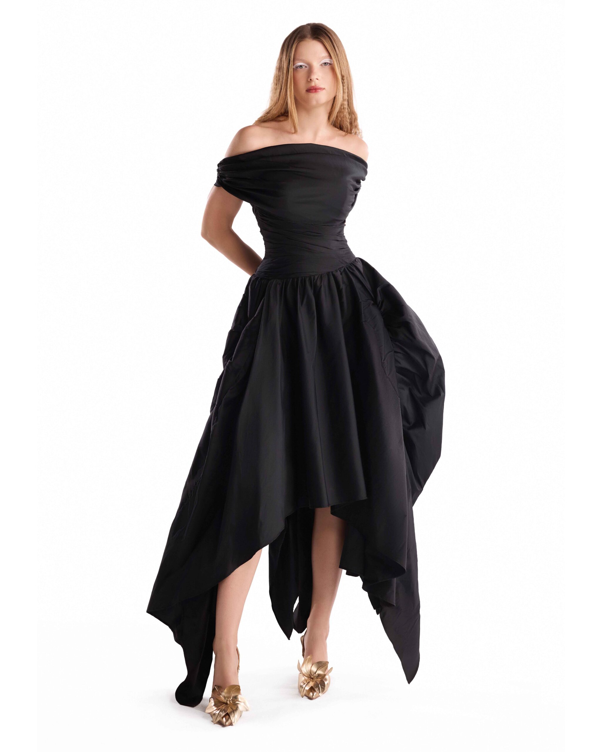 Crisp black taffeta brings architectural volume to this off-shoulder silhouette, softly draped across the neckline and sculpted through the bodice. An asymmetric hemline unfolds into fluid layers, creating movement and contrast between structure and lightness. Elegant yet expressive, the design captures modern evening sophistication.