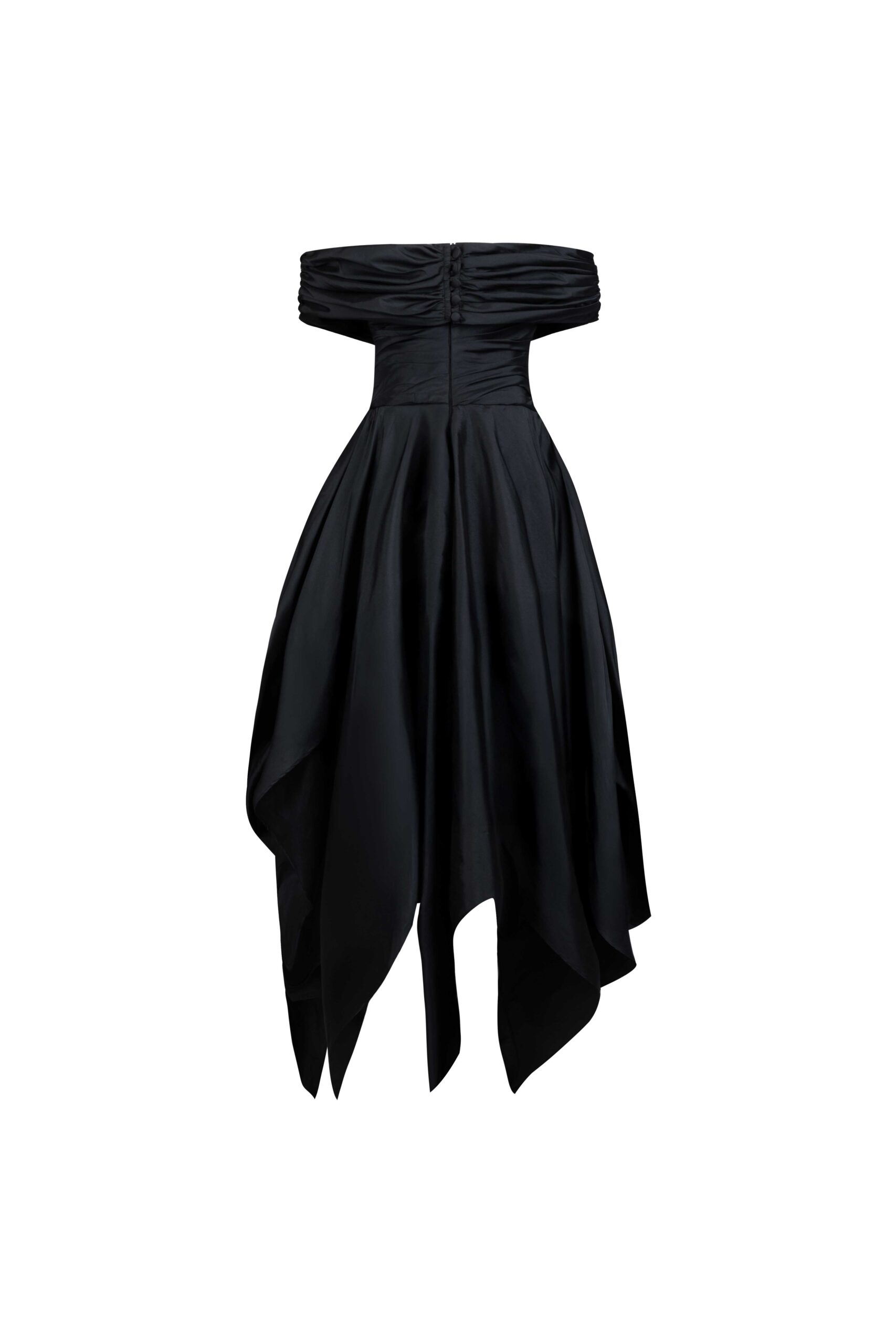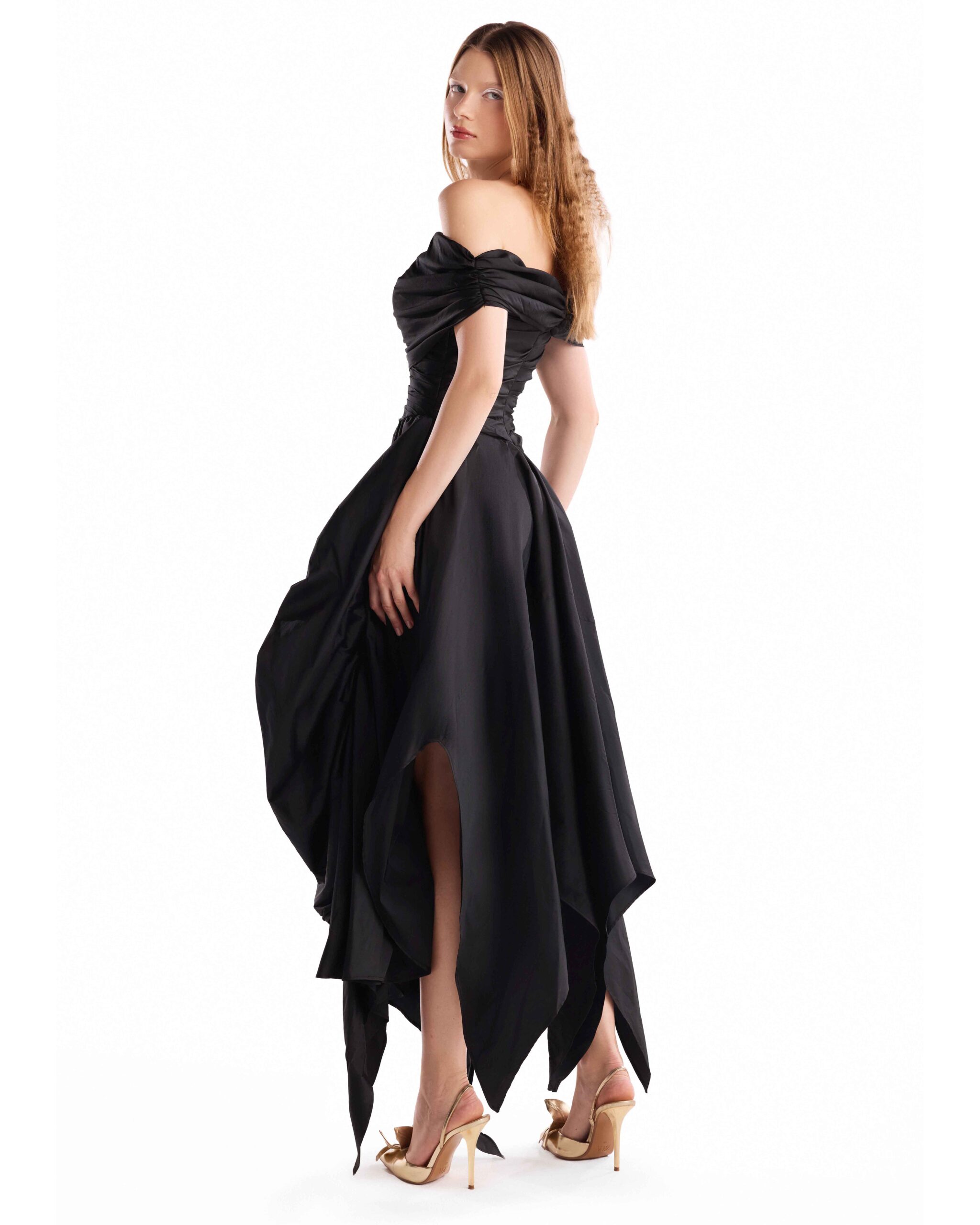 Asymmetric Hem Black Taffeta Off-Shoulder Dress