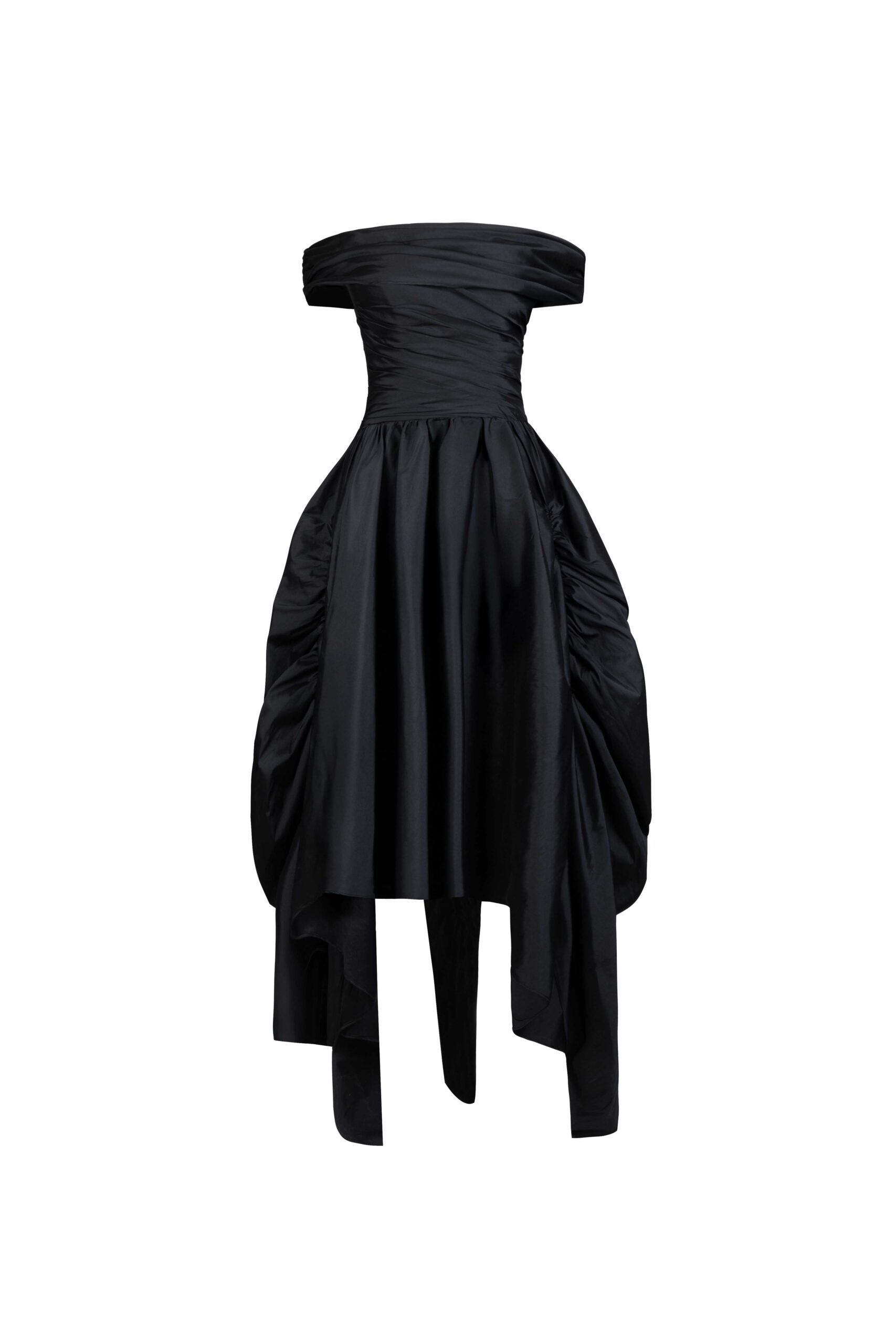 Elegant off-shoulder black taffeta dress featuring sculpted draping and an asymmetric flowing hem.