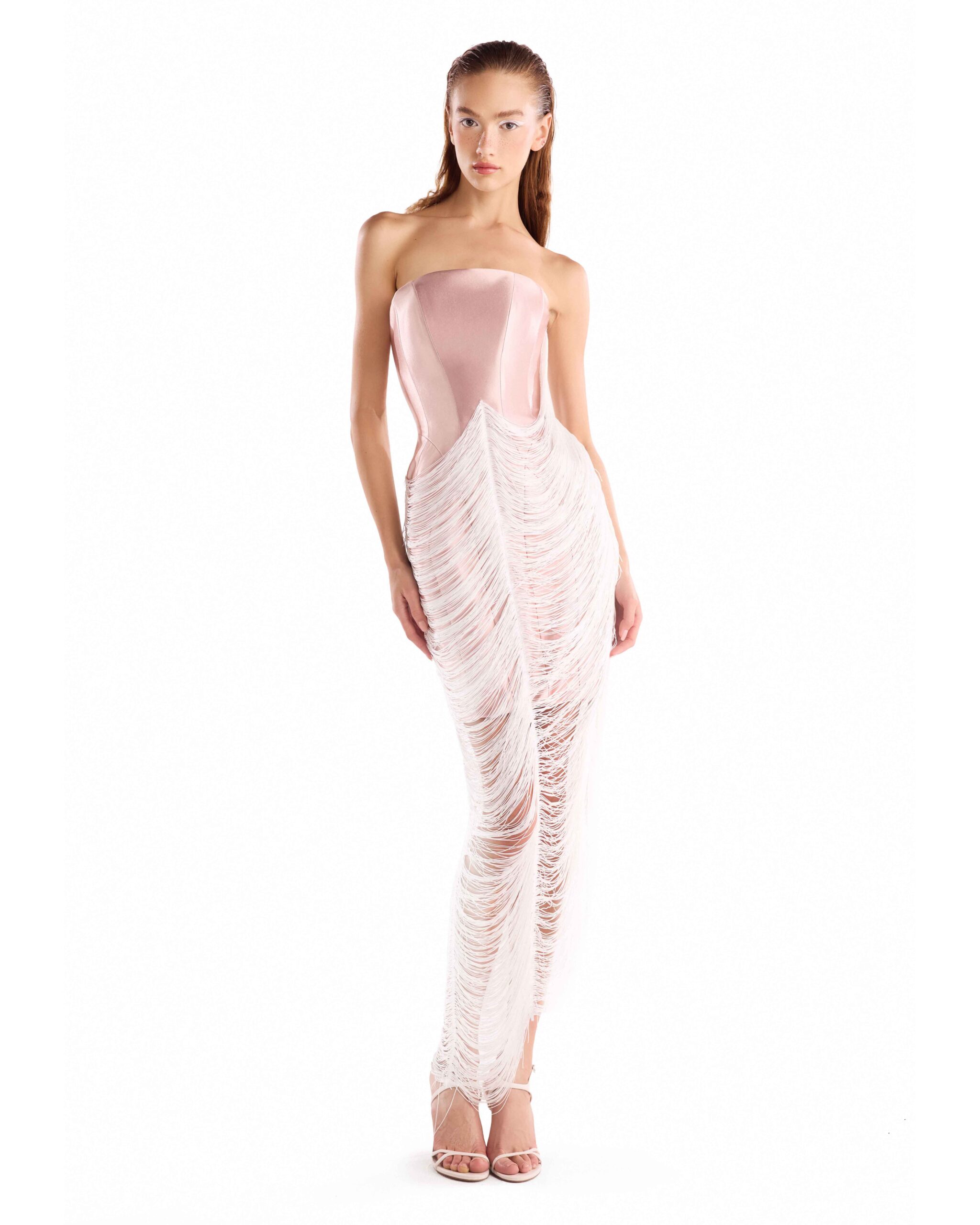 Strapless pink razmir dress accented with cascading rope draping for a striking balance of structure and fluidity.