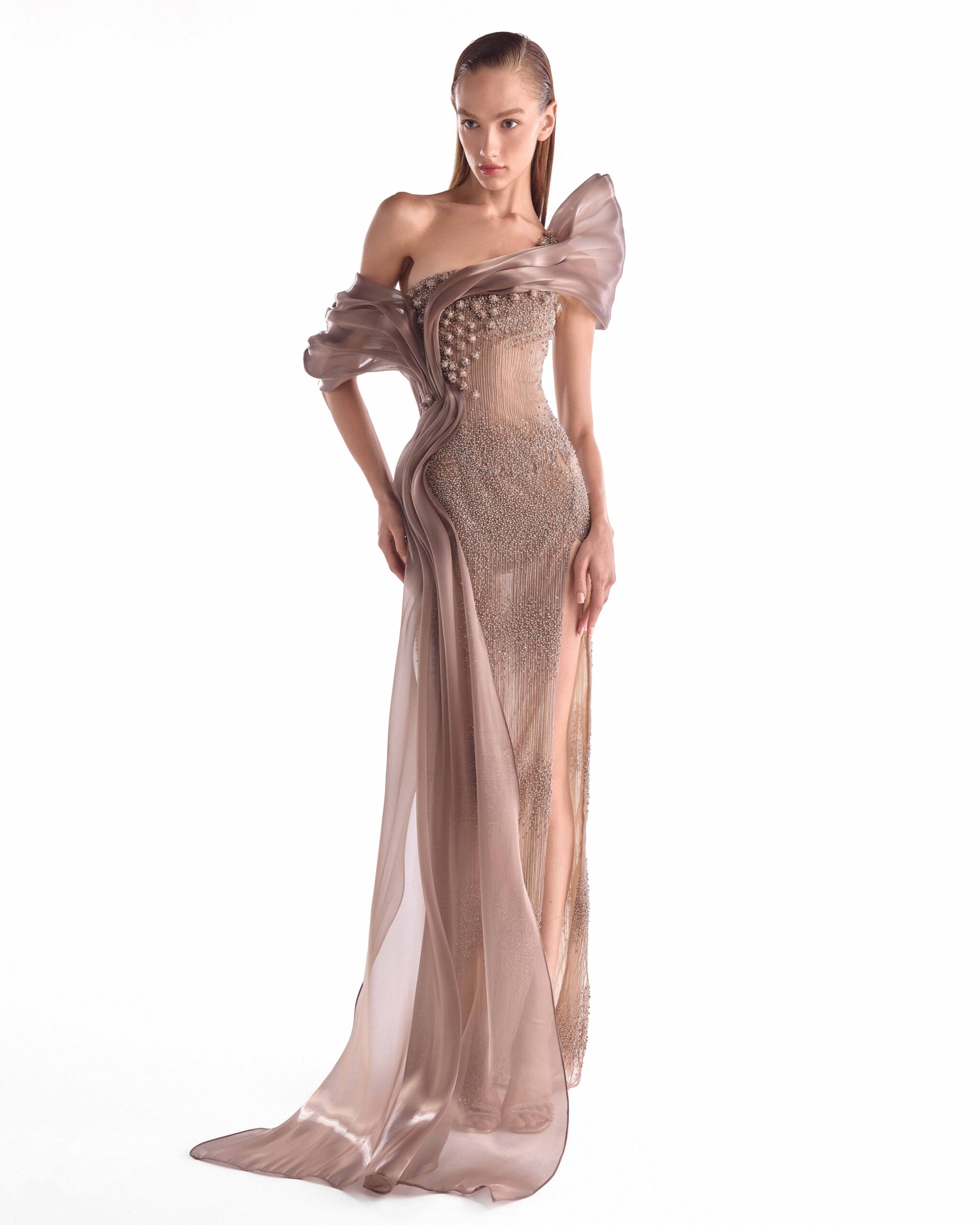 Indulge in refined elegance with this sculptural one-shoulder gown crafted on a sheer illusion base, enriched in warm brown tones. Intricate lace embroidery is delicately adorned with pearls and fine crystals, creating depth, texture, and a soft luminous finish. Fluid organza draping flows asymmetrically across the bodice, sculpting the silhouette and extending into an elegant side train. The fitted column shape enhances the waist and hips, while a high side slit introduces a subtle yet sensual edge.