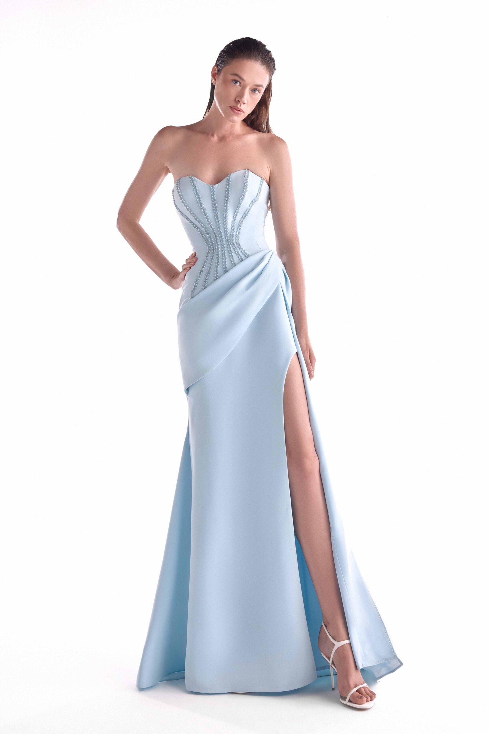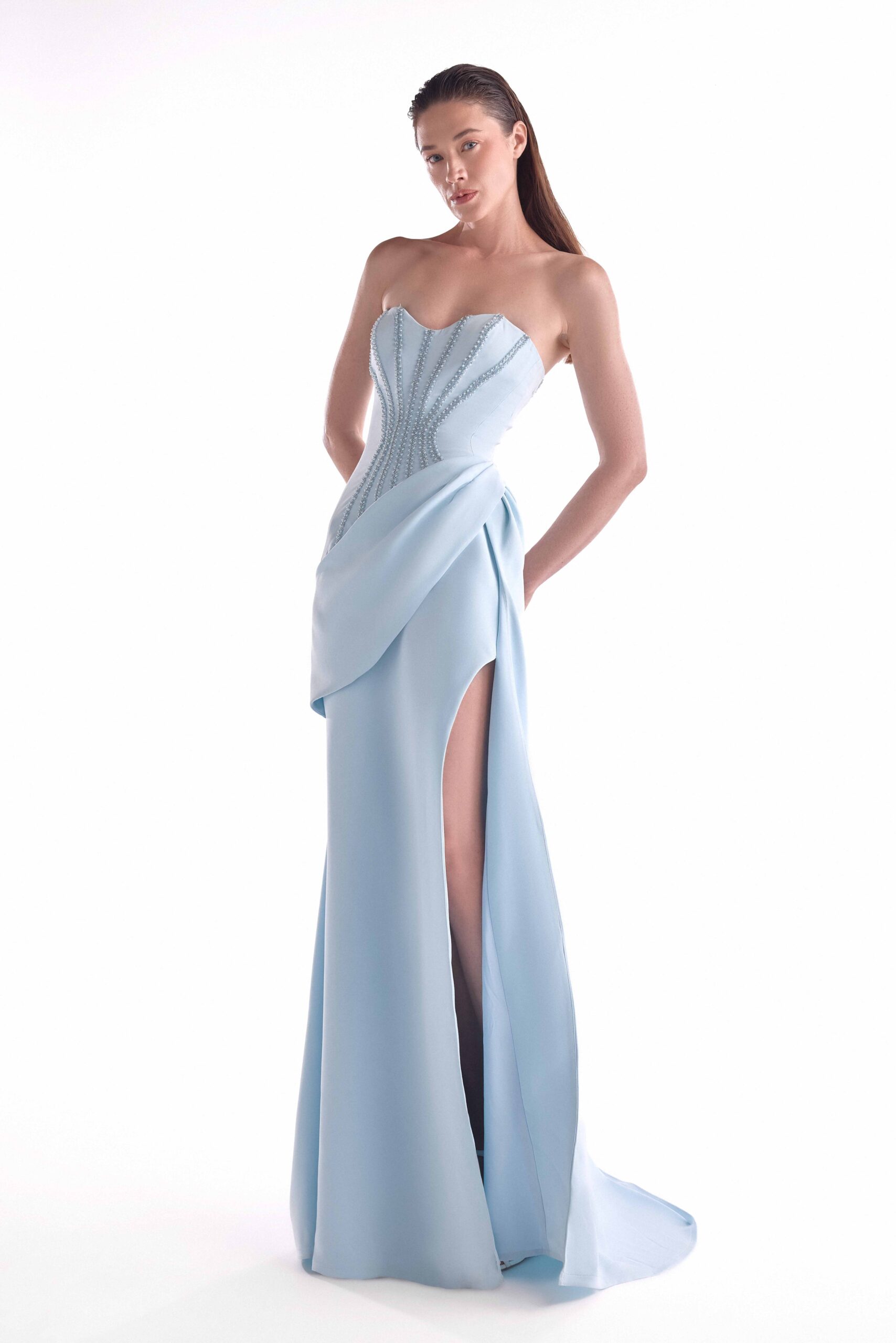 Radiant ice blue gown with beaded contouring and a fluid draped side panel that softens its high-slit silhouette.